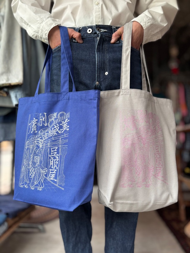 お店のお知らせとして、描き始めた自作の絵を採用しました。着物はハート柄と、迷彩柄。近年リバイバルしたY2Kと、西洋化される前の街を組み合わせました。 しっかりした厚手のキャンバス生地。レコード、A4スケッチブック、水筒が収まるマチつき。まぶされた光沢が良い塩梅です。 【 SIZE 】 横36cm × 縦37cm × 奥行き11cm 【 PRINT COLOR 】 BLUE : METALLIC SILVER GRAY : METALLIC PINK