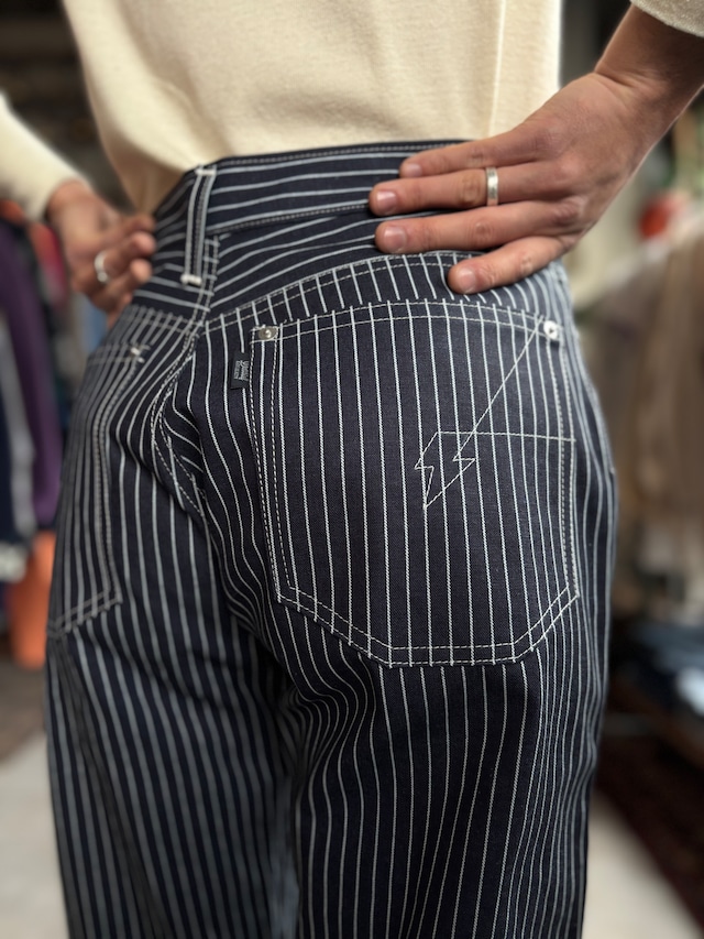 スタンダードな5ポケットデニムですが、細身のシルエットに仕上げつつアクティブシーンでの動きやすさを追求したパターンワークになっています。 細身のデニムはストレッチ生地を採用するのが現在の主流となっていますが、こちらはノンストレッチ生地。 『今回コラボする相手が古着屋ということもあり、クラシックなノンストレッチにこだわりたい。更に、音楽を感じられる細身のシルエットに仕上げたい。それでいて、スケートをしている時やバイクに乗った時の窮屈さは軽減したい』 この、『こだわり』というよりも『ワガママ』に近いデザインプロセスから生まれたデニムパンツです。 見た目はよくあるデニムパンツ。履いてわかる動きやすさ。 通常、フロントポケットはスレキと呼ばれる薄手の生地が使われます。これは商品のコストを下げる為や、生地がゴワついたり服のシルエットが崩れないようにするのが目的ですが、こちらのパンツは全てデニム仕上げ。 デニムの魅力の一つとして、いわゆるアタリと言われる生地の経年変化があります。 全てデニム生地で仕上げている為、生地が厚い分、内側の袋状のポケットの形がアタリとして出やすくなります。 デニムパンツを長く愛用する面白さをBEAGLEの商品から再認識してほしいという計らいと、デニムパンツは本来、高い耐久性が求められる物ではないかというデザイナー自身の再解釈から採用。 ポケットのシルエットに動きを付けて、スタンダードなデニムパンツに違和感のある遊び心をプラス。 BEAGLEオーナーの希望から、TPP( TAILOR POP & PUNKS )を象徴する稲妻をバックポケットの飾りステッチに採用。 左右のポケットを非対称にデザインし、稲妻からステッチが上下左右に伸びていますが、これは、『古着屋という枠に収まらないショップ』という、WF.デザイナーTIPSから見たBEAGLEの世界感を表現しています。 今作は岡山産インディゴデニムとスラブ織りデニム、インディゴヒッコリーデニムの3種類。 【CONDITION】 新品商品です。 【MATERIAL】 COTTON 【SIZE】 M(32×31) / L(35×31) ウエスト 約78~81cm / 84~87cm レングス 約78cm / 約78cm ※すべての商品は洗濯・メンテナンスを行い、着用に差し支えないと判断したコンディションの商品のみ出品しておりますが、ダメージの見落としがある可能性もございます。細心の注意を払って掲載しておりますが、更に確認したい点がある場合はご注文前に必ずメールにてお問い合わせ下さい。色褪せや些細な汚れに関しましてはヴィンテージ古着特有の風合いになりますので、古着の特性をご理解、ご了承頂いた上でのご注文をお願い致します。なお、ご注文後のキャンセル、返品(返金)は受け付けておりません。予めご了承下さいませ。