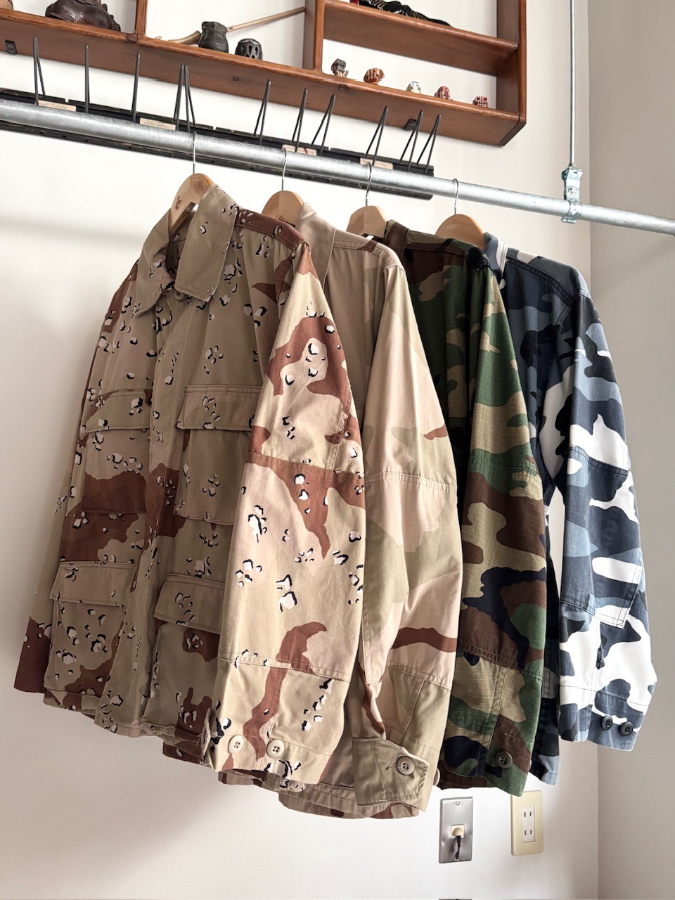 本日のレコメンはARMYジャケットです。レギュラーのBDUを着ないやつなんてモグリだろと思うほど、マスターピースの地位をほしいままにする一品。どれも4ポケスタイルに、ドライな coton × nylon クロス。1キロ先からでも出来るやつが来たと思わせるカモフラパターンです。玄関に掛けておいたり、助手席に置き服したり、防犯上の観点からも良さそうです。詳細はオンラインからご確認くださいませ。
