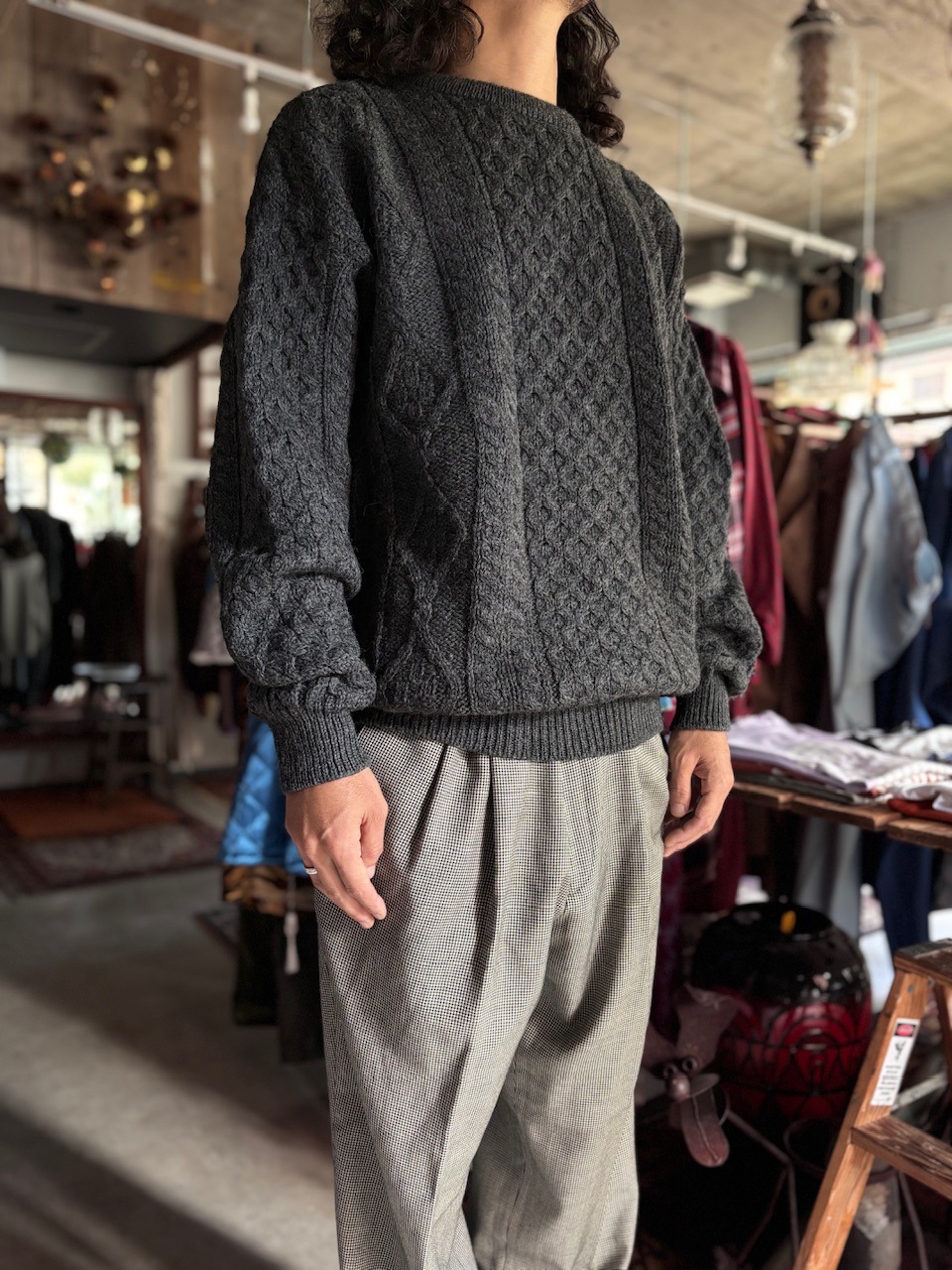 本日もオンライン掲載商品よりアランニットをピックアップしてご紹介します。漁師の労働着としてのルーツを持ち、ケーブルパターンとハニカム状の編模様を基調としたトラディショナルなルックスは、古着のニットの中でもひとつ抜けた汎用性を持っています。自分自身、10代の頃から長年着続けているアイテムで、ぜひたくさんの方にお試し頂きたいマスターピースのひとつです。