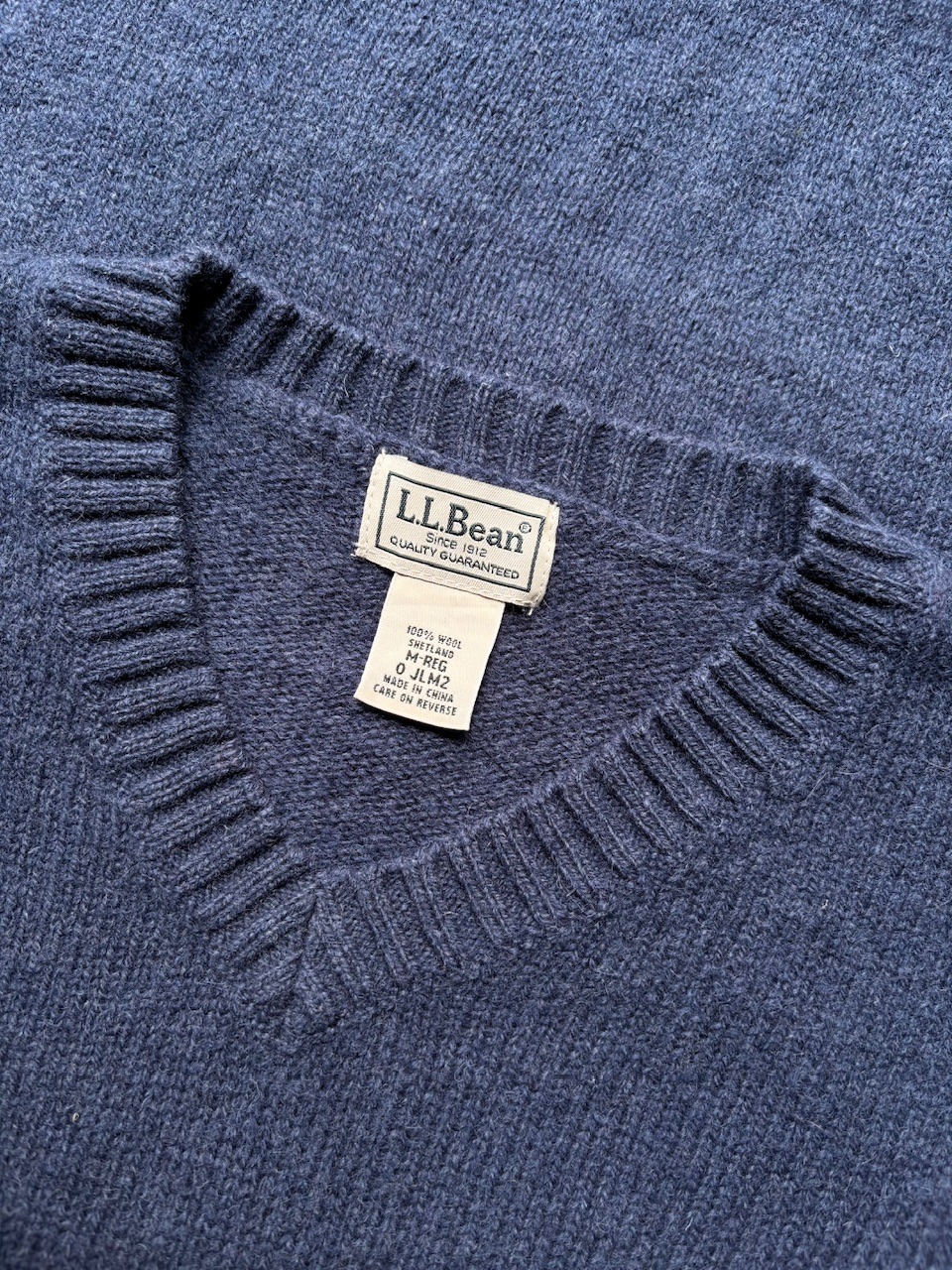 2着目はインディゴカラーのシェットランドセーター。一世紀以上の歴史を持つブランドらしいシンプルかつオーセンティックな雰囲気が魅力です。首周りが綺麗に見える浅めのVネックは、着こなしの変化を付けたいときにもおすすめです。
