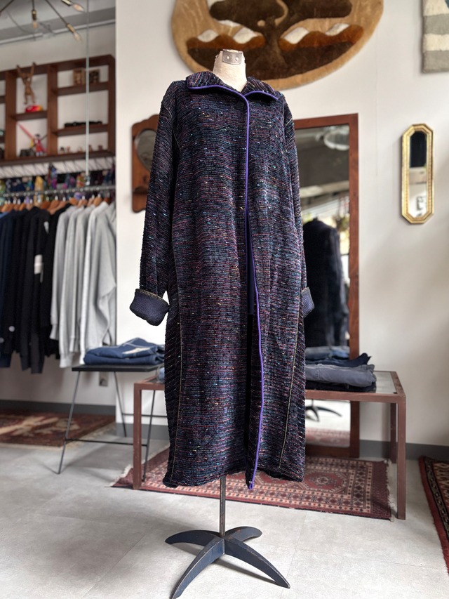 ウールmixのツイード素材と推定。リラックスフィット。手の込んだファブリックです。 【CONDITION】 背面の一部にうっすら変色。(画像6枚目)多少の着用感はございますが、着用に支障のある大きなダメージはございません。 (あくまで中古衣料ですので、記載していない小穴や小傷などがある場合がございますが、ヴィンテージ衣料の風合いとして捉えて頂ける方のご購入をお願い致します。) 【MATERIAL】 不明 【SIZE】 身幅 約57cm 着丈 約107cm ※すべての商品は洗濯・メンテナンスを行い、着用に差し支えないと判断したコンディションの商品のみ出品しておりますが、ダメージの見落としがある可能性もございます。細心の注意を払って掲載しておりますが、更に確認したい点がある場合はご注文前に必ずメールにてお問い合わせ下さい。色褪せや些細な汚れに関しましてはヴィンテージ古着特有の風合いになりますので、古着の特性をご理解、ご了承頂いた上でのご注文をお願い致します。なお、ご注文後のキャンセル、返品(返金)は受け付けておりません。予めご了承下さいませ。