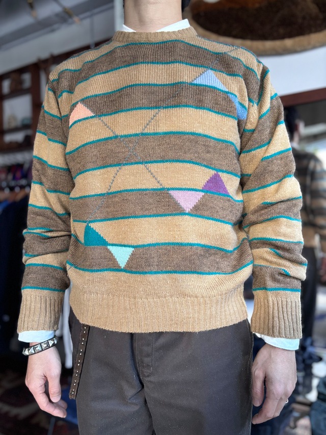 中厚のアクリル素材。オーセンティックフィット。レトロな80sカラーが可愛いです。 【CONDITION】 多少の着用感はございますが、着用に支障のある大きなダメージはございません。 (あくまで中古衣料ですので、記載していない小穴や小傷などがある場合がございますが、ヴィンテージ衣料の風合いとして捉えて頂ける方のご購入をお願い致します。) 【MATERIAL】 ACRYLIC POLYESTER 【SIZE】 表記 M 身幅 約60cm 着丈 約60cm ※すべての商品は洗濯・メンテナンスを行い、着用に差し支えないと判断したコンディションの商品のみ出品しておりますが、ダメージの見落としがある可能性もございます。細心の注意を払って掲載しておりますが、更に確認したい点がある場合はご注文前に必ずメールにてお問い合わせ下さい。色褪せや些細な汚れに関しましてはヴィンテージ古着特有の風合いになりますので、古着の特性をご理解、ご了承頂いた上でのご注文をお願い致します。なお、ご注文後のキャンセル、返品(返金)は受け付けておりません。予めご了承下さいませ。