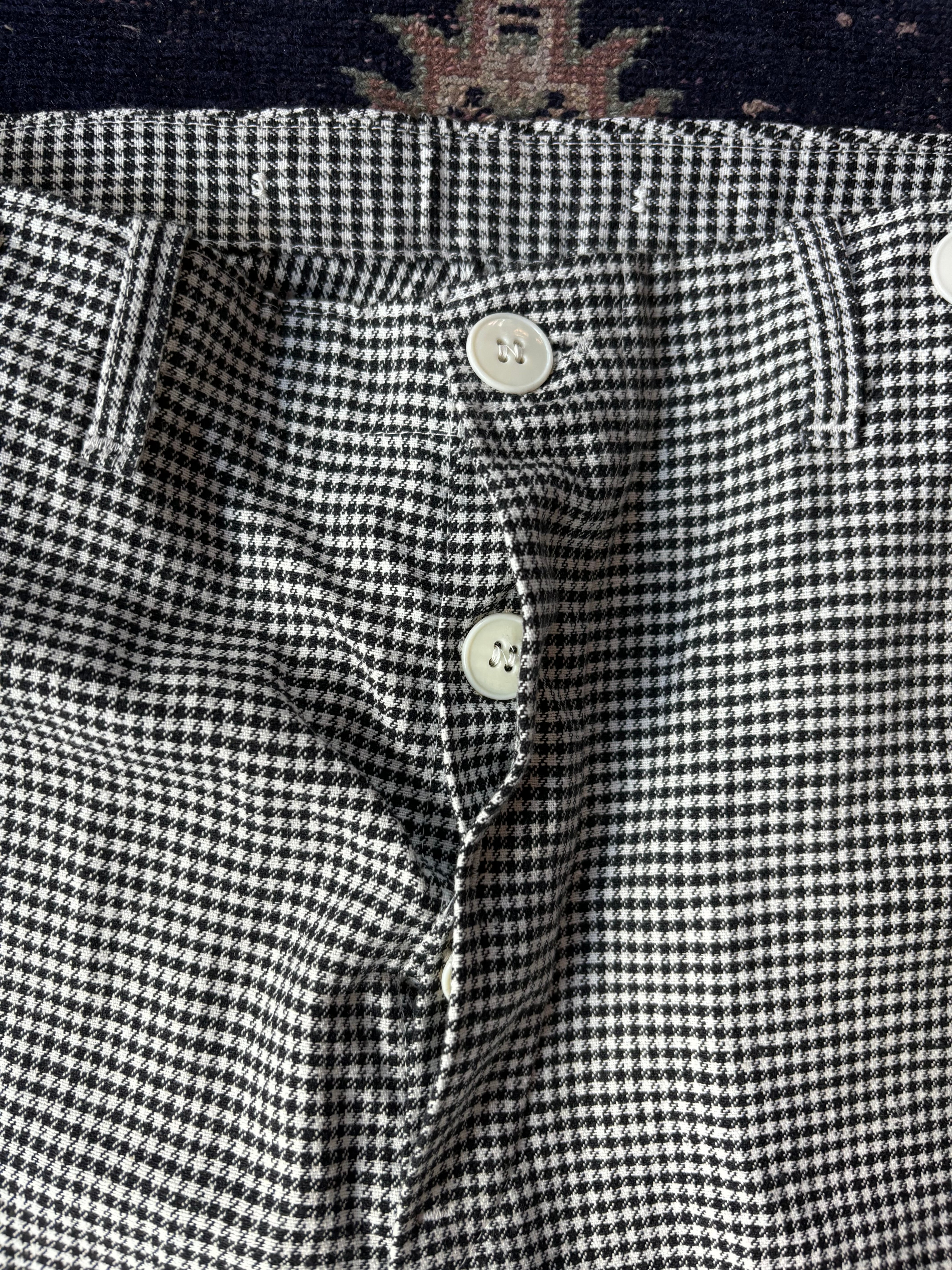 しっかりした厚みのコットン素材。柔らかめの生地感。中太のストレートシルエット。ボタンフライに、サスペンダーボタン付き。細かな千鳥柄ファブリックが上品なワークパンツ。(サイズ2種類あります)
