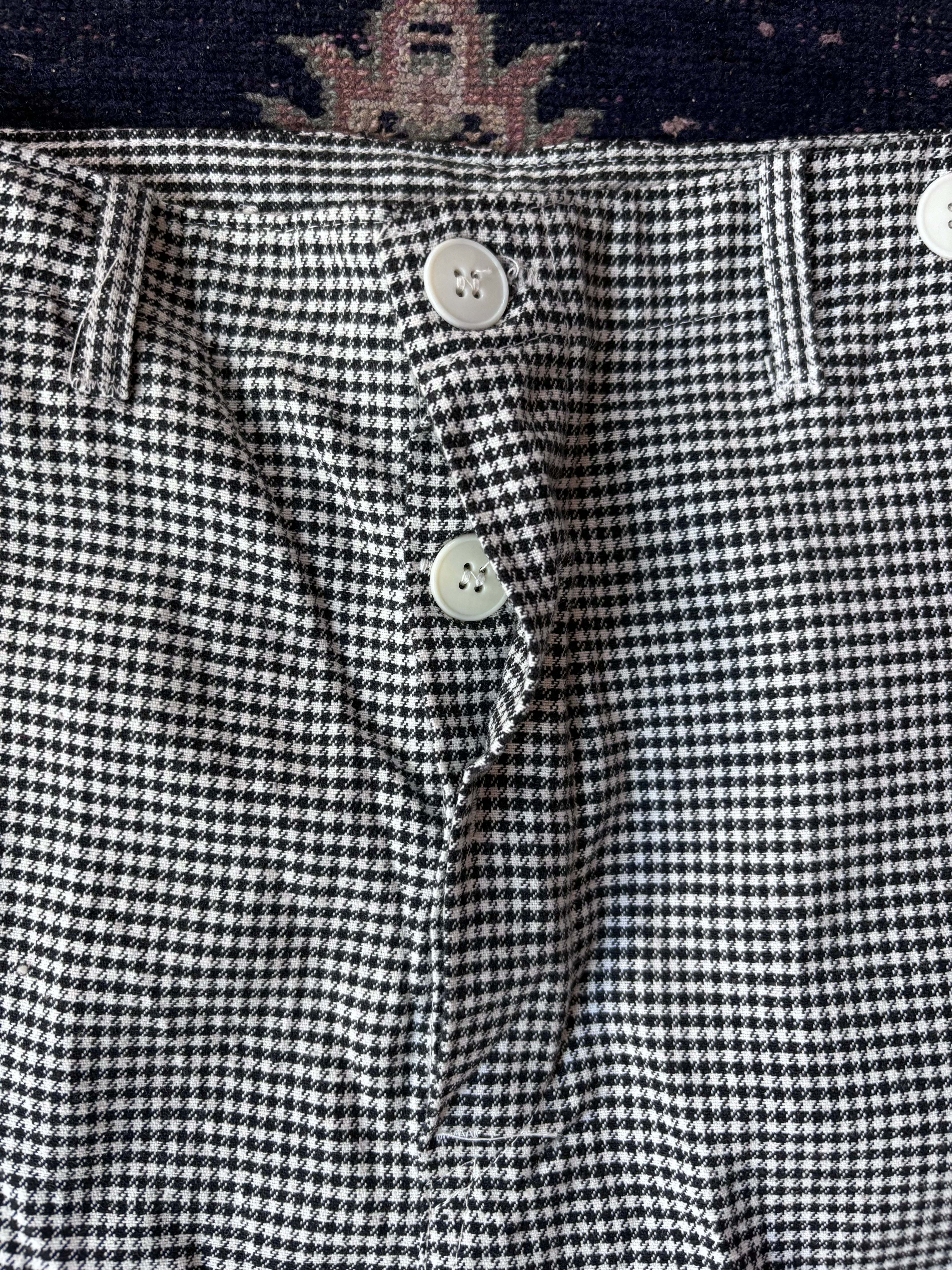 しっかりした厚みのコットン素材。柔らかめの生地感。中太のストレートシルエット。ボタンフライに、サスペンダーボタン付き。細かな千鳥柄ファブリックが上品なワークパンツ。(サイズ2種類あります)