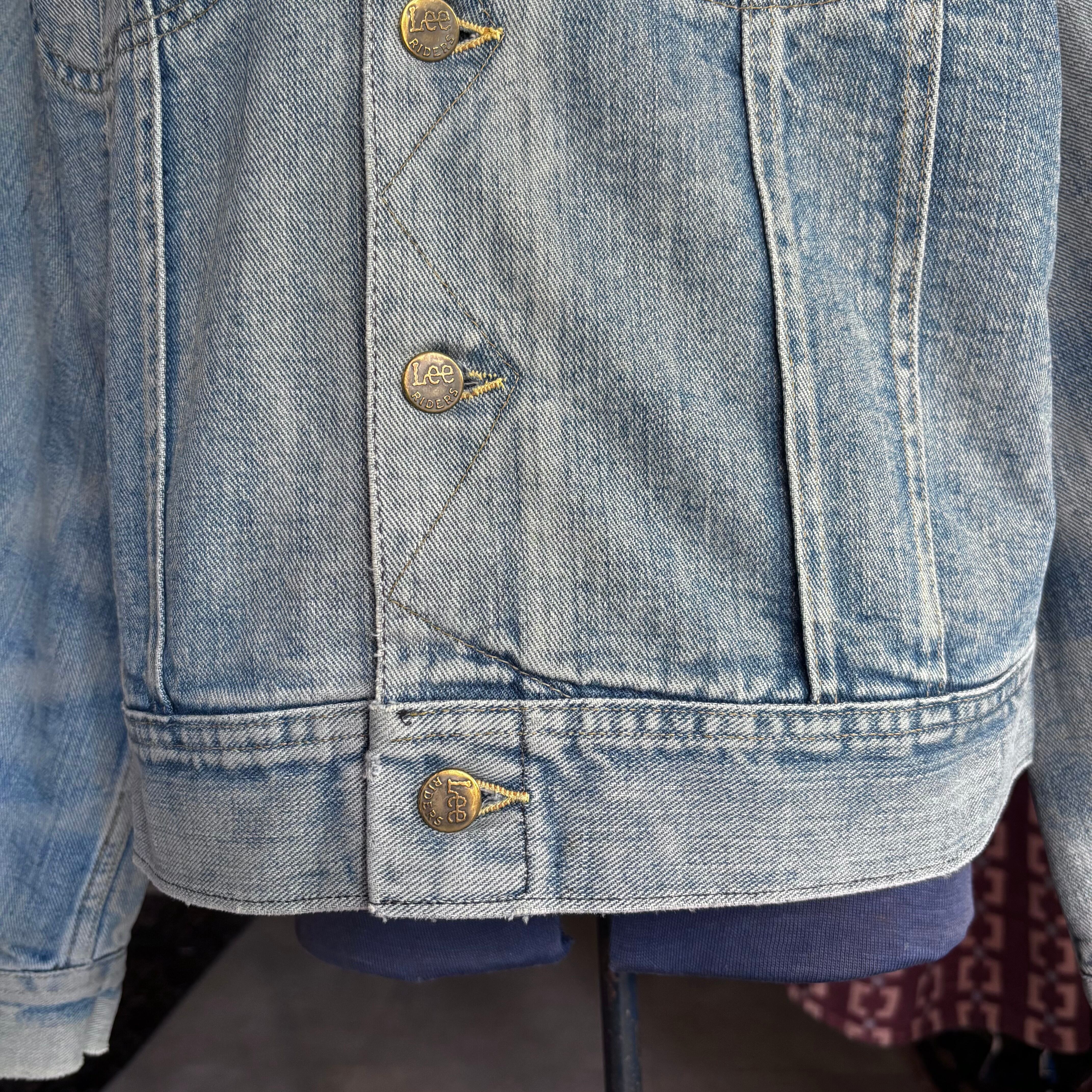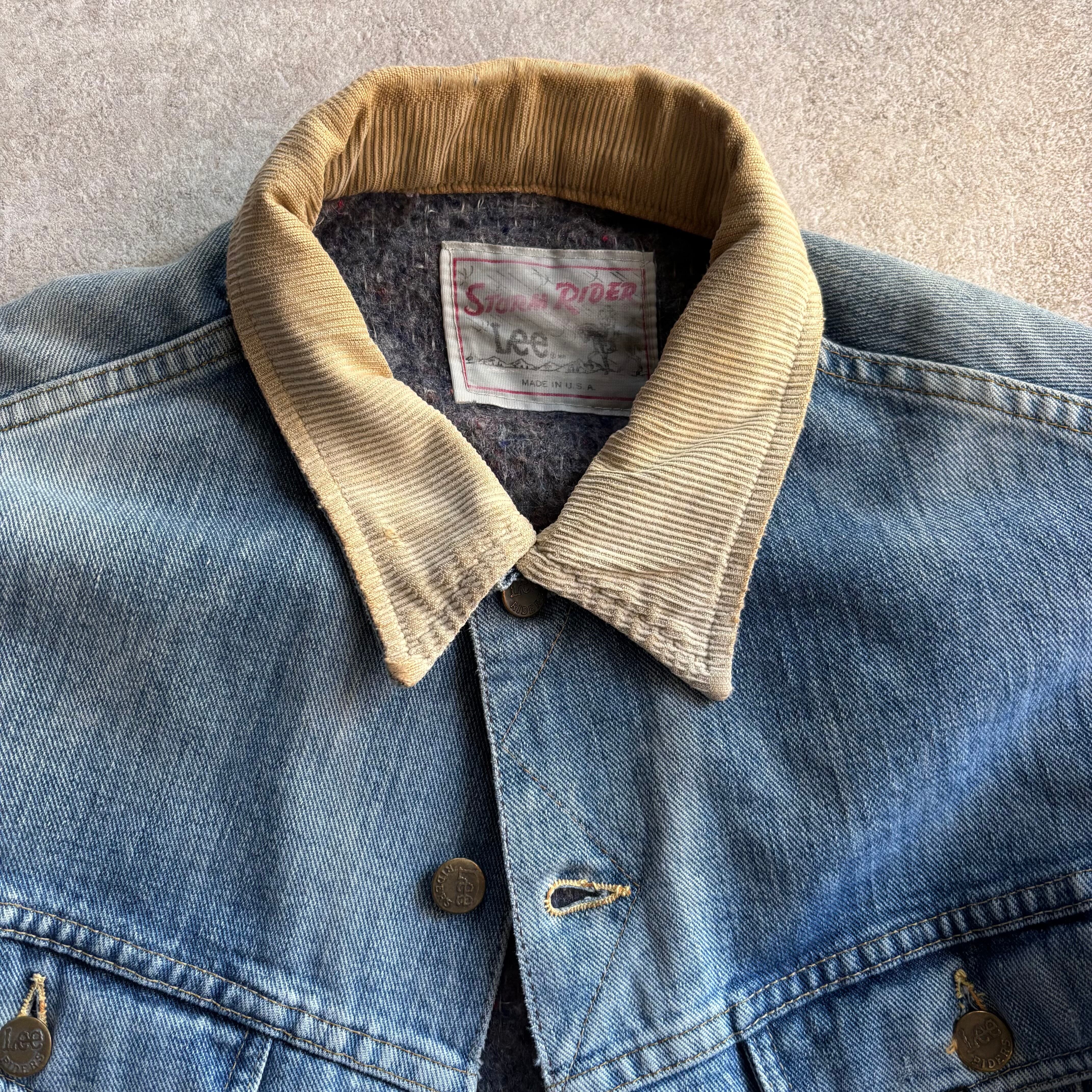 デニム生地に、内側にはブランケットライナー付きのLEE Stormrider。オーセンティックフィット。猫目ボタンのサイドアジャスターに、MADE IN USA表記が入る early 80sモデル。90s以降のモデルと比べてビンテージ感のある生地。