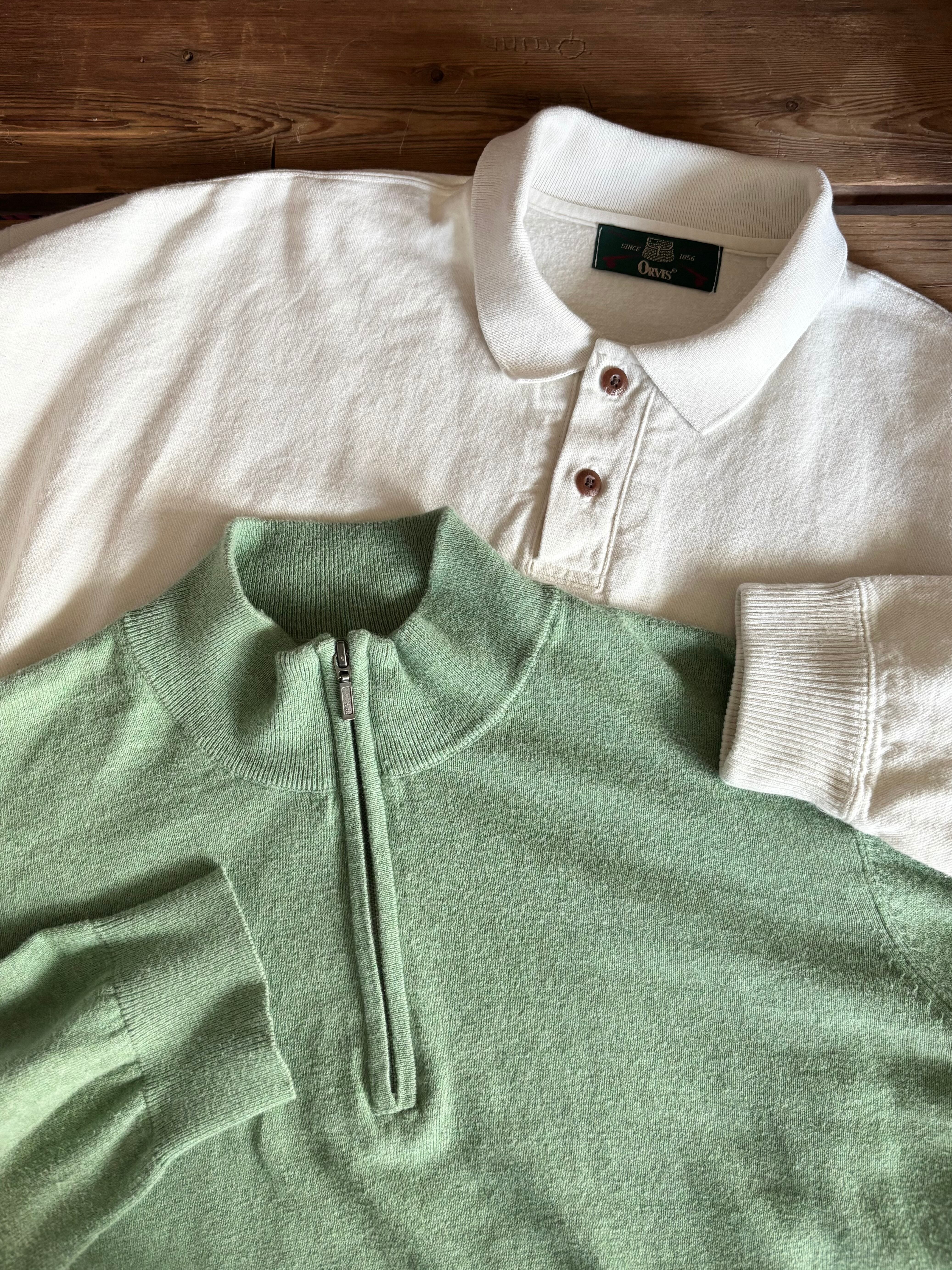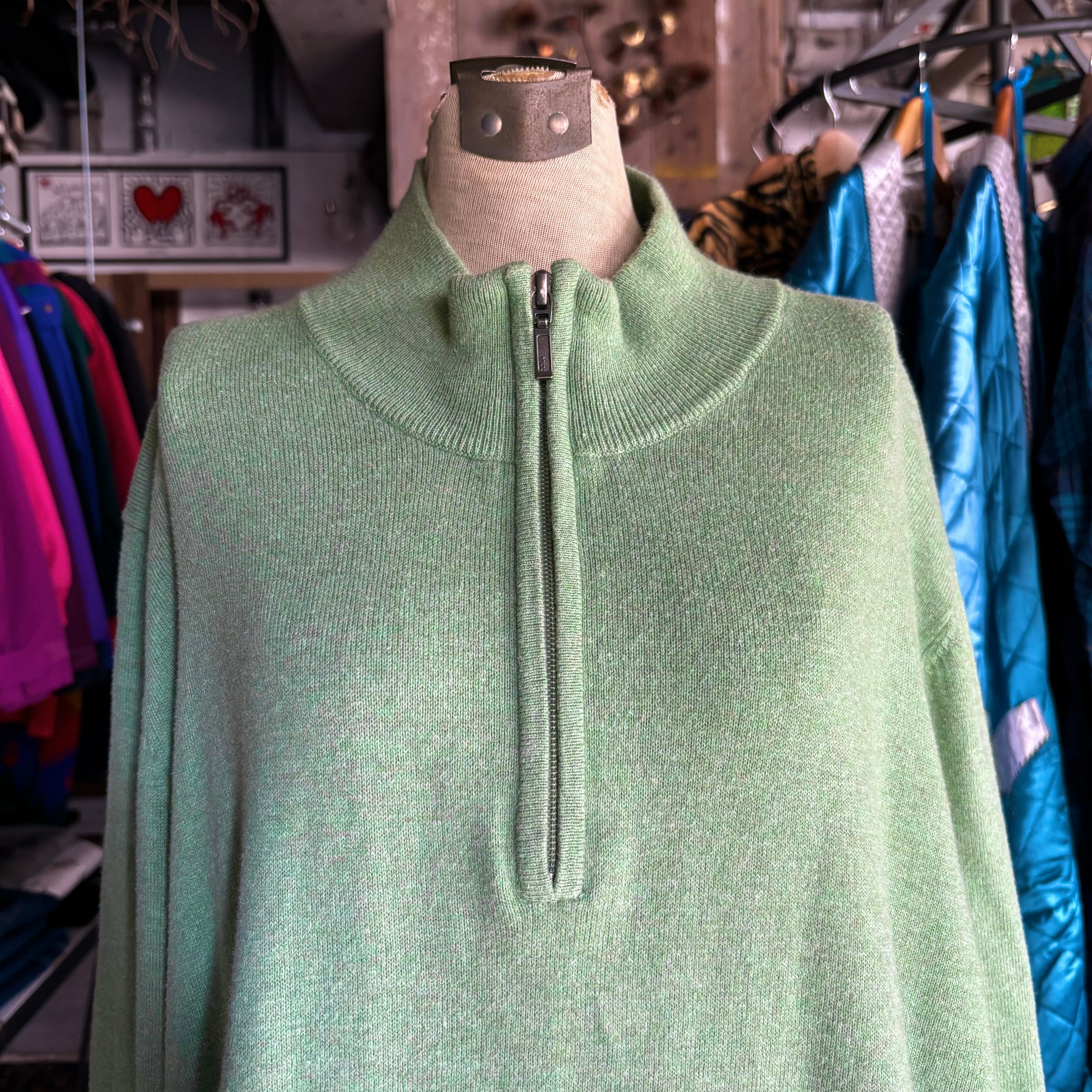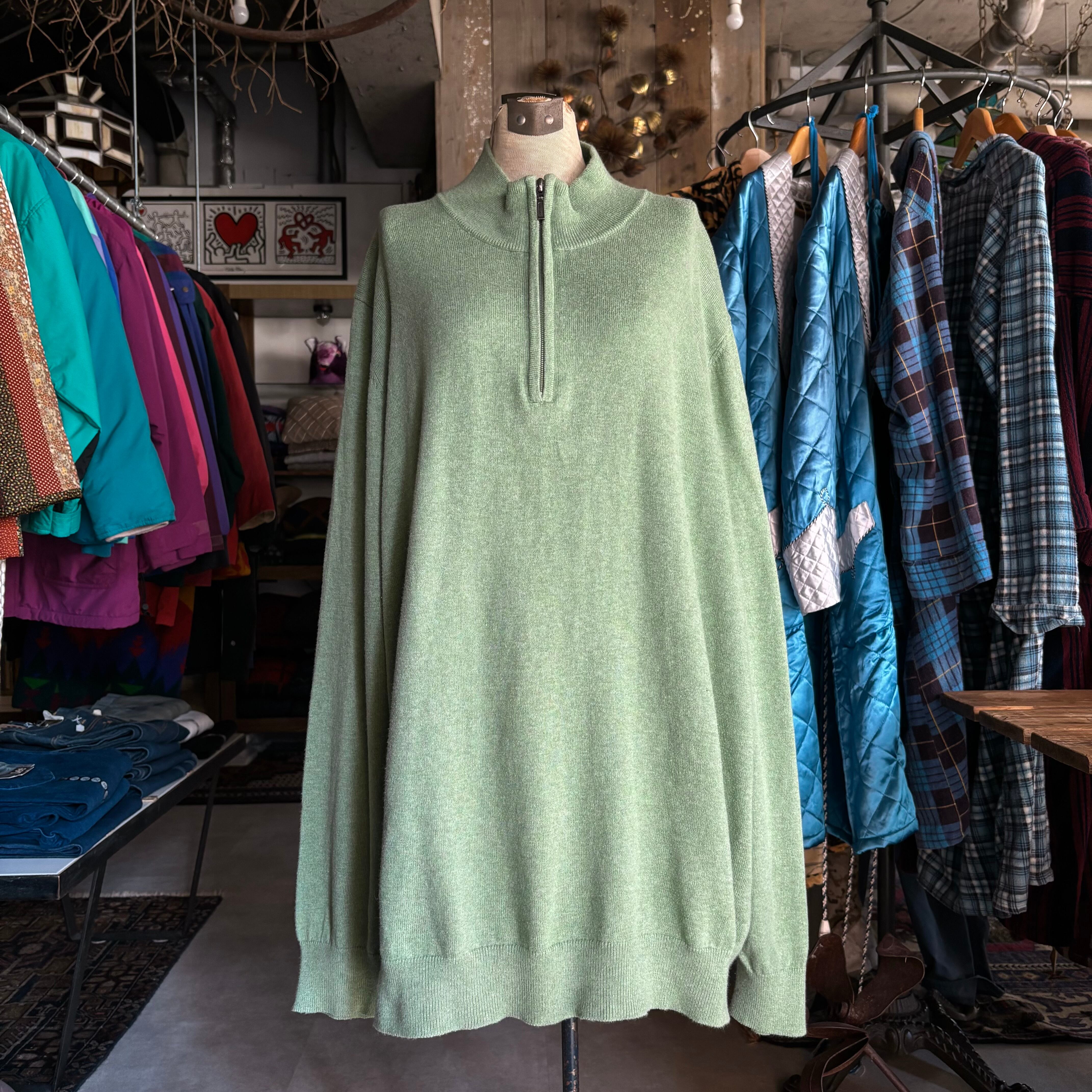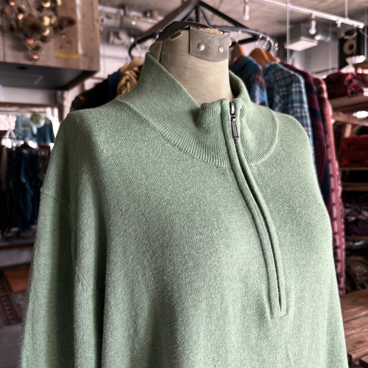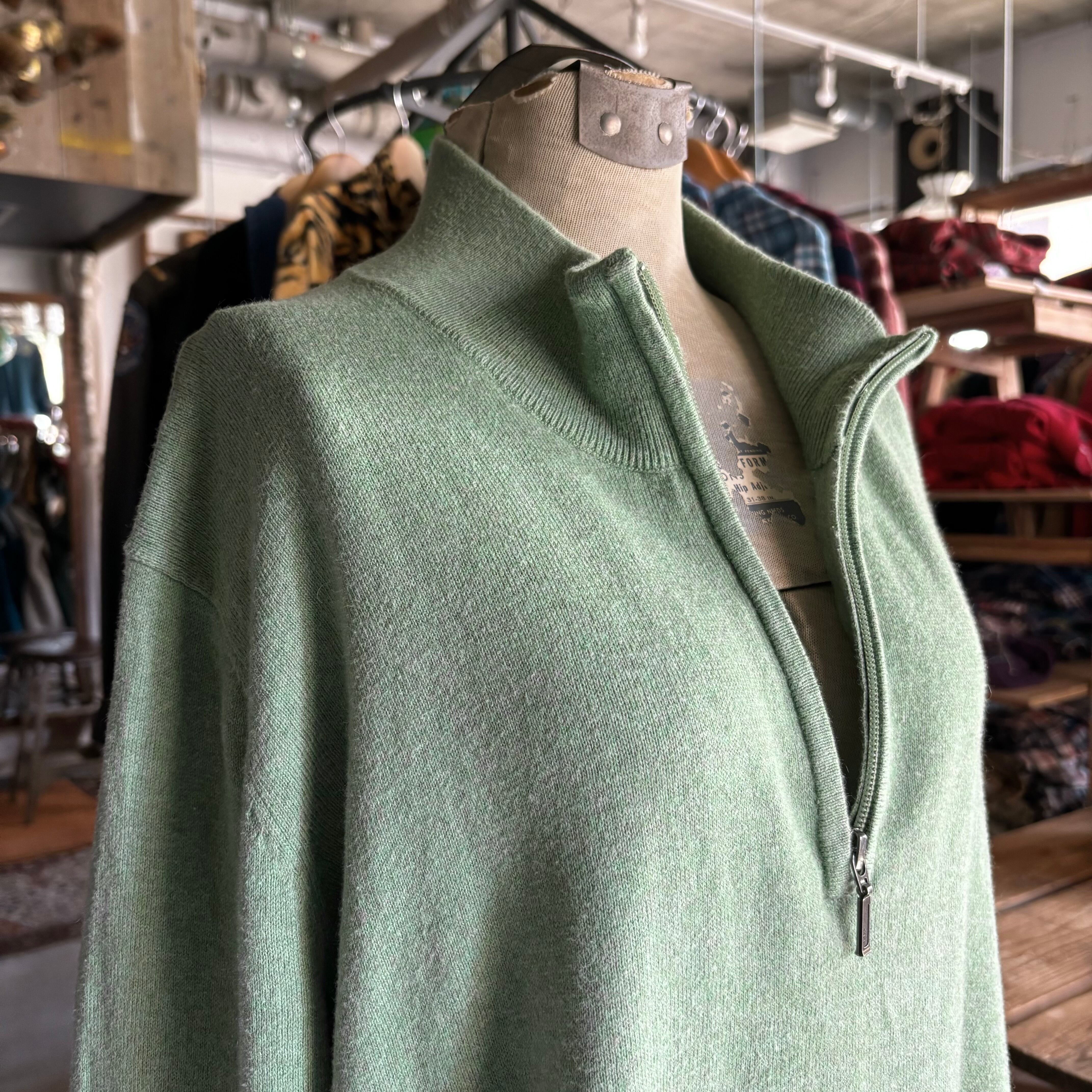 軽く肌触り抜群のコットンにカシミアmix素材。ゆとりのあるリラックスシルエット。ハーフジップ仕様。品の良いうぐいすカラー。