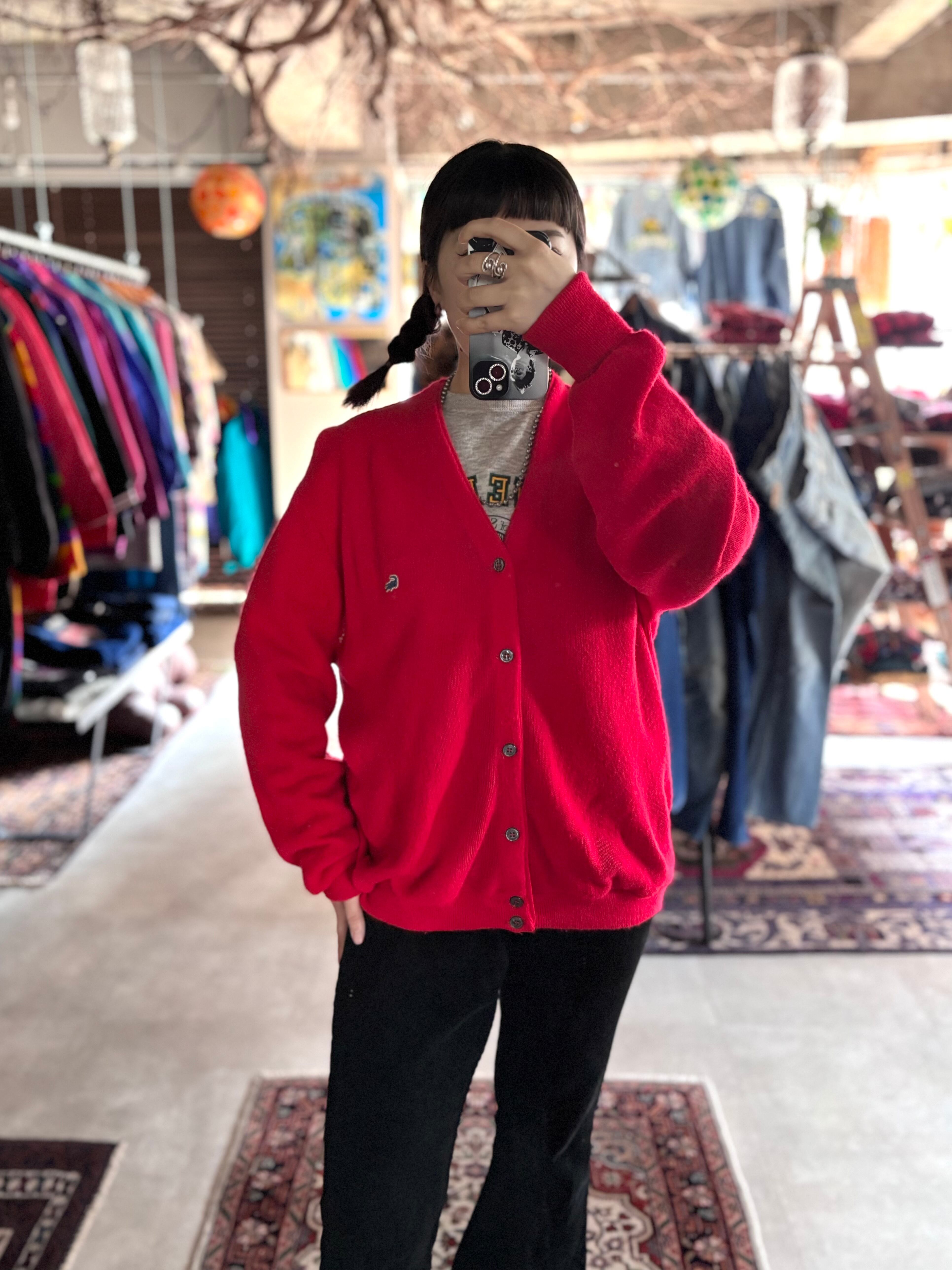軽い着心地のアクリル素材。ゆとりのあるリラックスシルエット。意外と使い易いフレンチレッドカラー。70s糸巻きタグのvintageラコステ製。