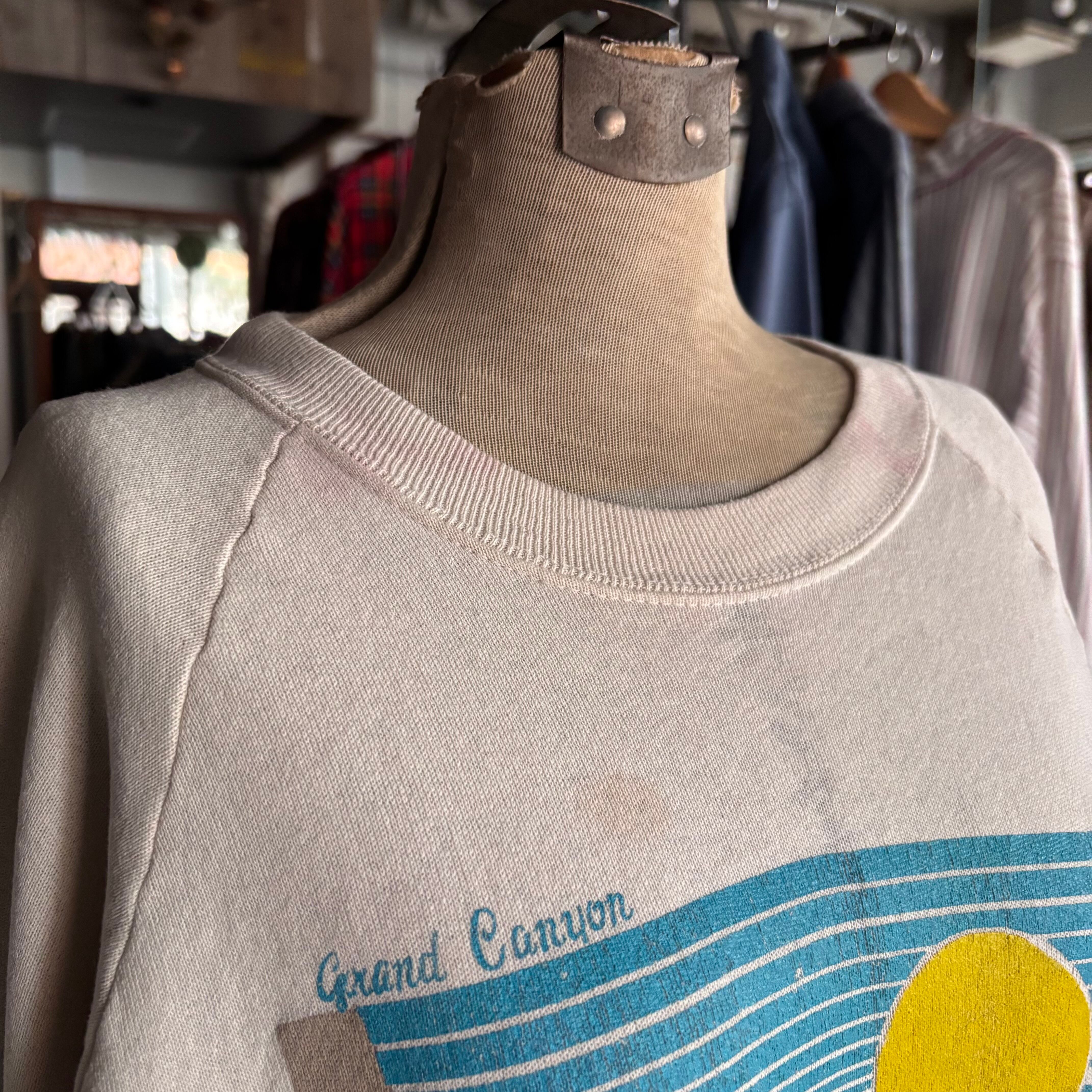 ネックに色染み。プリントのすぐ上に薄染み(画像5枚目をご確認ください)。着込まれたことにより、古着らしいくたびれたコンディション。ビンテージ衣料の雰囲気がお好きな方におすすめです。着用感はございますが、着用に支障のある大きなダメージはございません。(あくまで中古衣料ですので、記載していない小穴や小傷などがある場合がございますが、ヴィンテージ衣料の風合いとして捉えて頂ける方のご購入をお願い致します。)