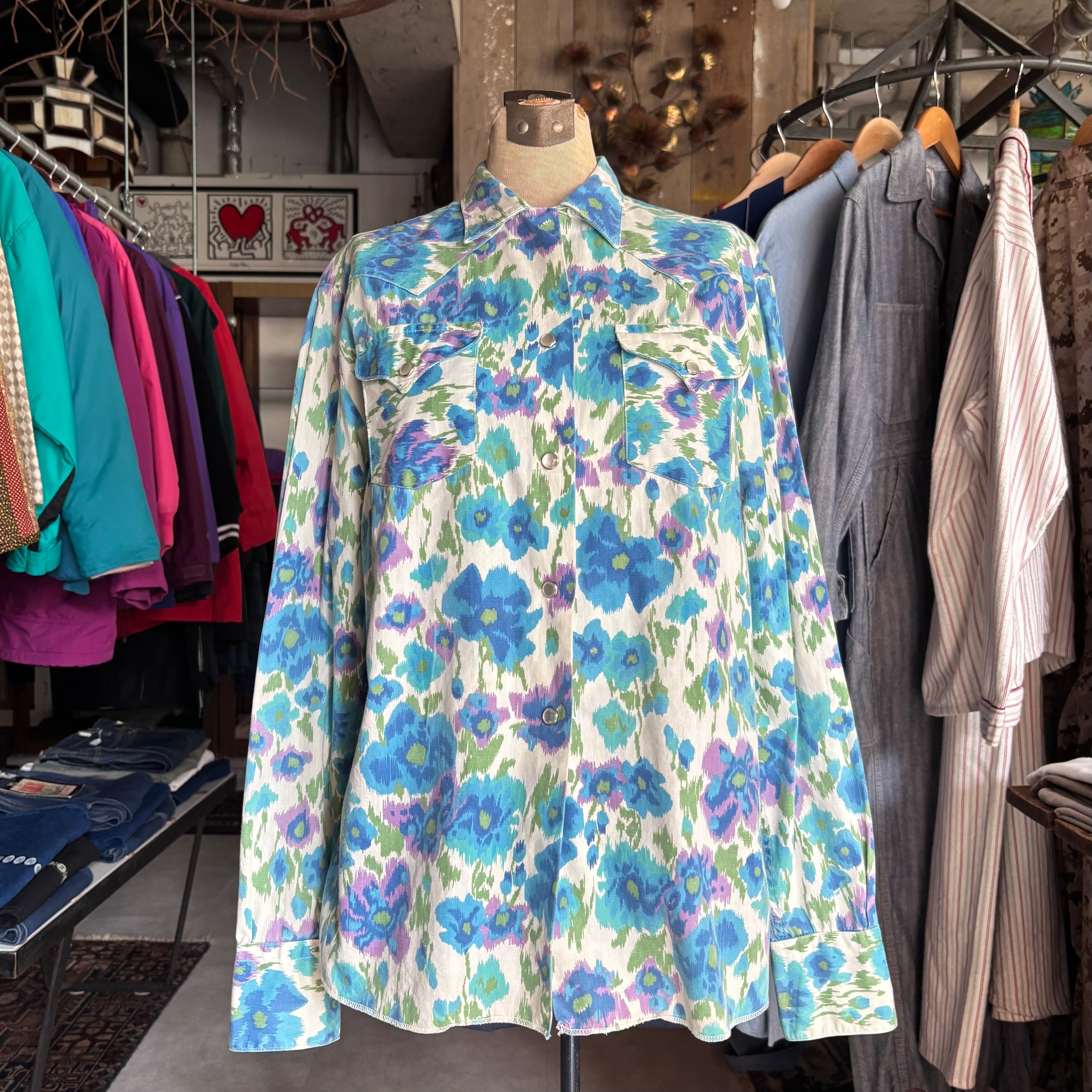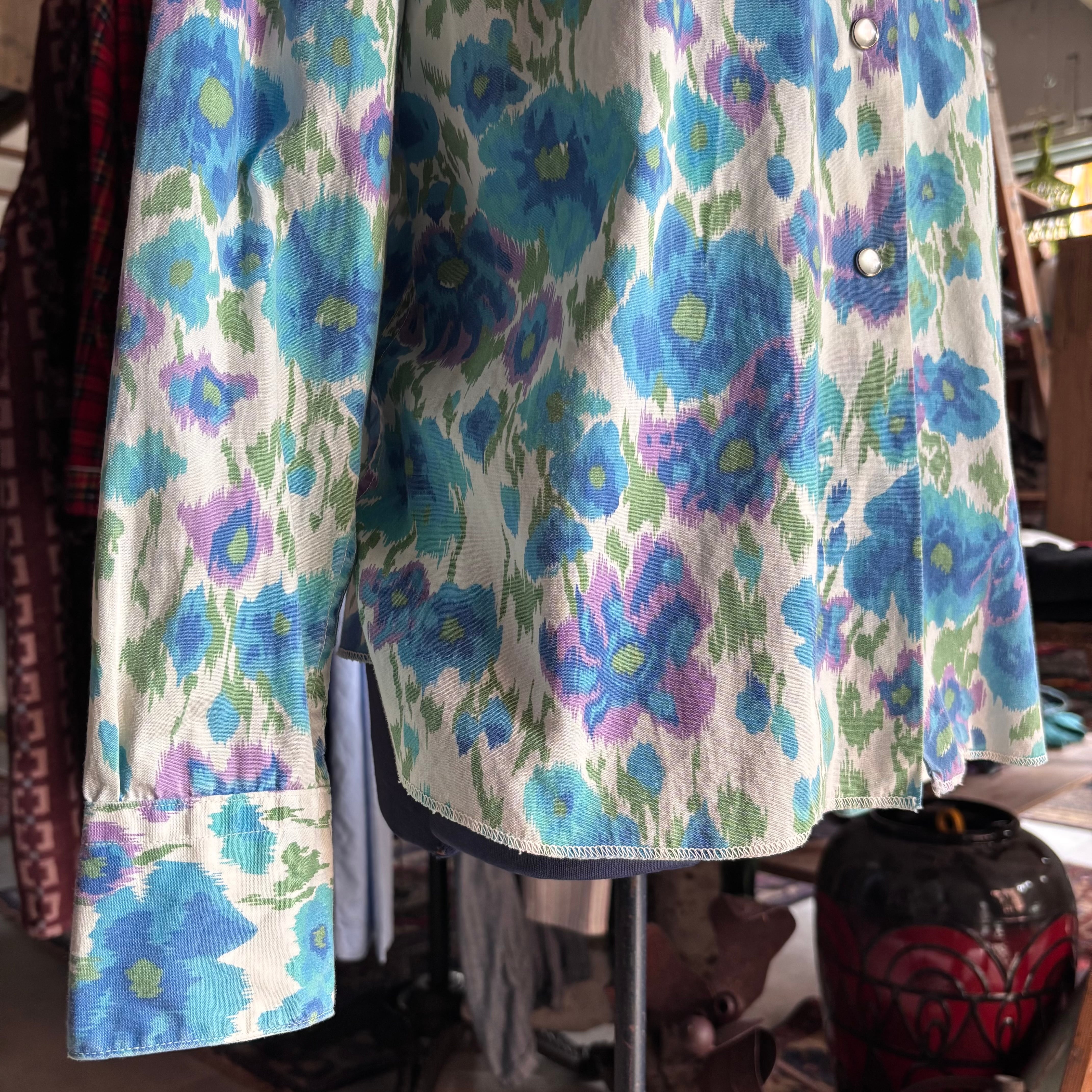 水彩タッチのフラワープリント。ドライな質感が魅力のOLDコットン生地。オーセンティックなフィット。カフスのギャザーや、胸元のダーツ、トップボタンのループホールなど仕立ての良いブラウス。バックヨークのラウンドも雰囲気たっぷりです。