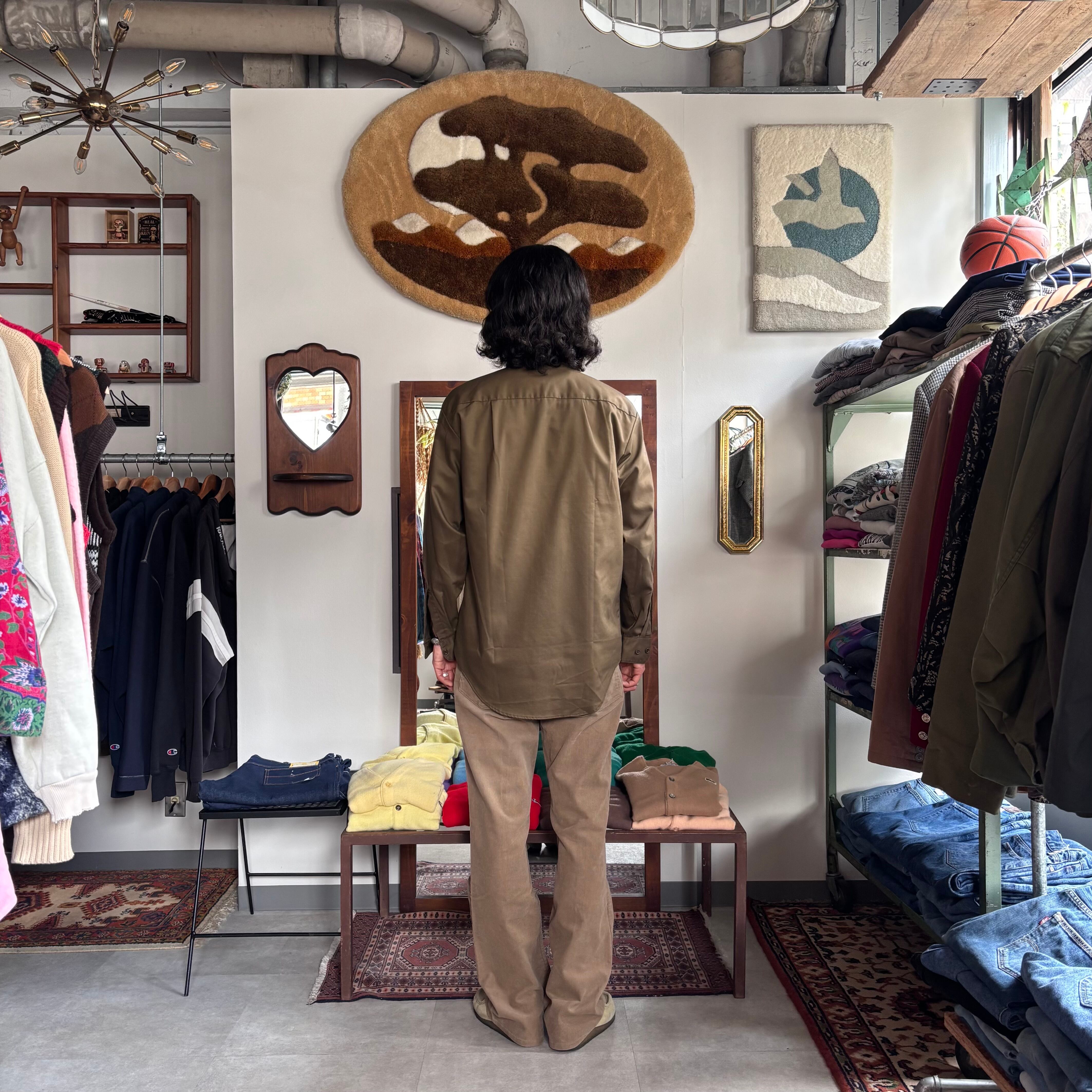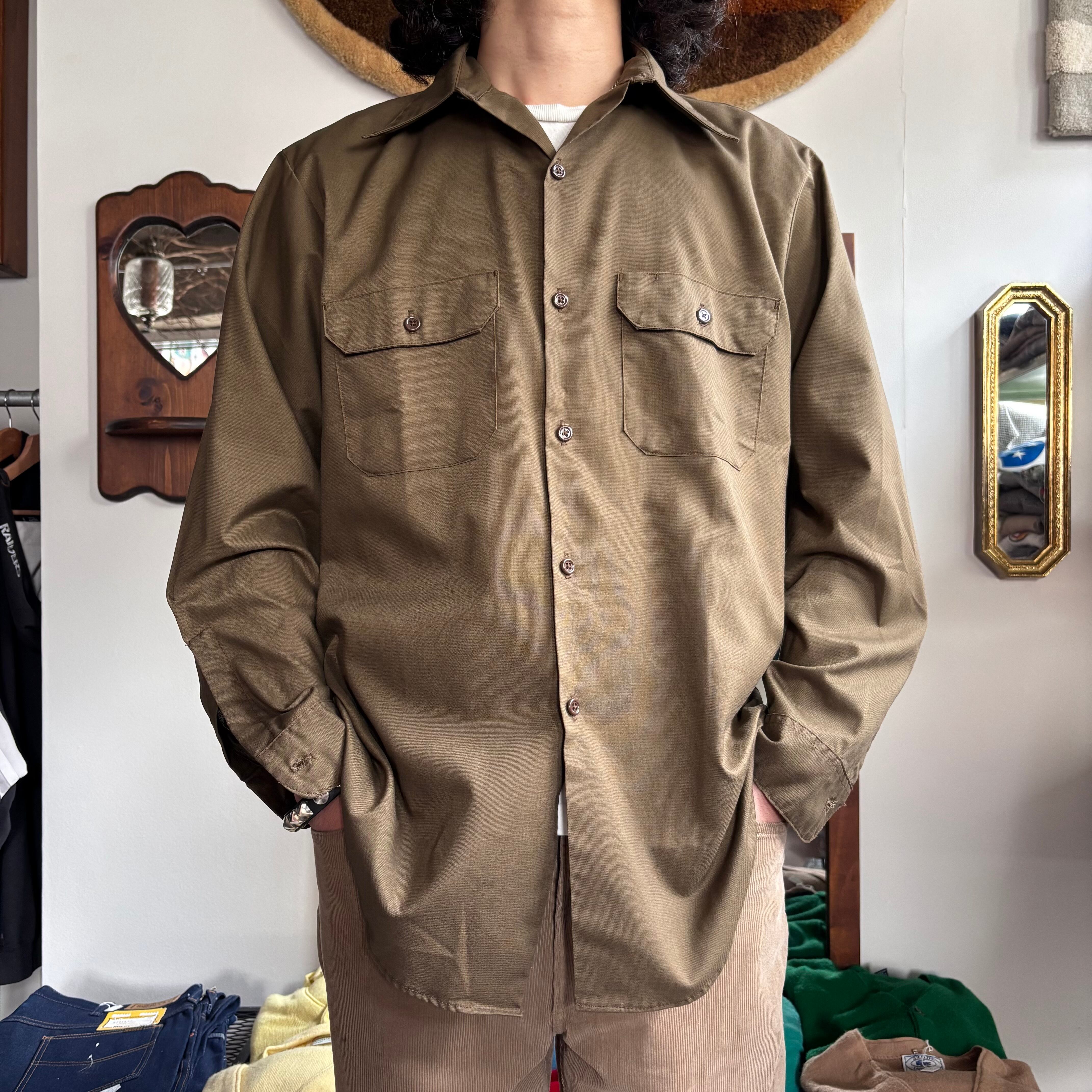 ハリのあるコットンポリ素材。程よくゆとりのあるシルエット。渋めのブラウンカーキカラー。オーセンティックなワークシャツスタイル。襟の形、ボタンなどVINTAGE感抜群。ほぼ未使用の綺麗なコンディション。