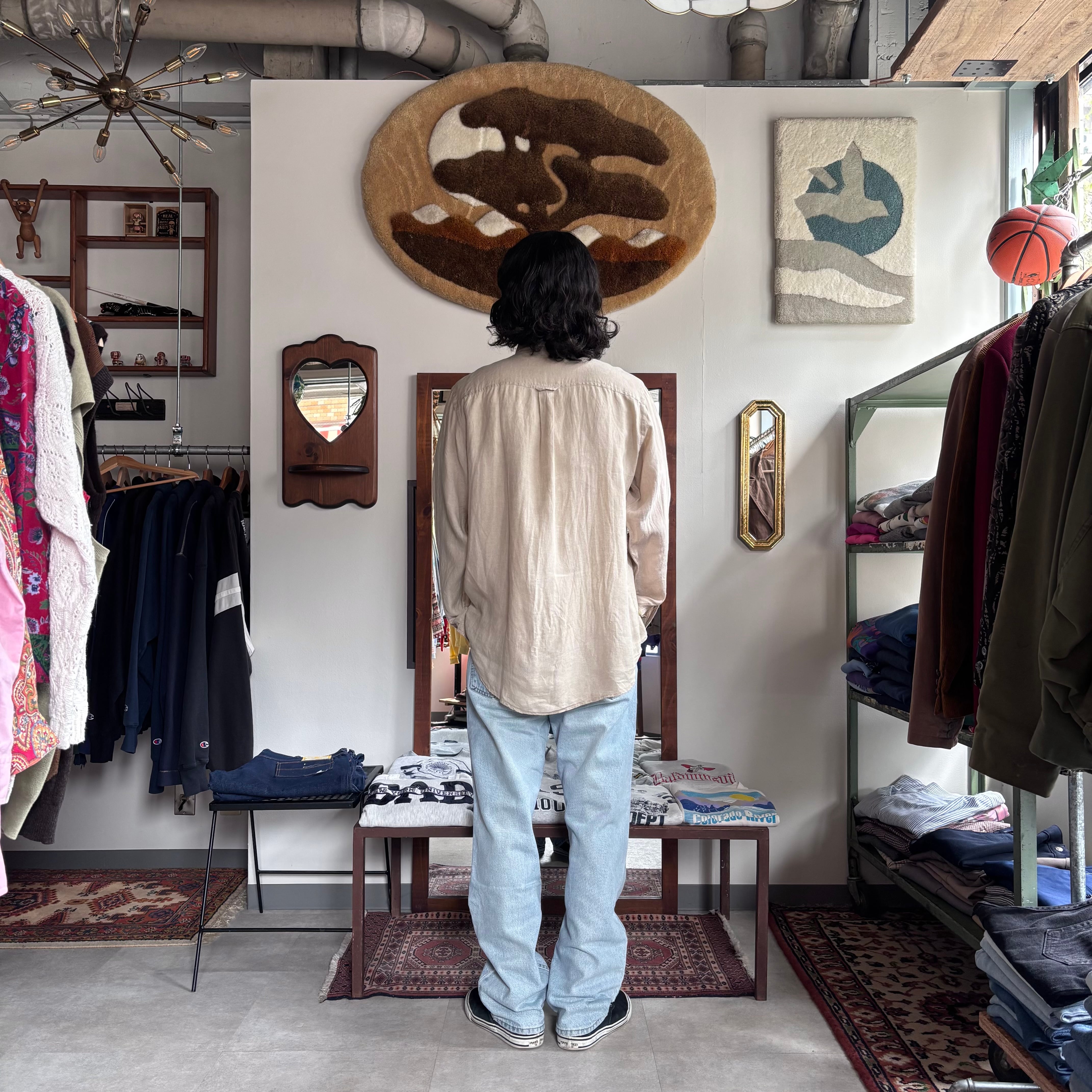 肌当たりの良い柔らかいリネン素材。無漂白のミルクティカラー。ゆとりのあるリラックスフィット。レギュラーカラーに、大きめのフロントポケット。GAP製。ユニセックスでおすすめです。
