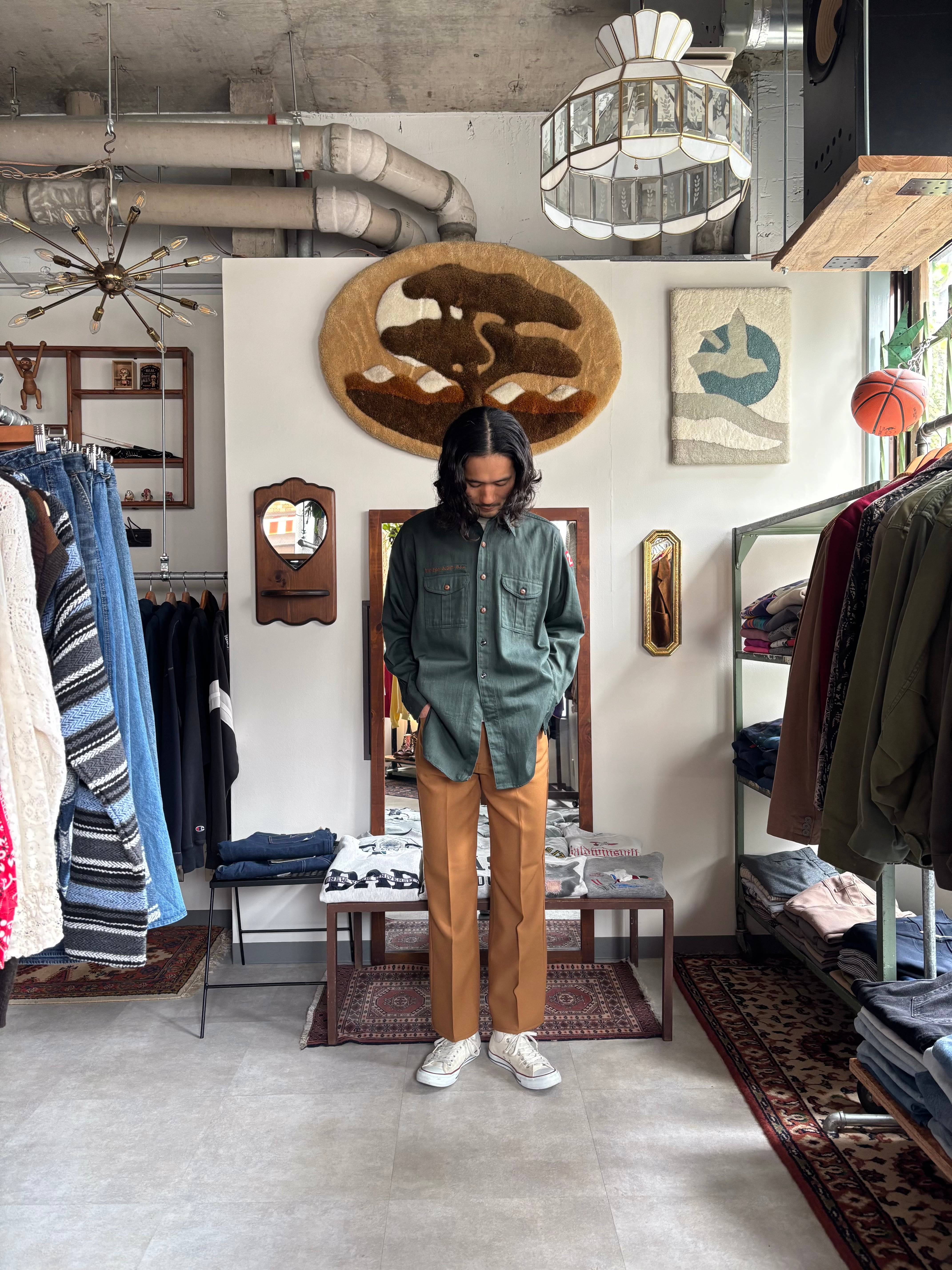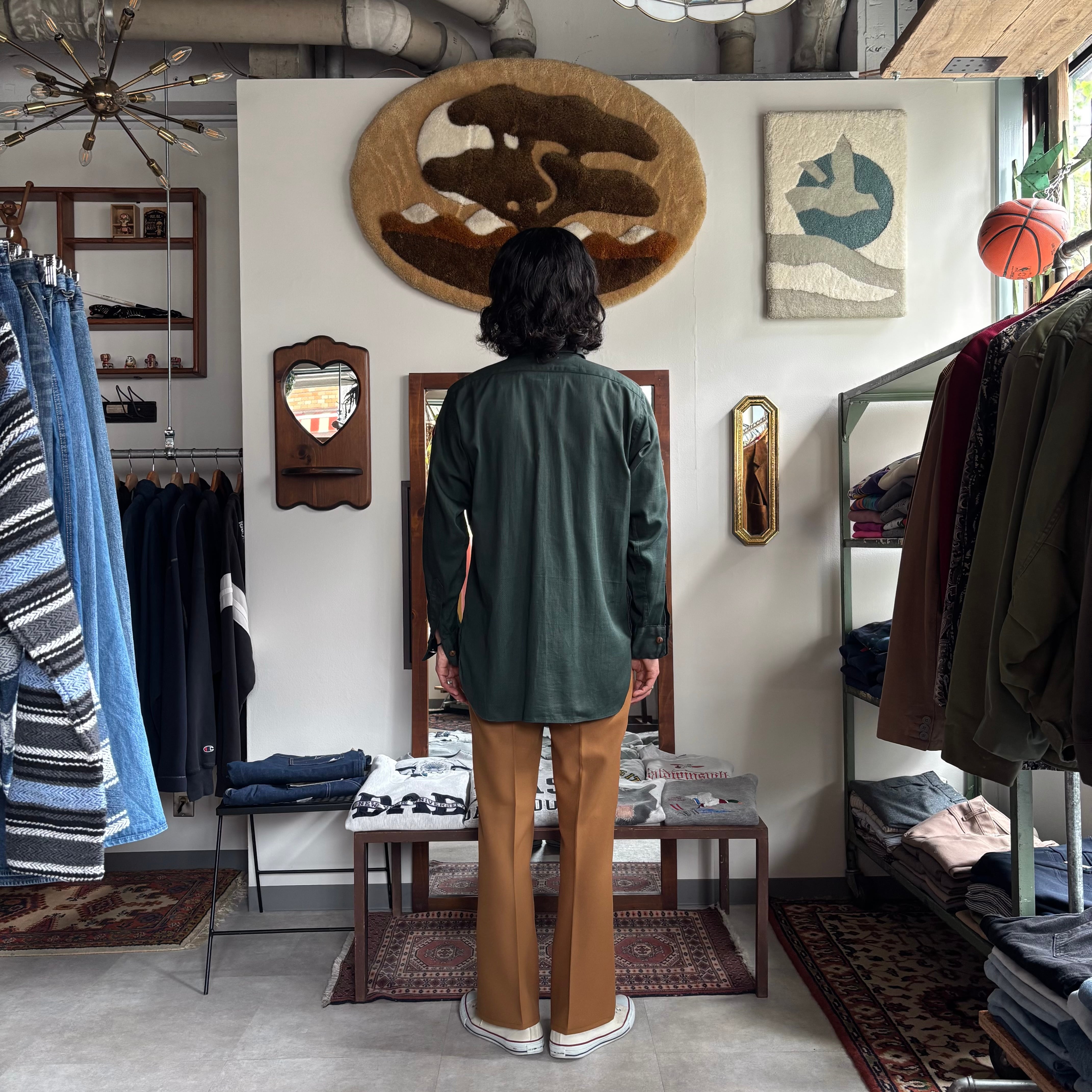 しっかりした厚手のコットンツイル素材。オーセンティックフィット。マットなグリーンに、琥珀色のベークライトボタンが雰囲気抜群。サイドはマチ仕様。細めのバックヨーク、シャープな襟がスーパーダンディです。