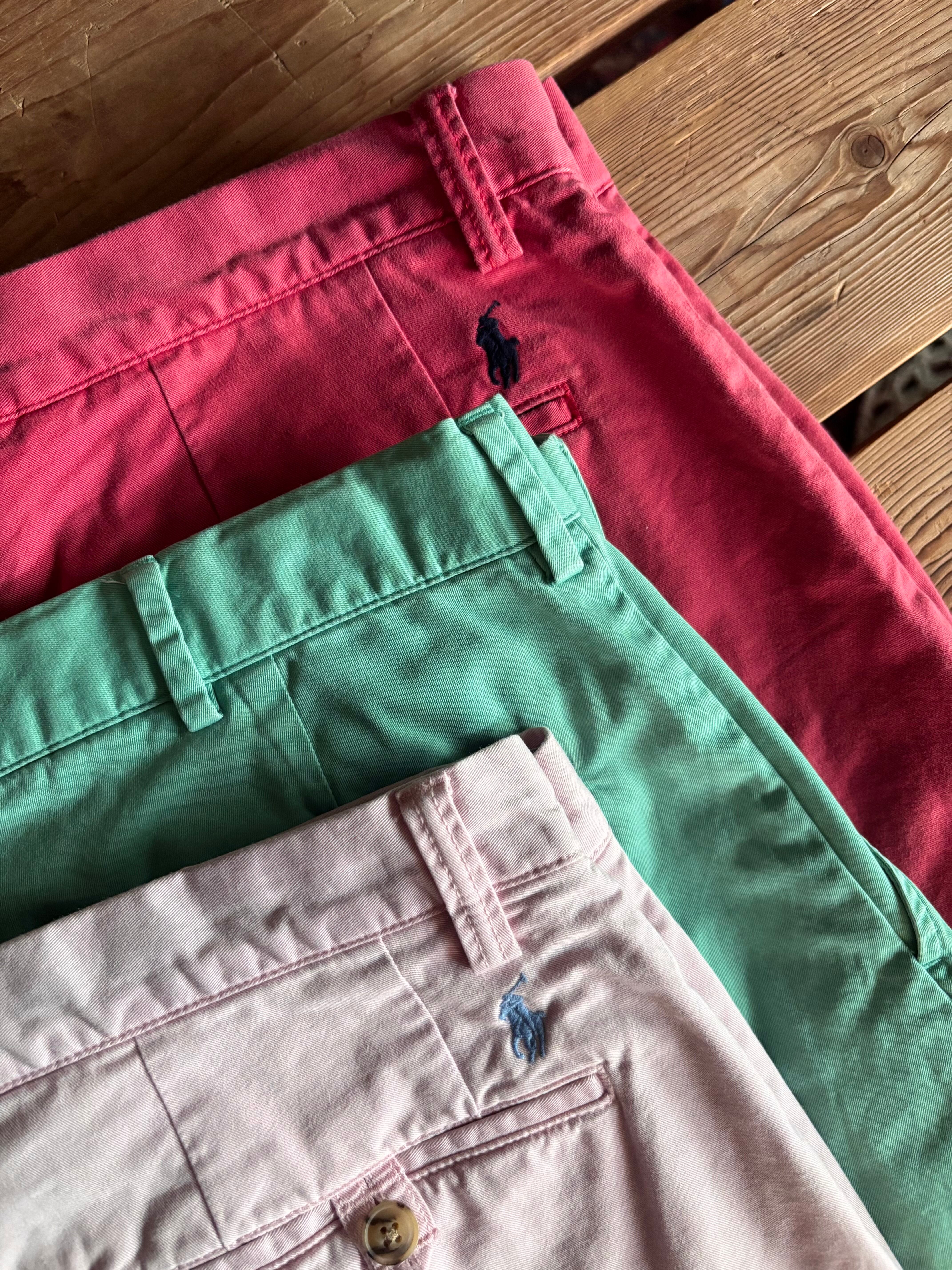 しっかりした厚手のコットンツイル。ストレッチ生地。程よくゆとりのあるストレートシルエット。ライトピンクに、サックスのポニー刺繍。クラシカルかつ、華やか。気になる方にはぜひおすすめの一本。