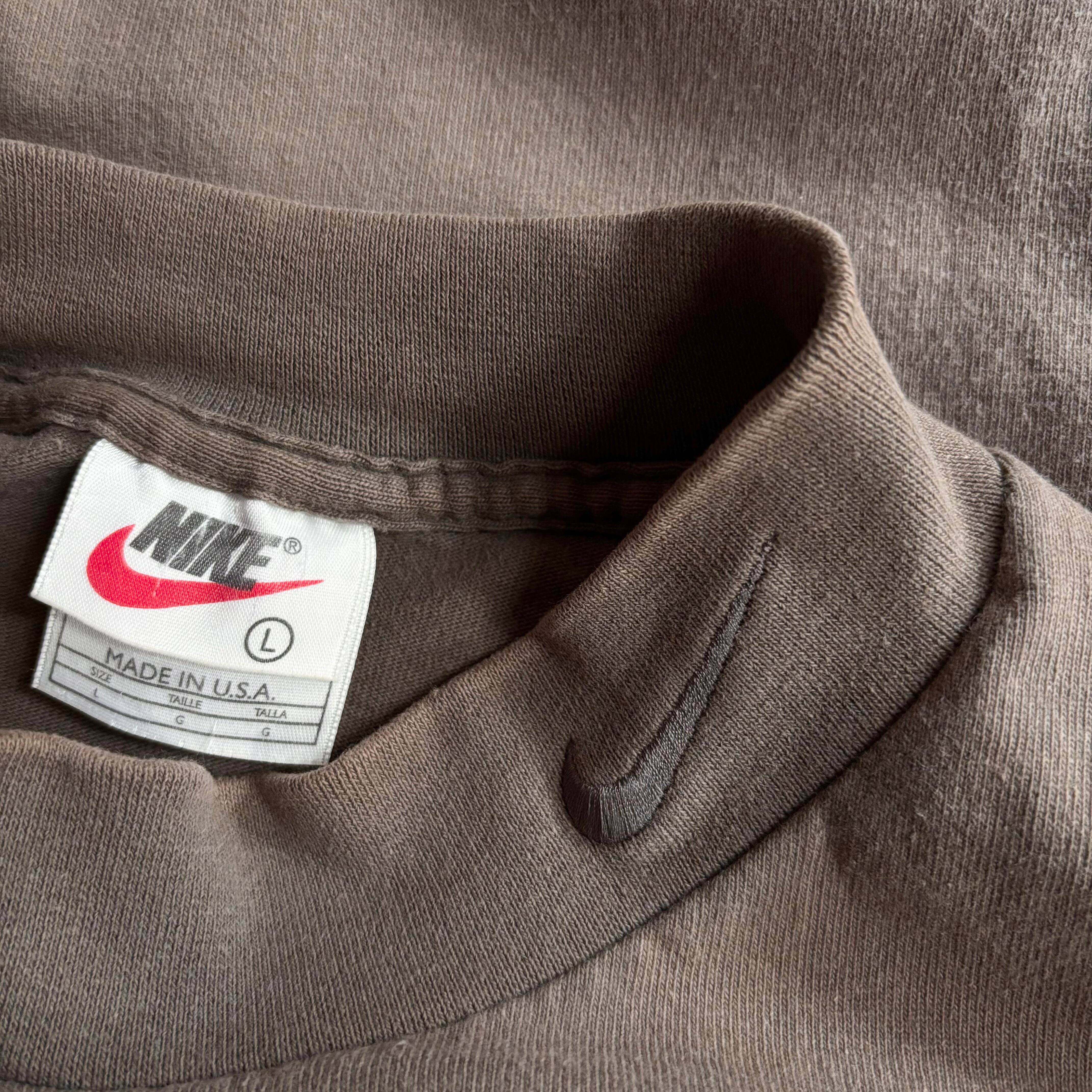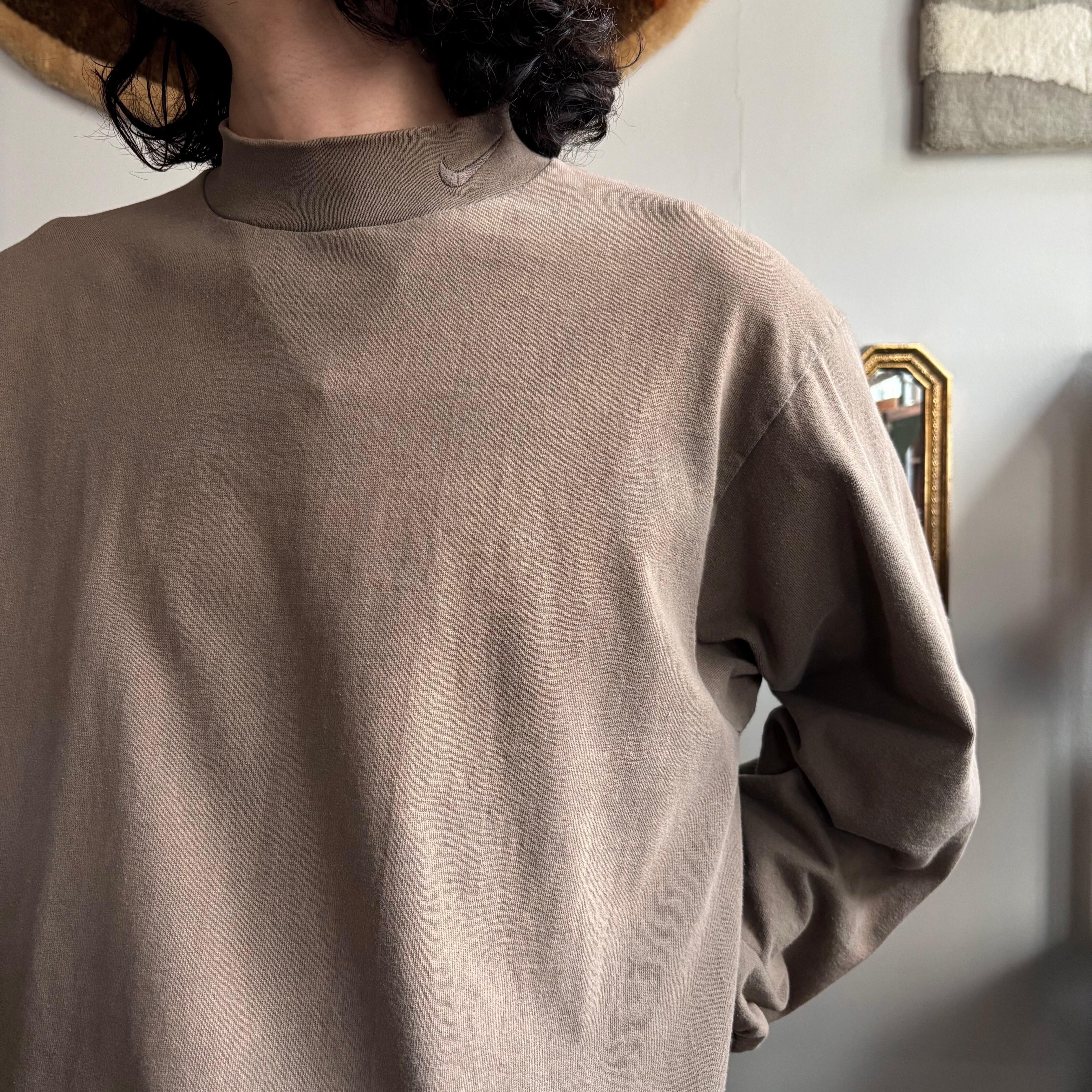 しっかり目のカットソー素材。モカベージュ。ゆとりのあるリラックスシルエット。モックネック仕様。同色のスウォッシュロゴ刺繍。USAメイドのビンテージモデル。1枚でお洒落感抜群おすすめです。