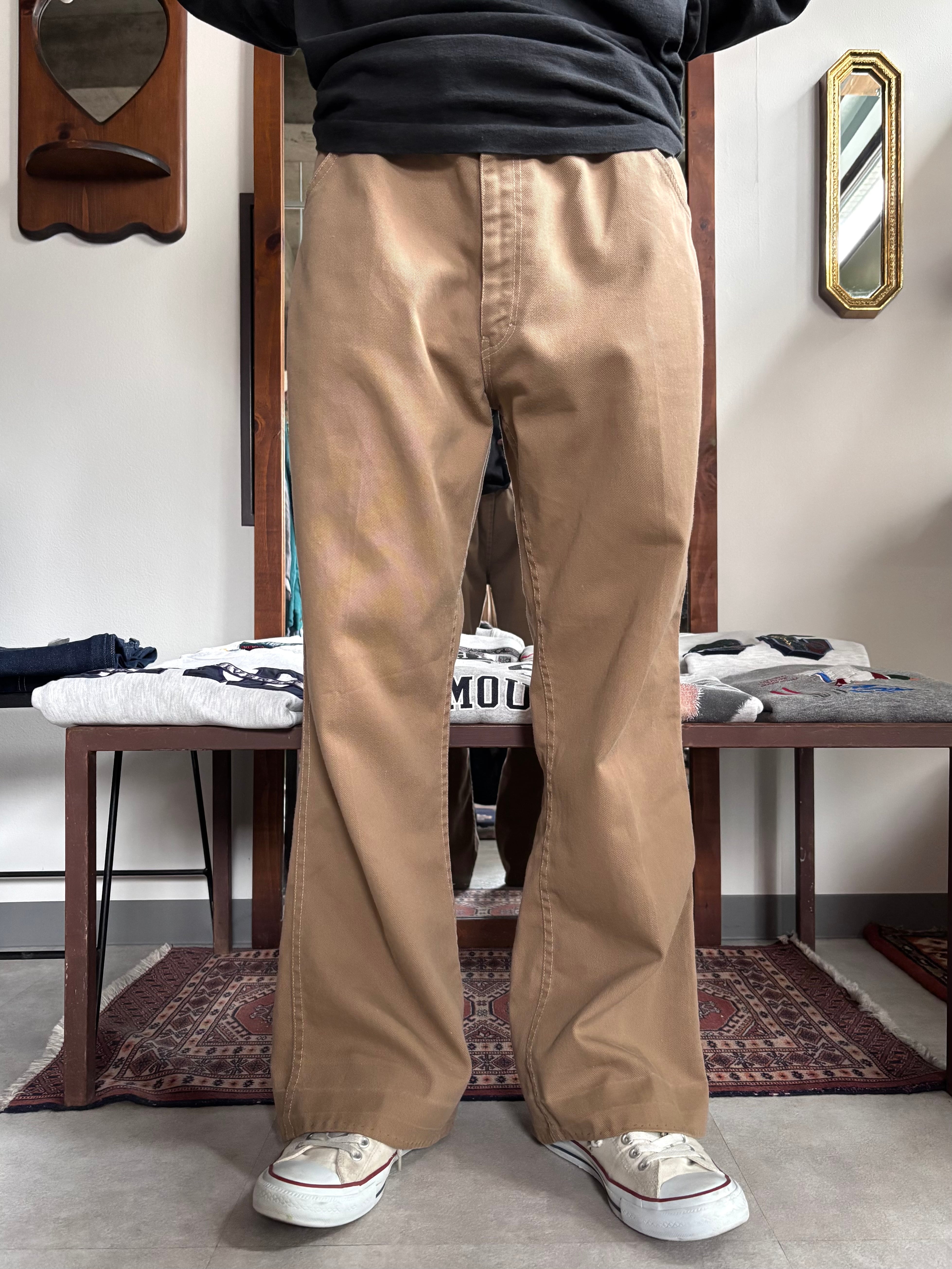 厚手のコットンポリツイル。レトロなモカベージュカラー。ゆとりのあるブーツカットシルエット。珍しいFRUITのビンテージボトムス。