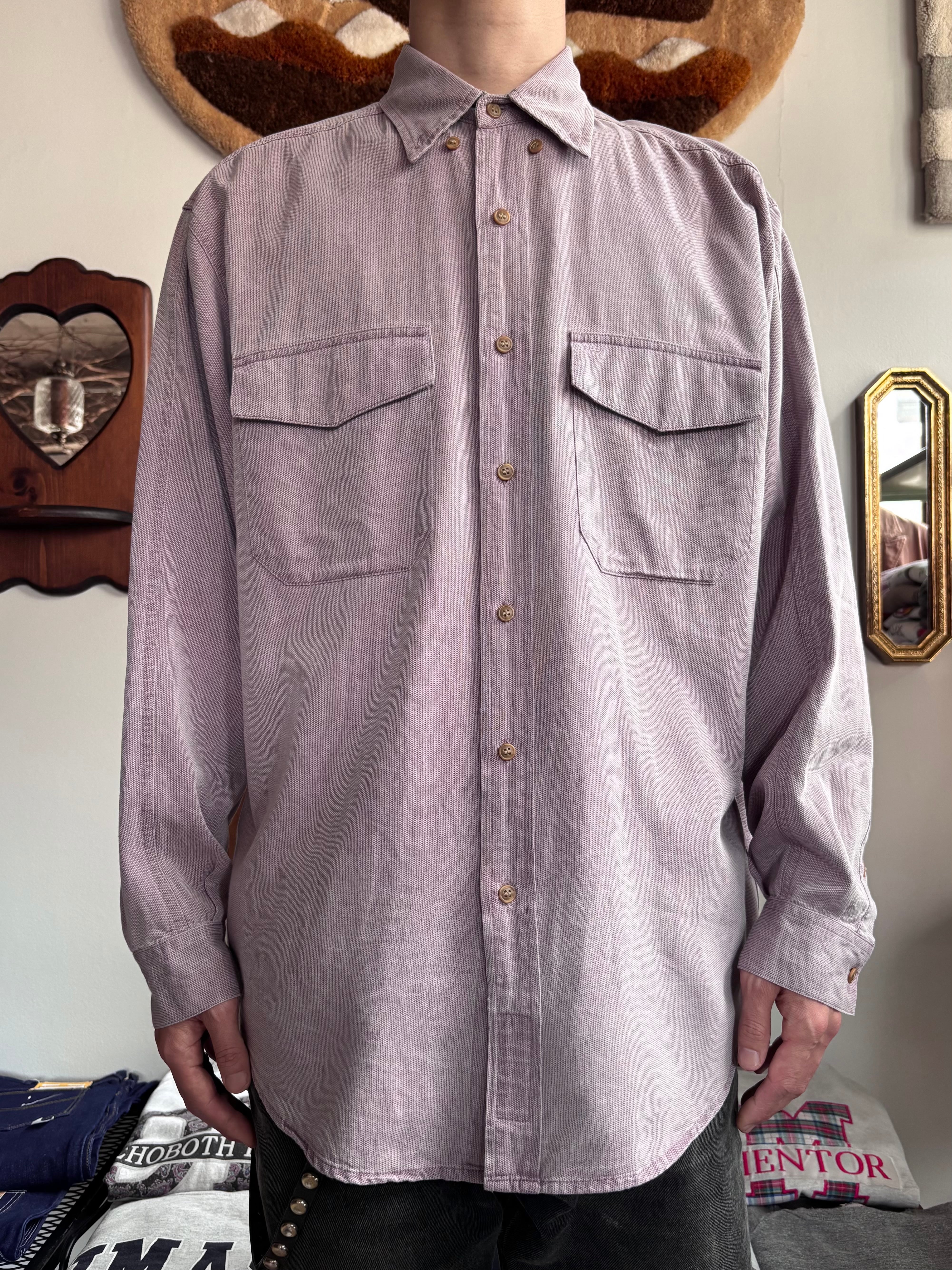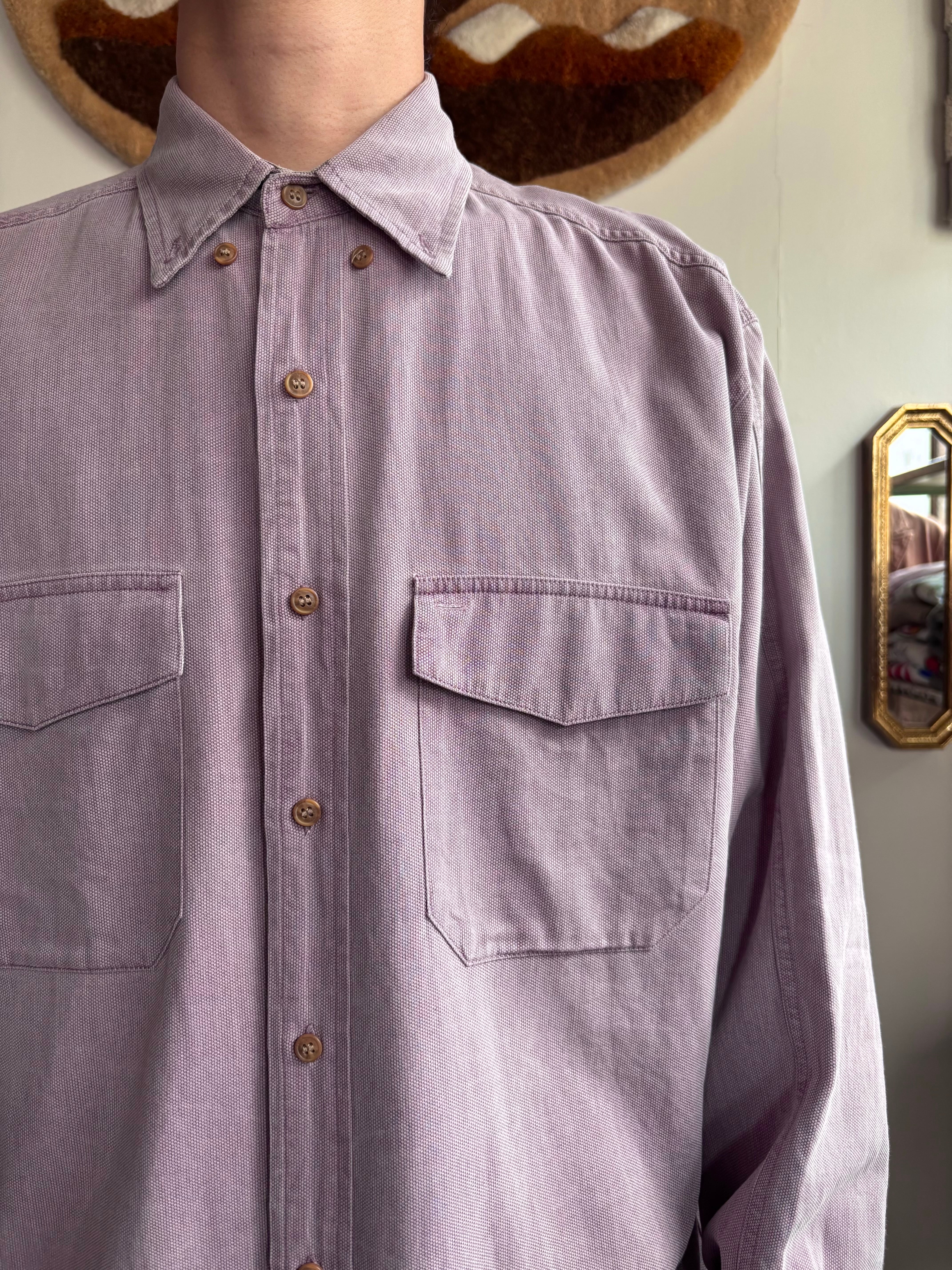 淡いパープルのコットン素材。ゆとりのあるリラックスシルエット。ボタンの付かない大きめフラップポケット。キャラが立ってるおすすめシャツです。