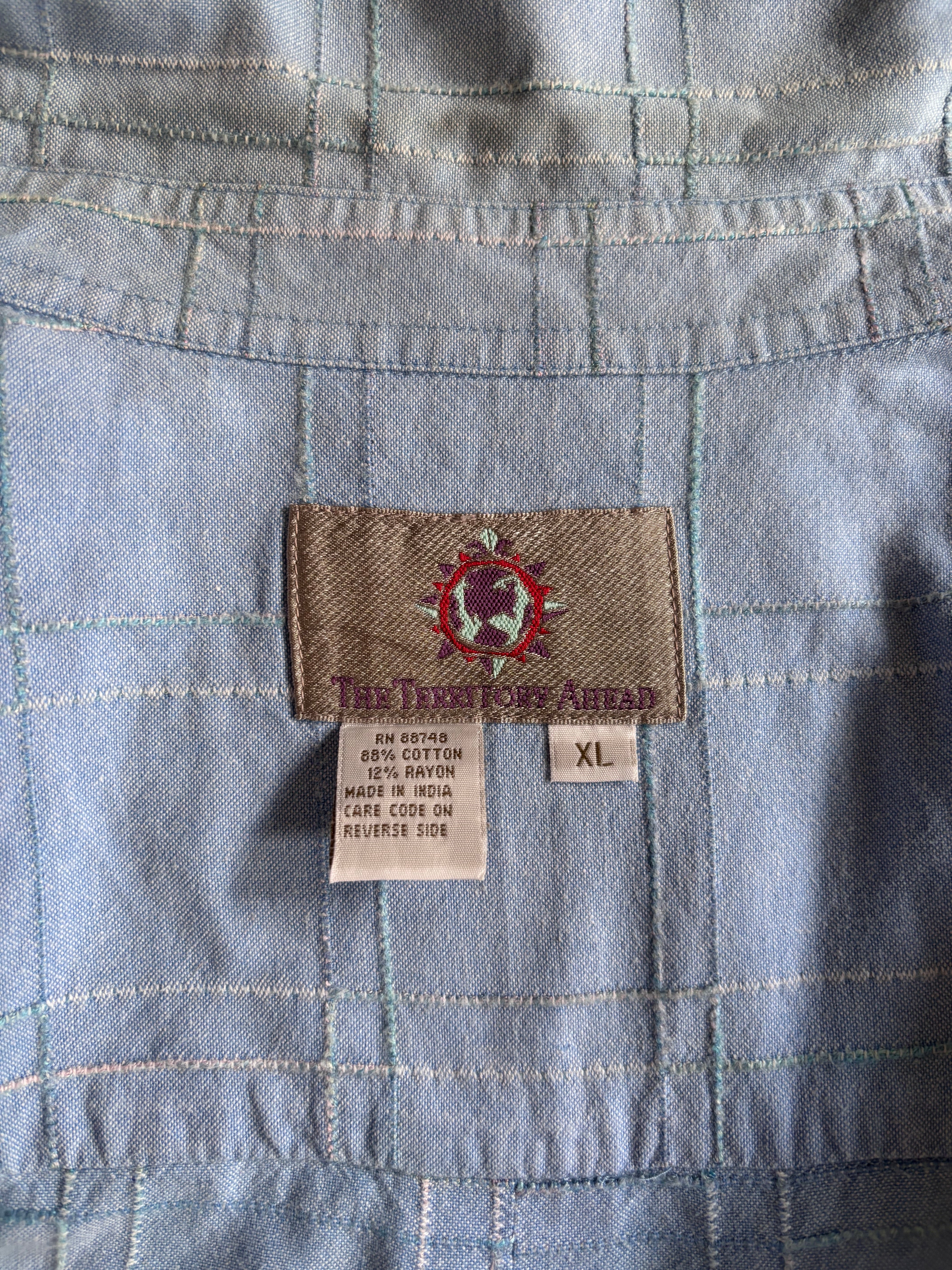 織柄入りのコットンレーヨン生地。淡いサックスカラー。ゆとりのあるリラックスシルエット。キャラが立っているおすすめシャツです。