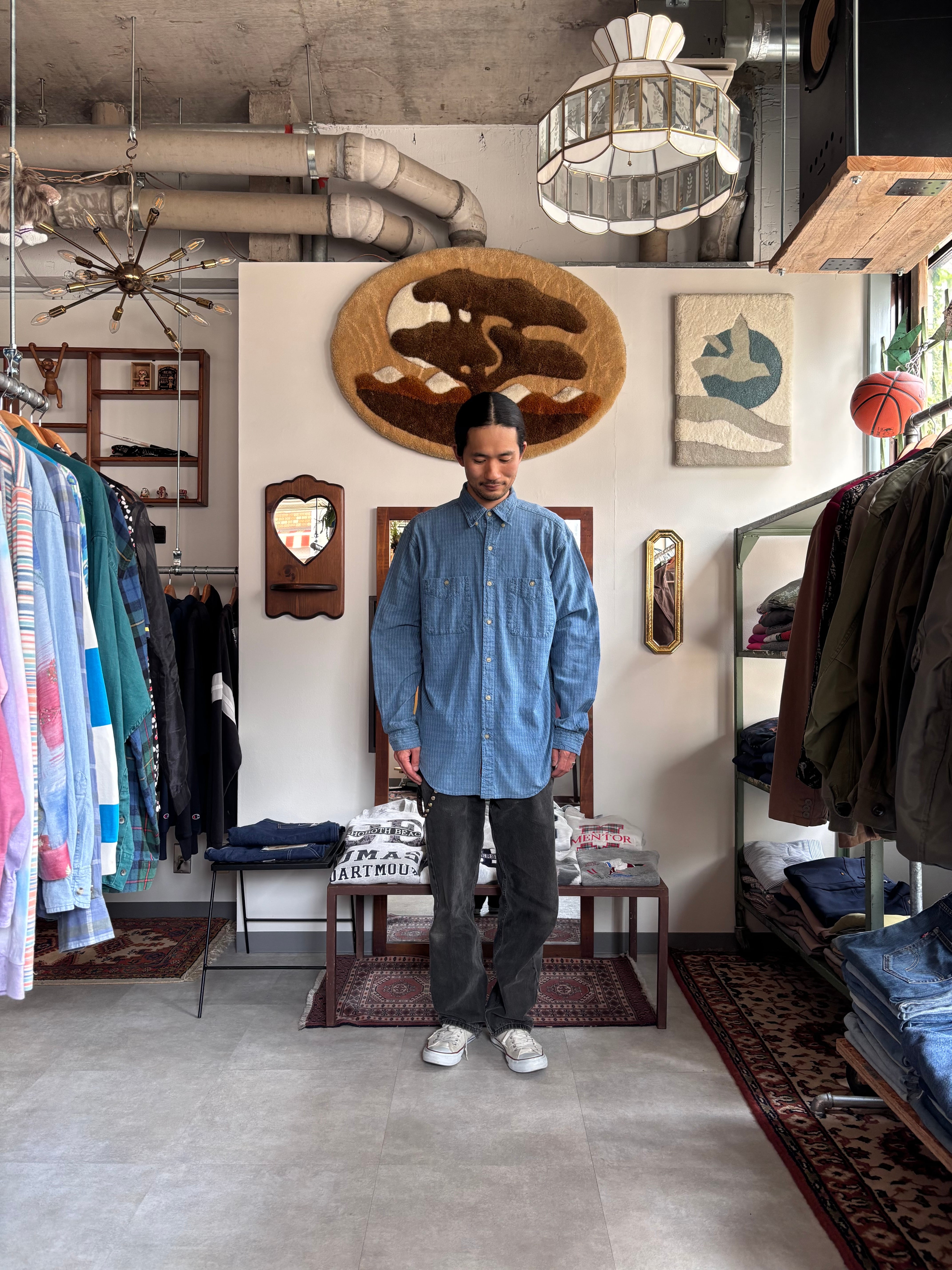 織柄のコットン素材。日本布のような藍色。程よくゆとりのあるシルエット。キャラが立っているおすすめシャツです。