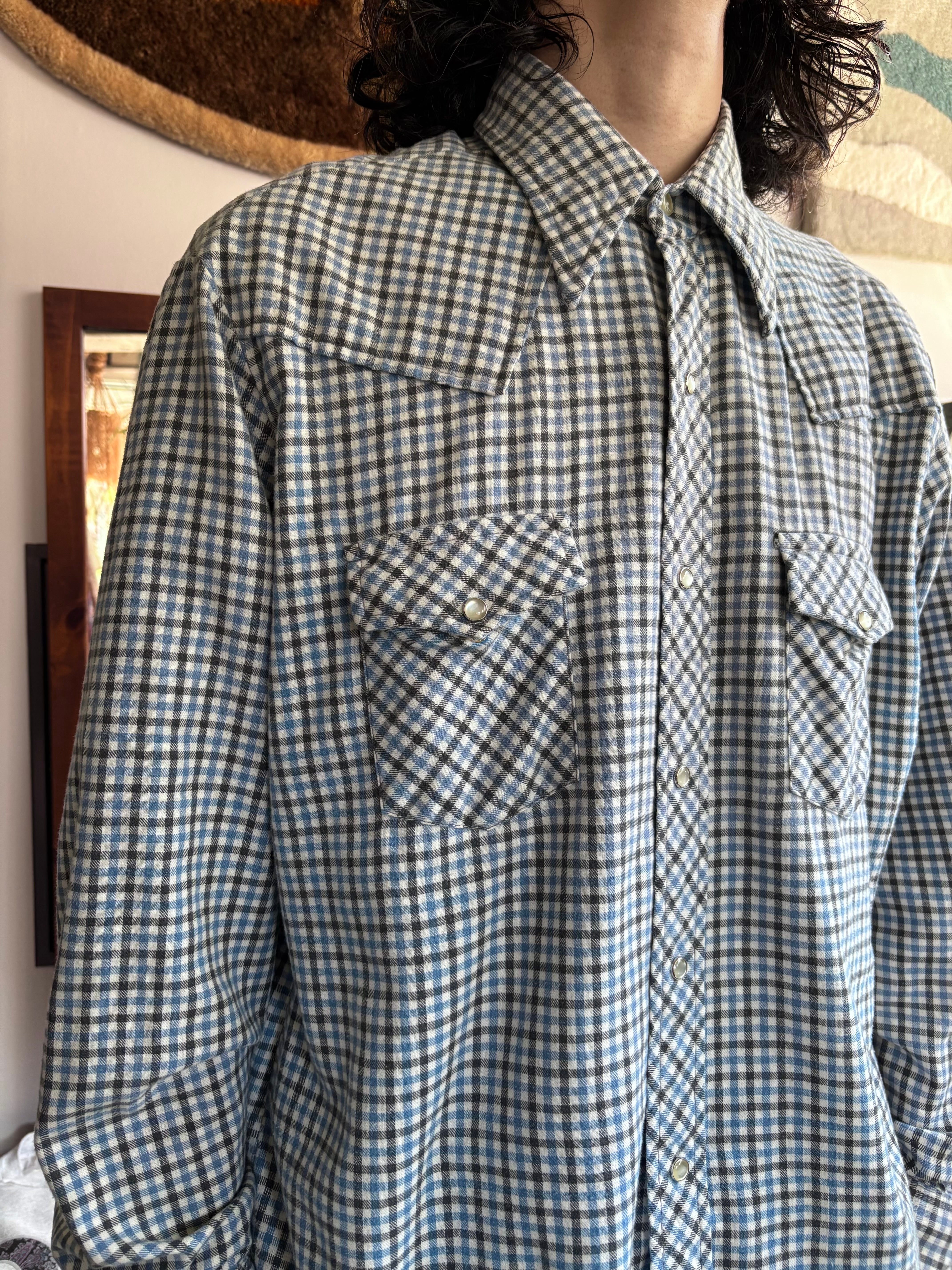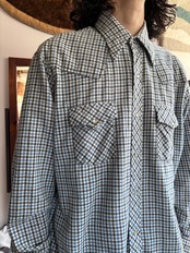 ライトフランネル生地。NERDなブルーグレーカラー。ウエスタンでは珍しいたっぷりした身幅に、着丈短めのシルエット。大きめの襟と、ウエスタンヨークがレトロな印象。質の高いシャツが多いポルトガル製ビンテージJC Penny。