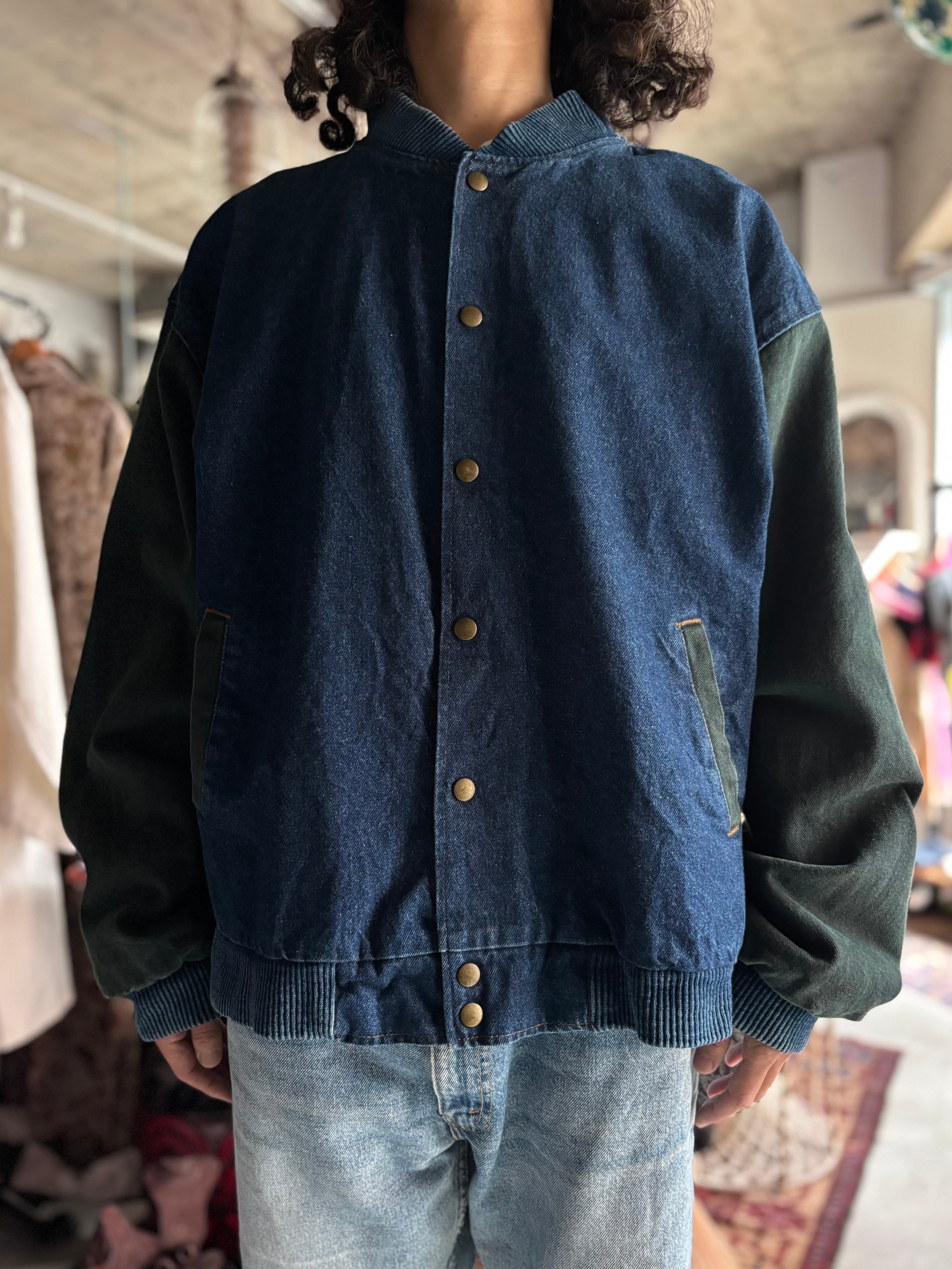 厚手のデニム+コットン素材。リラックスシルエット。珍しいインディゴカラーのコットンリブ。USA製のOLDモデル。女性がオーバーサイズで羽織るのもおすすめです。