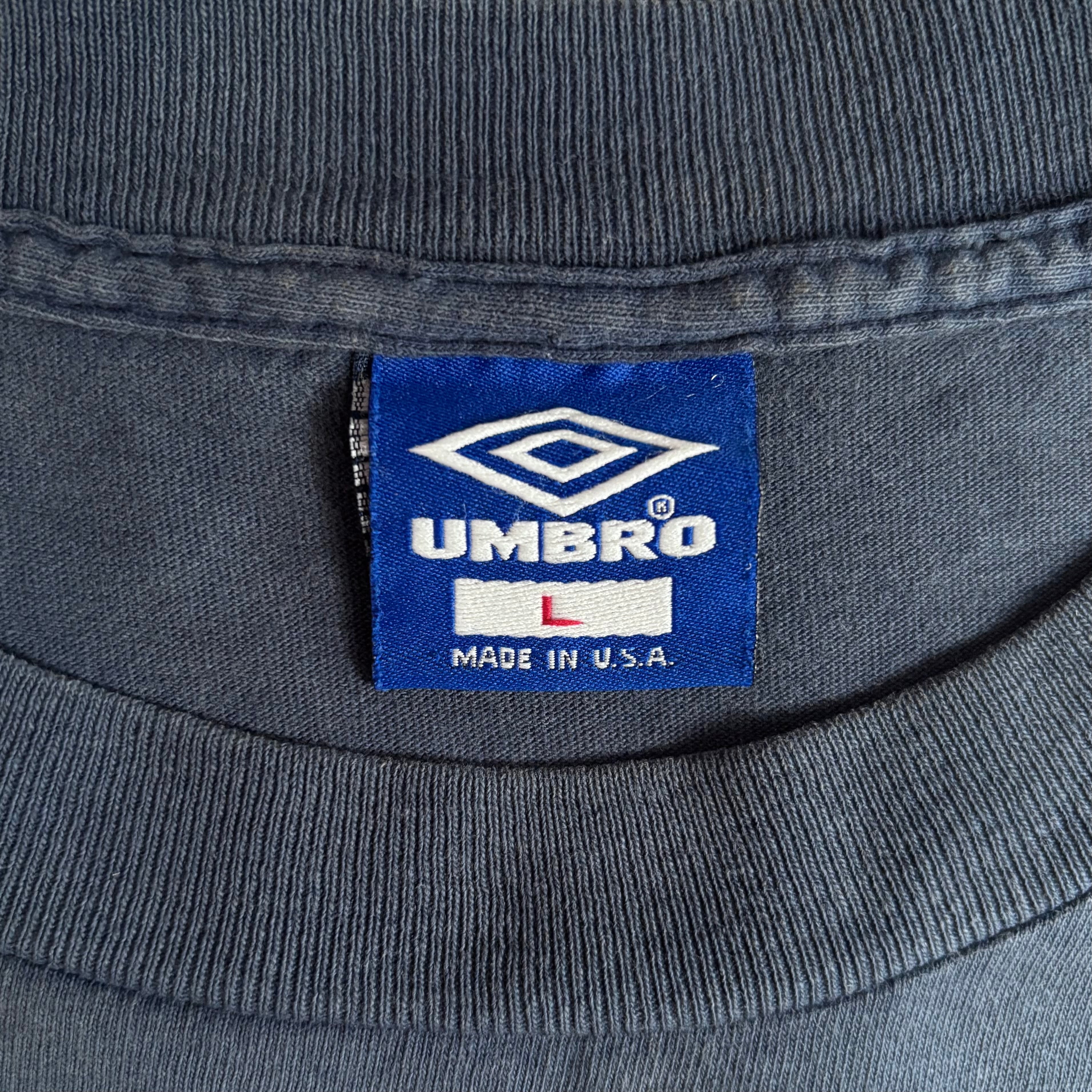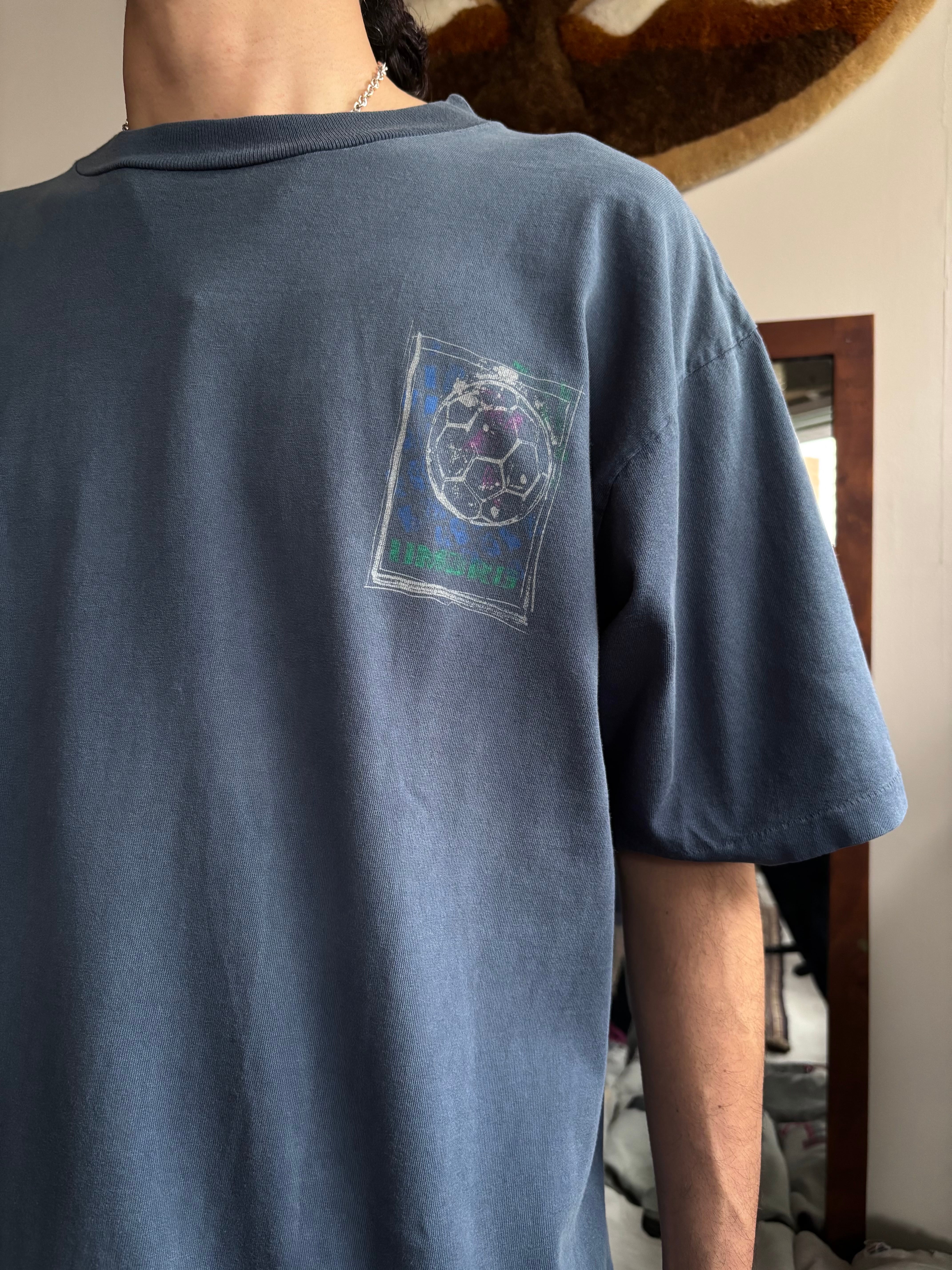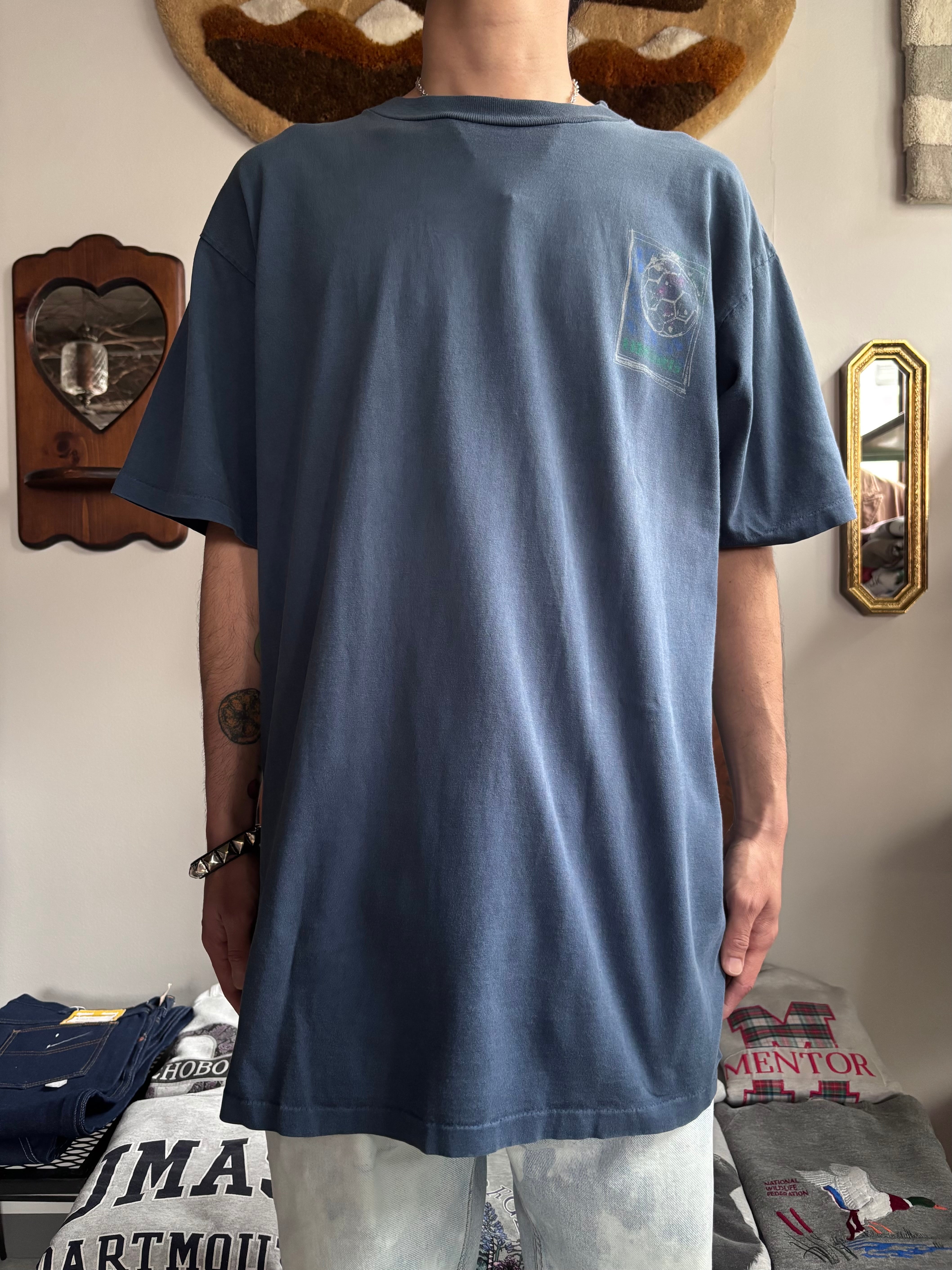 肉厚なコットン生地。だらっとしたリラックスフィット。90s USメイドのアンブロ製。両面プリント。シングルステッチ。色褪せたネイビーボディに、地味目のプリントカラーがクールです。
