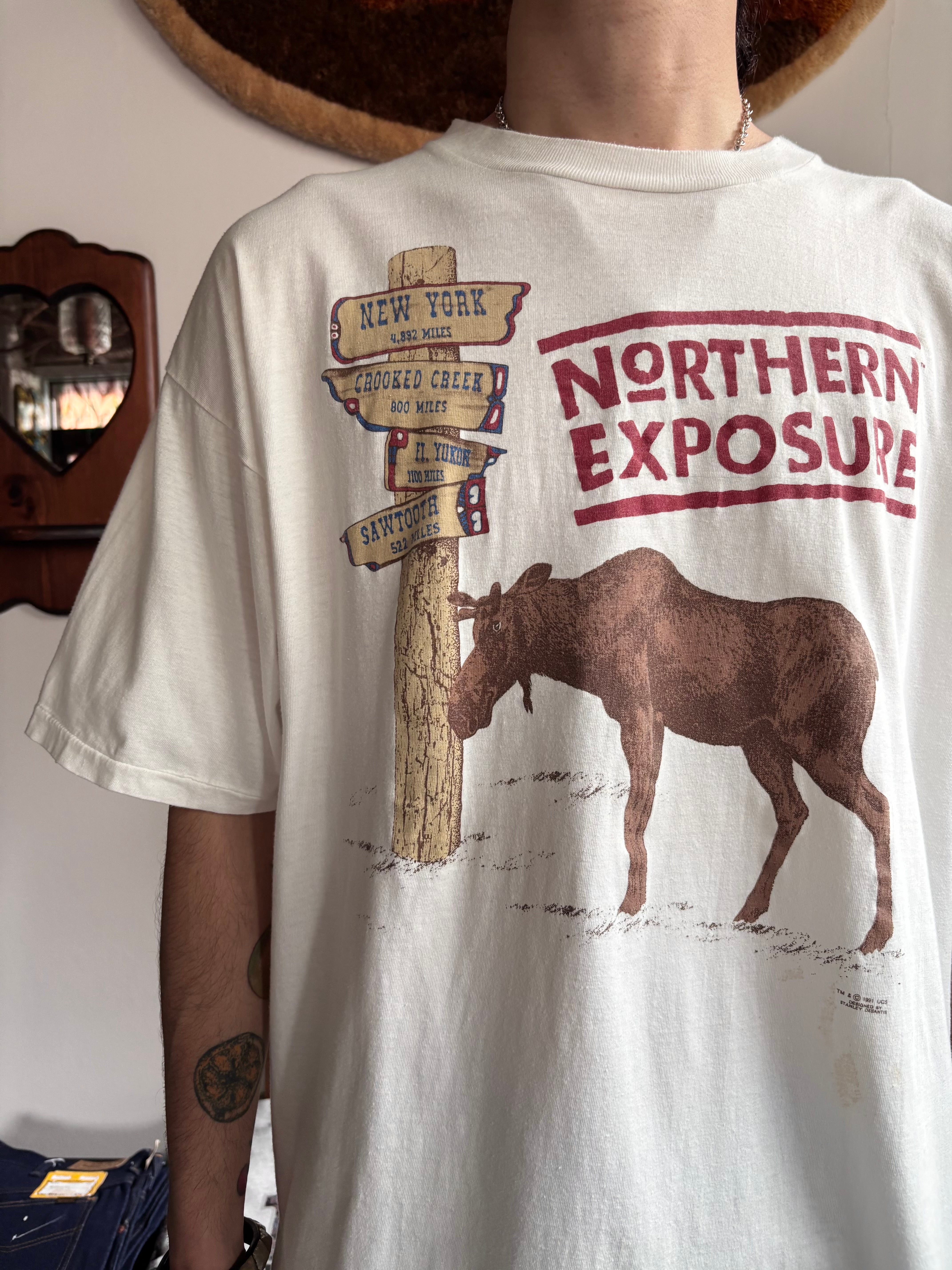 たれるタイプのOLDコットン生地。ゆとりのあるリラックスフィット。シングルステッチ。90sにCBSで放映されたドラマ。北米スーベニアのようなゆるい雰囲気。
