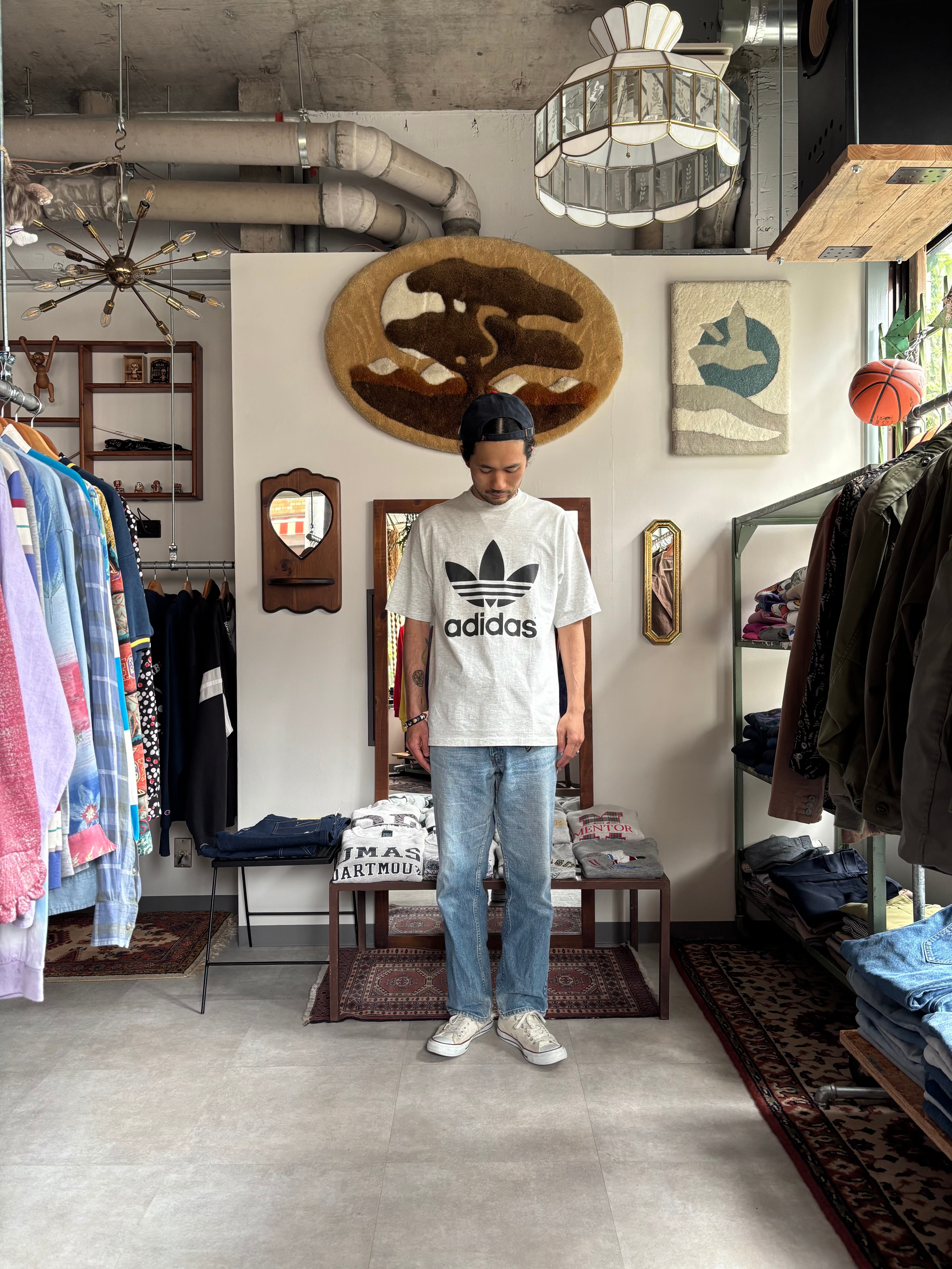 硬めの質感のコットン素材。程よいゆとりのフィット。トラッドアスレチック感のあるヘザーグレイカラー。90sUSメイドのビンテージアディダス。両面プリント。シングルステッチ。とてもおすすめの1枚です。
