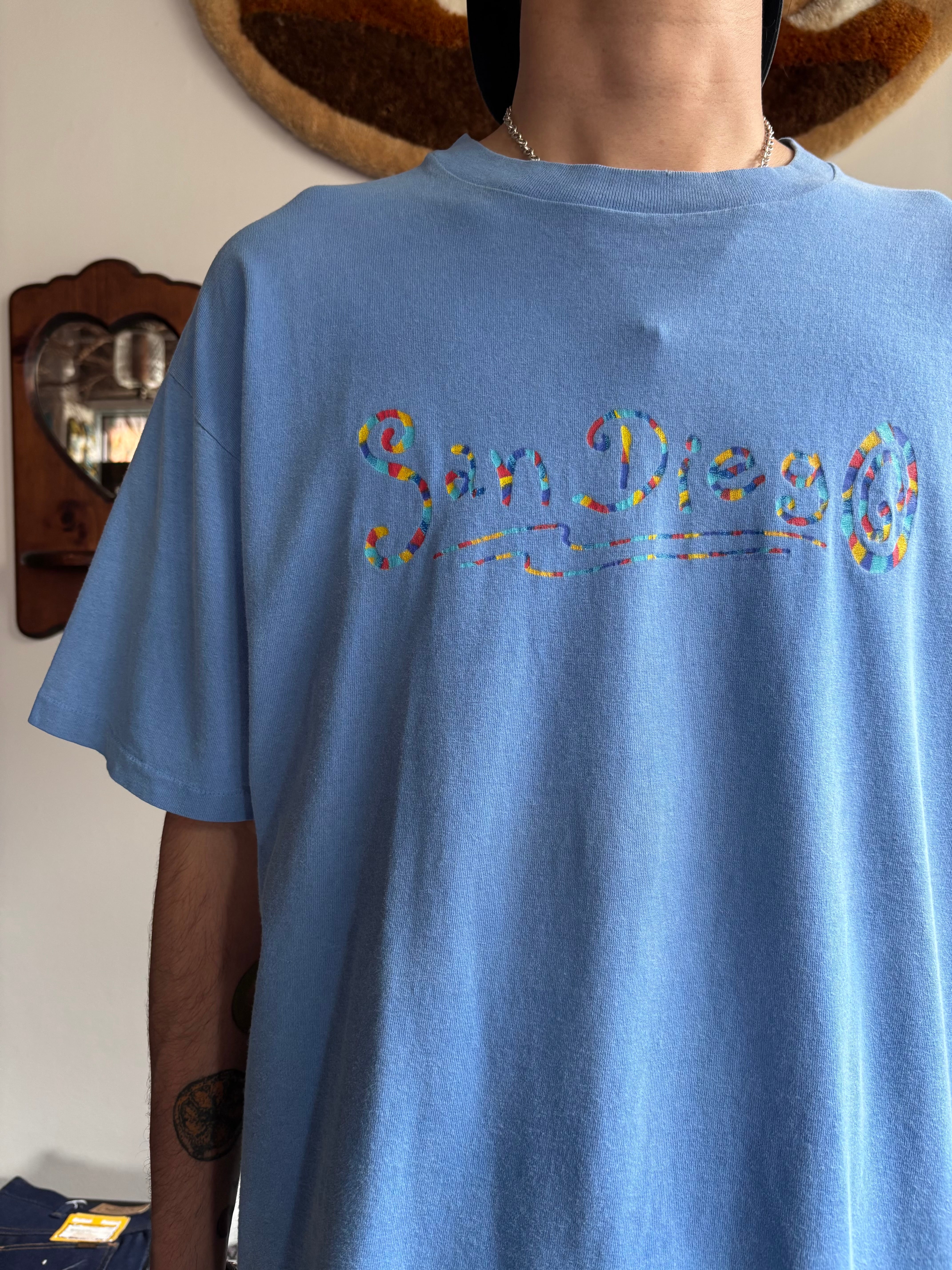 肉厚なコットン素材。珍しいマットな水色。ゆとりのあるリラックスフィット。90s USメイドのanvilボディ。シングルステッチ。洒落た印象のサンディエゴスーベニア。ボディカラーとグラフィックのバランスが完璧です。