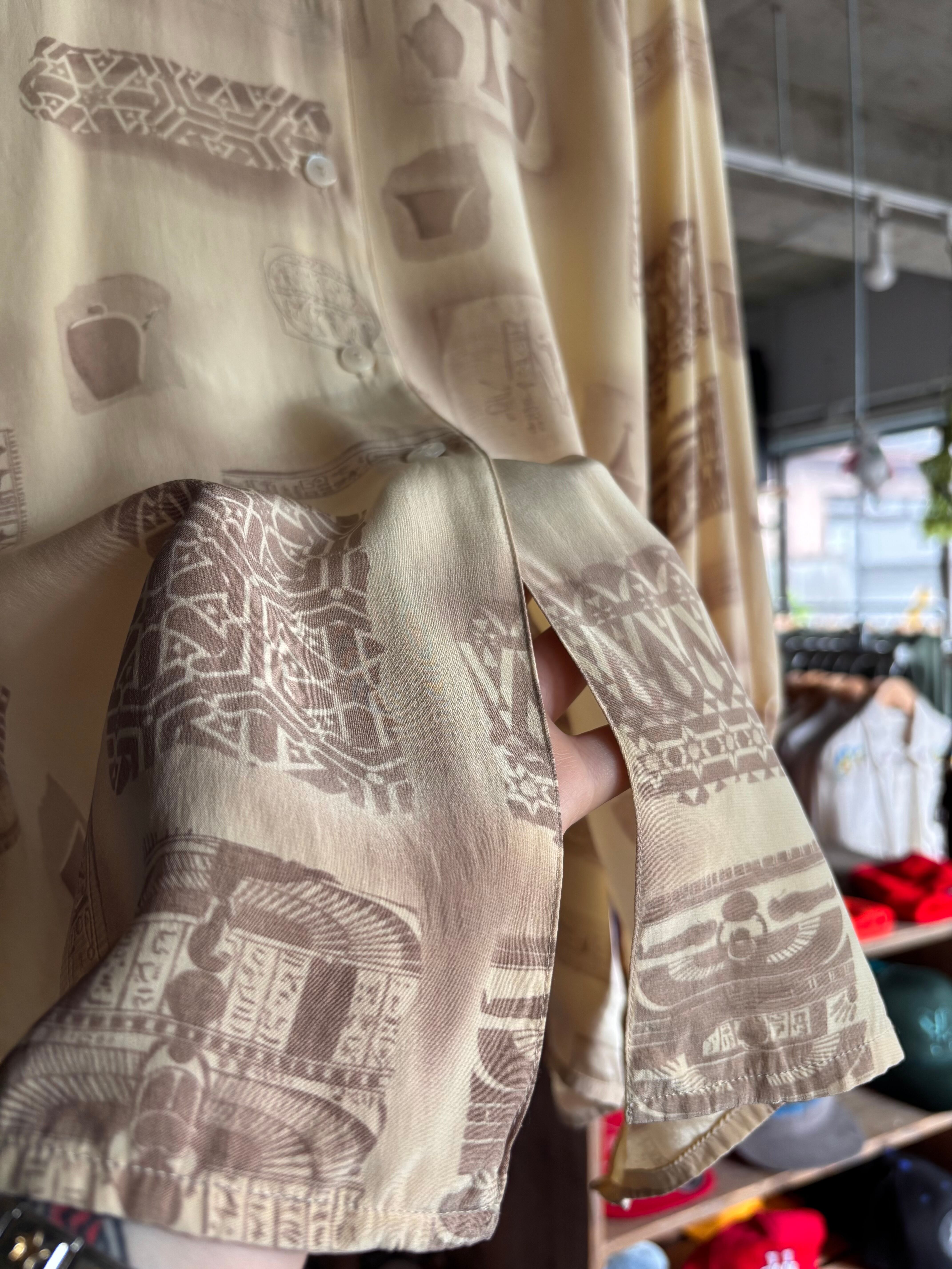 上質感抜群、落ち感があり軽く羽織れる100%シルク素材。壁画のような抽象モチーフ。ゆとりのあるリラックスフィット。カジュアルにも使える大人ブラウス。