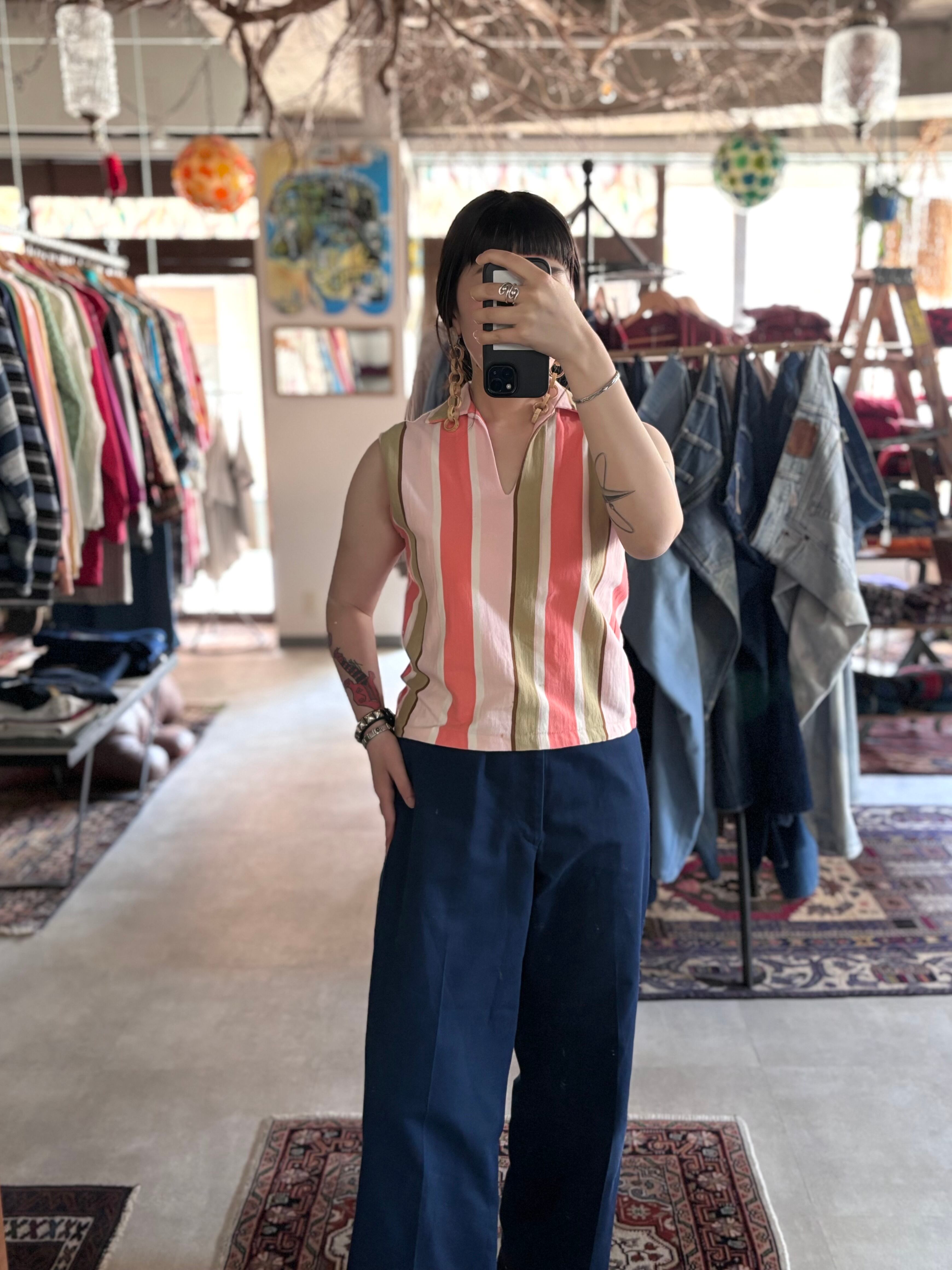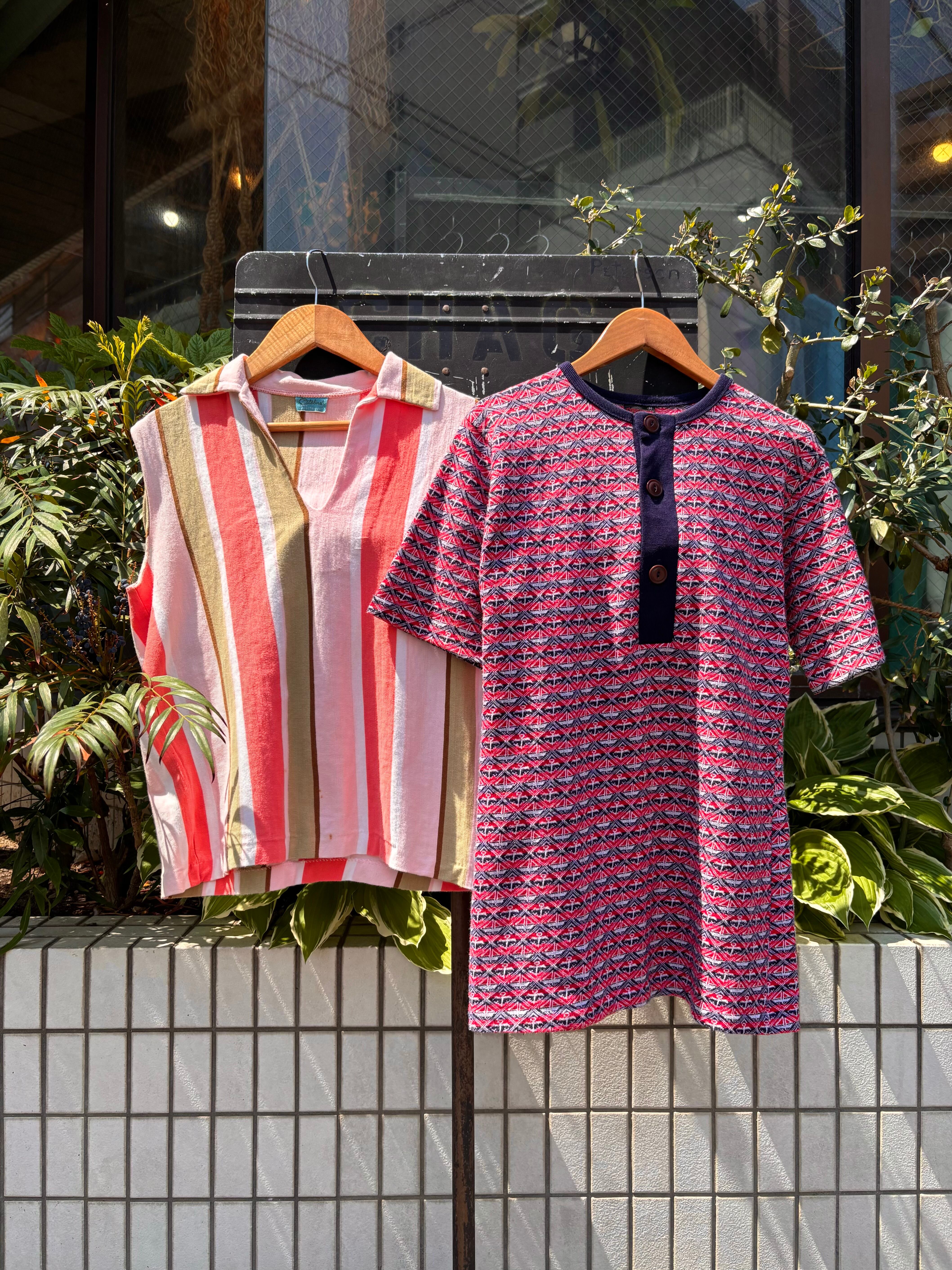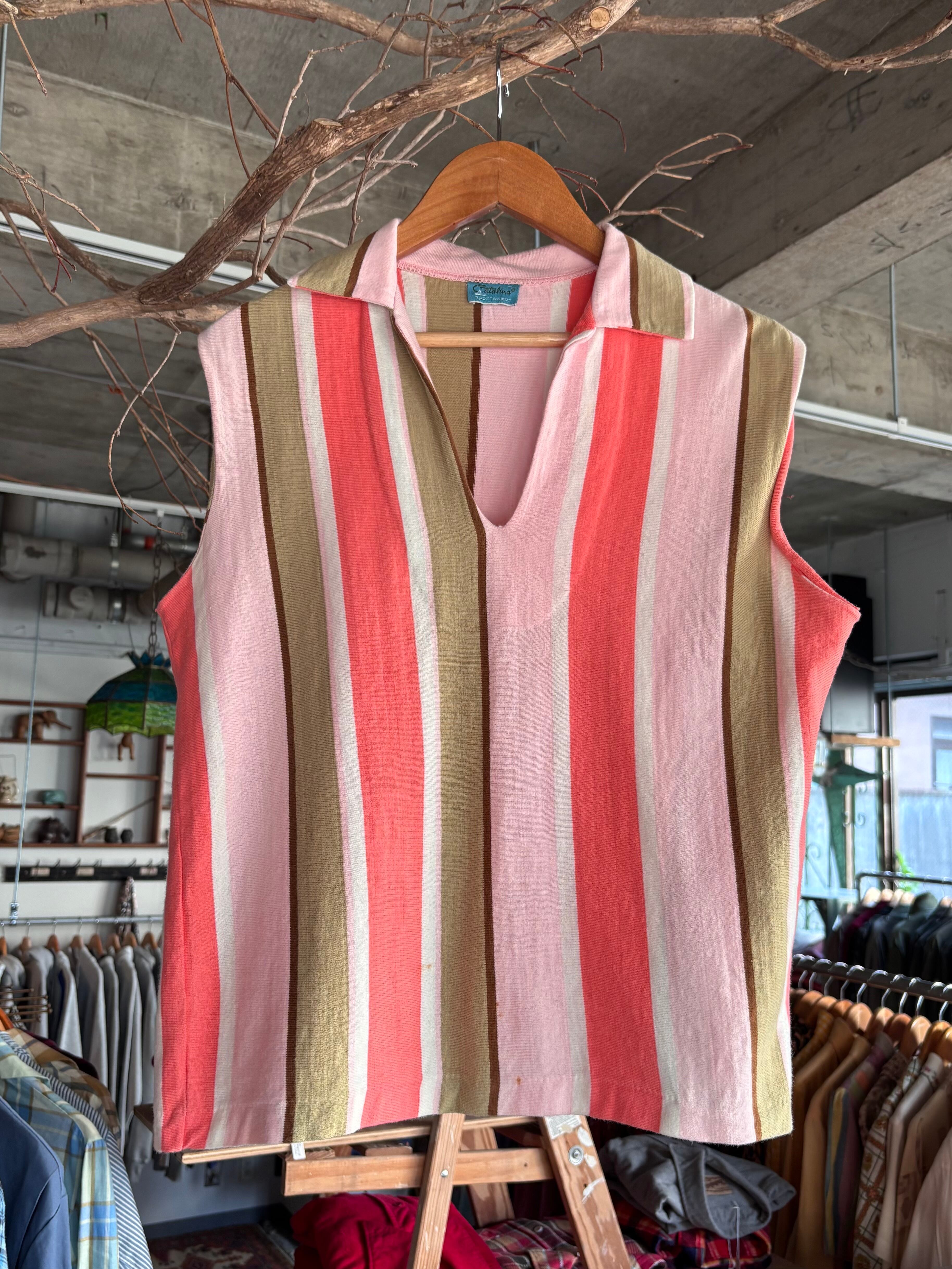 60年代製Catalinaのビンテージトップス。Tシャツ生地のようなコットン素材。身体のラインをそこまで拾わない、程よくゆとりのあるフィット感。60s当時らしい、抑えめトーンのピンク基調カラー。カジュアルなボトムスに合わせて1枚でコーデが決まります。なかなか出会えないビンテージトップス、おすすめです◎