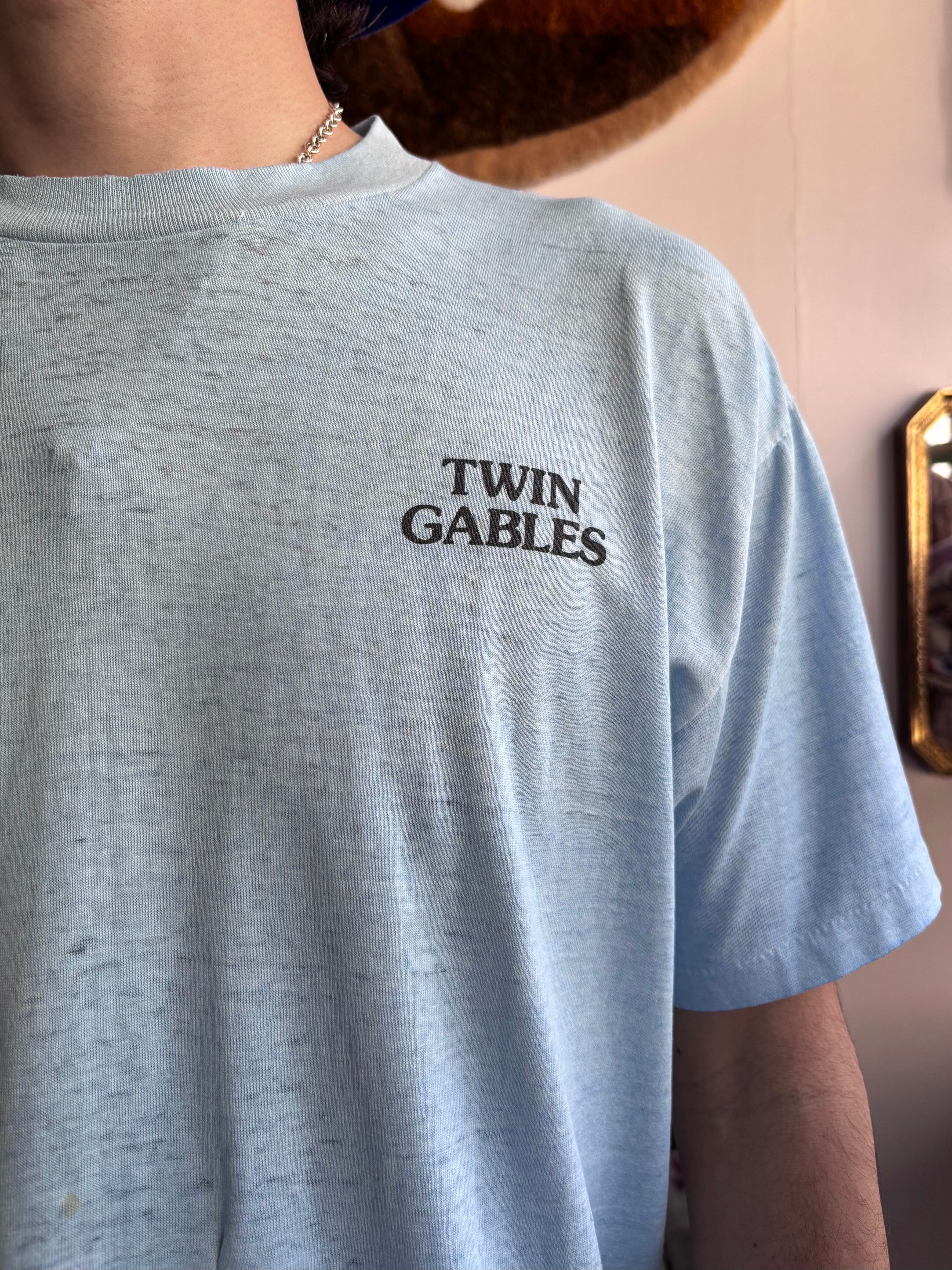 薄手のコットンポリ生地。レトロなヘザーサックスカラー。オーセンティックフィット。ガンズのアクセルローズ着用モデル。ビンテージ感抜群。[ I ate the worm (芋虫食べたよ)]