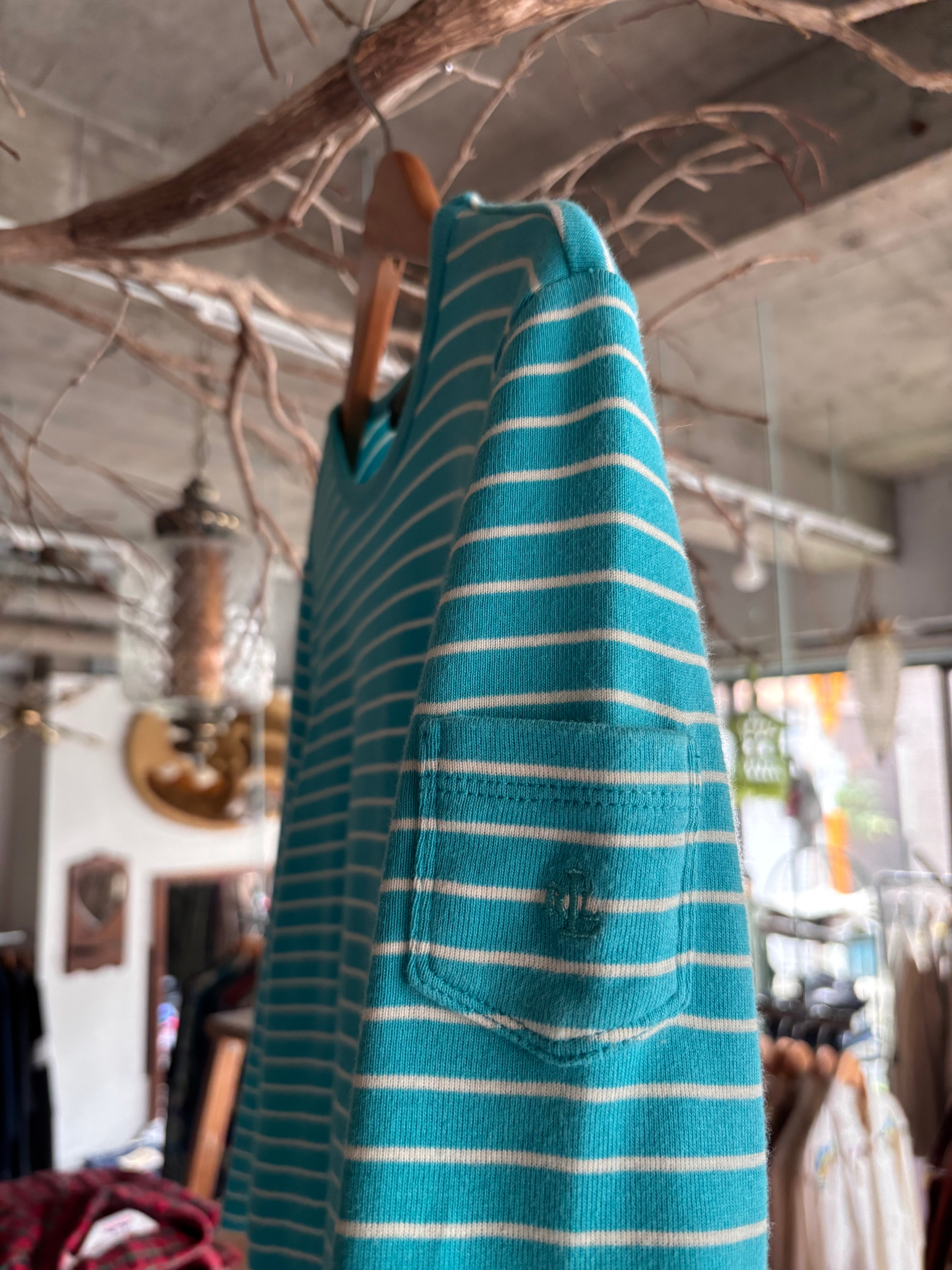 程よい厚みで滑らかな着心地のコットン生地。バインダーネック仕様で、左袖にパッチポケットが付くRalph Laurenらしい凝ったディティール。1枚で着ても映えるサックスブルーと白のボーダーカラー。すっきりと着こなし易い七分袖。コンパクトなサイズ感はインナーとしても使い勝手が良くおすすめです。