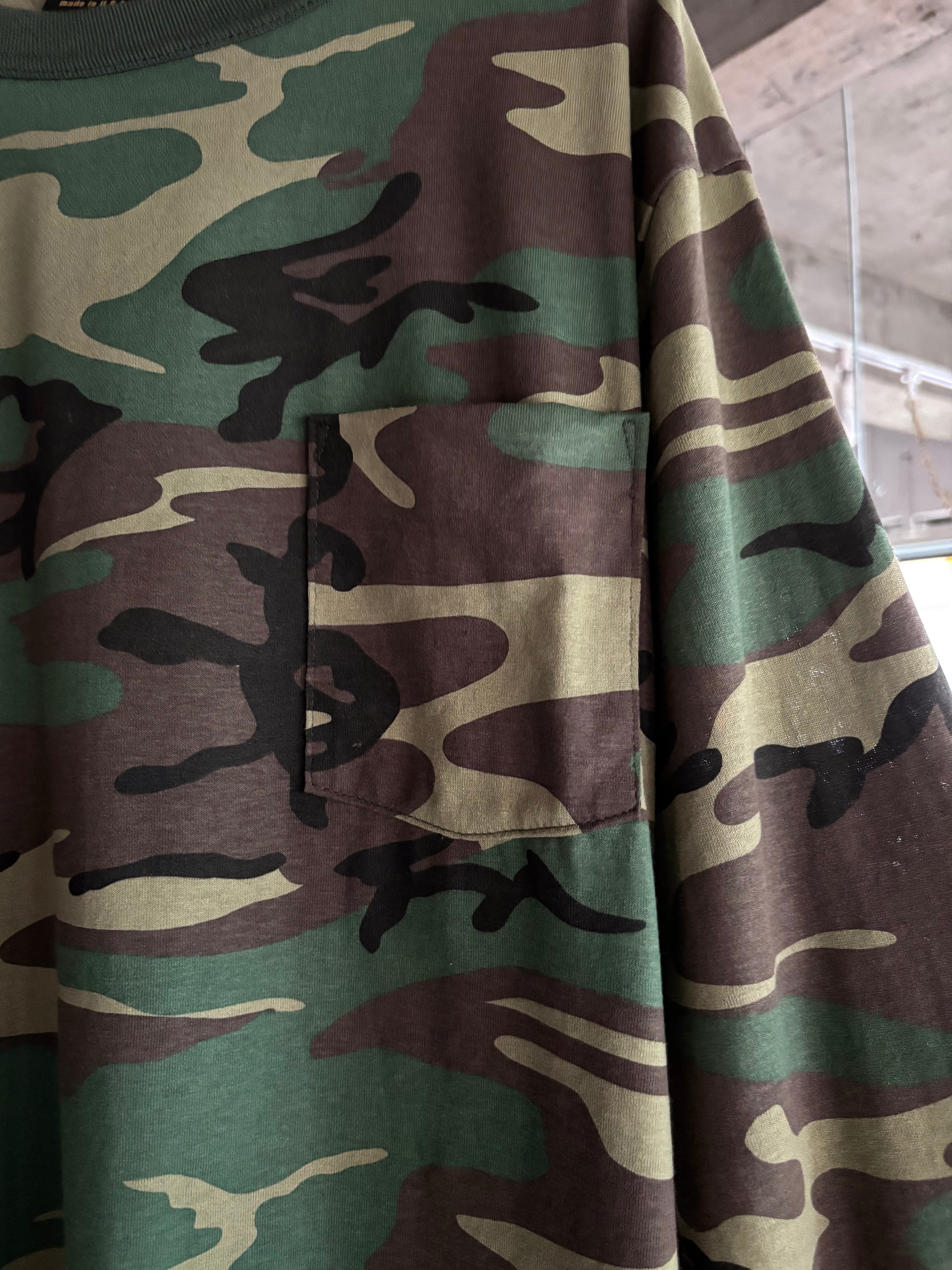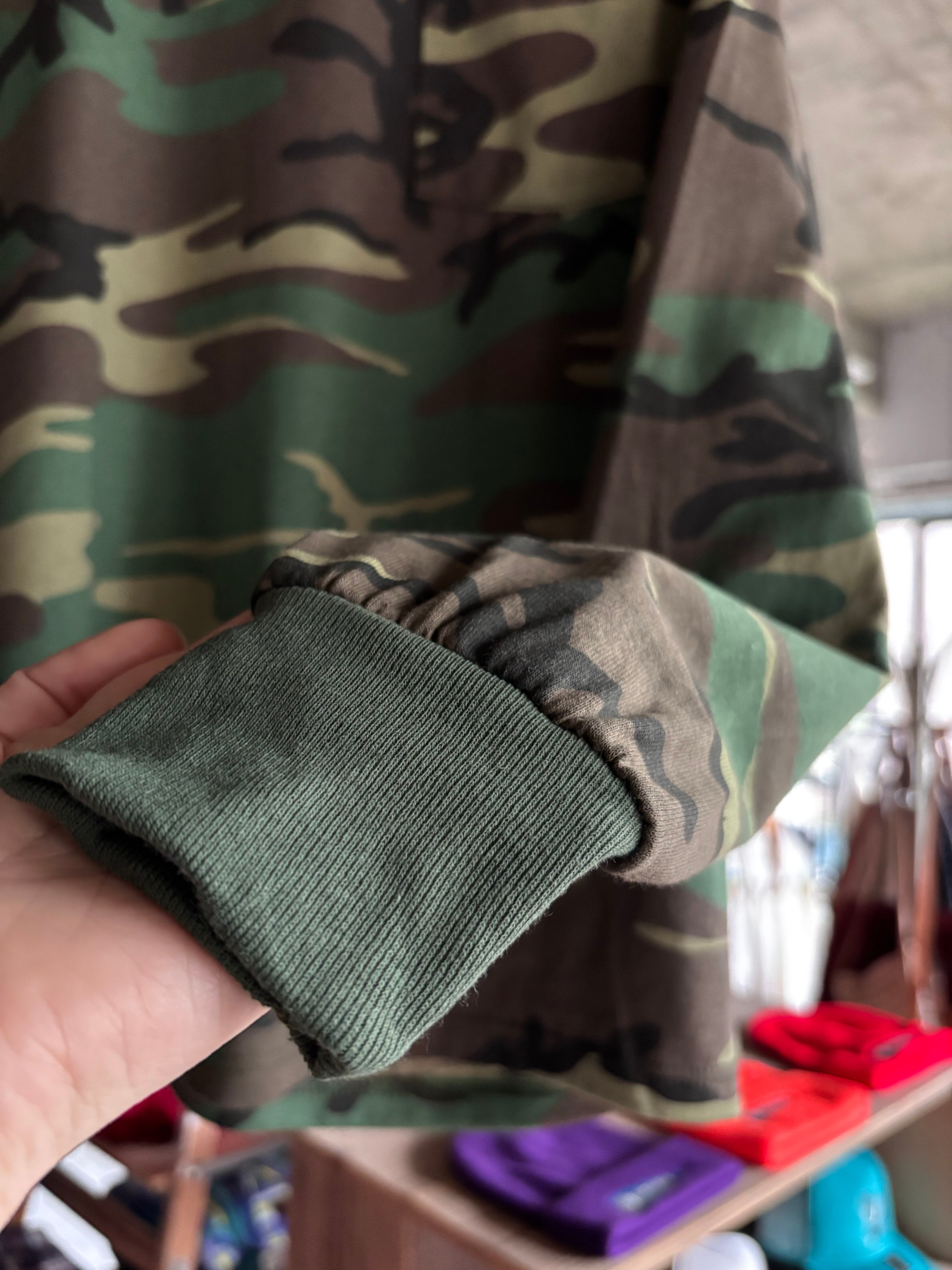 コットンポリ素材。王道のウッドランドカモフラージュ。程よくゆとりのあるフィット。USAメイドの未使用品。バインダーネックに、カーキのリブ。しっかりしたクオリティ。