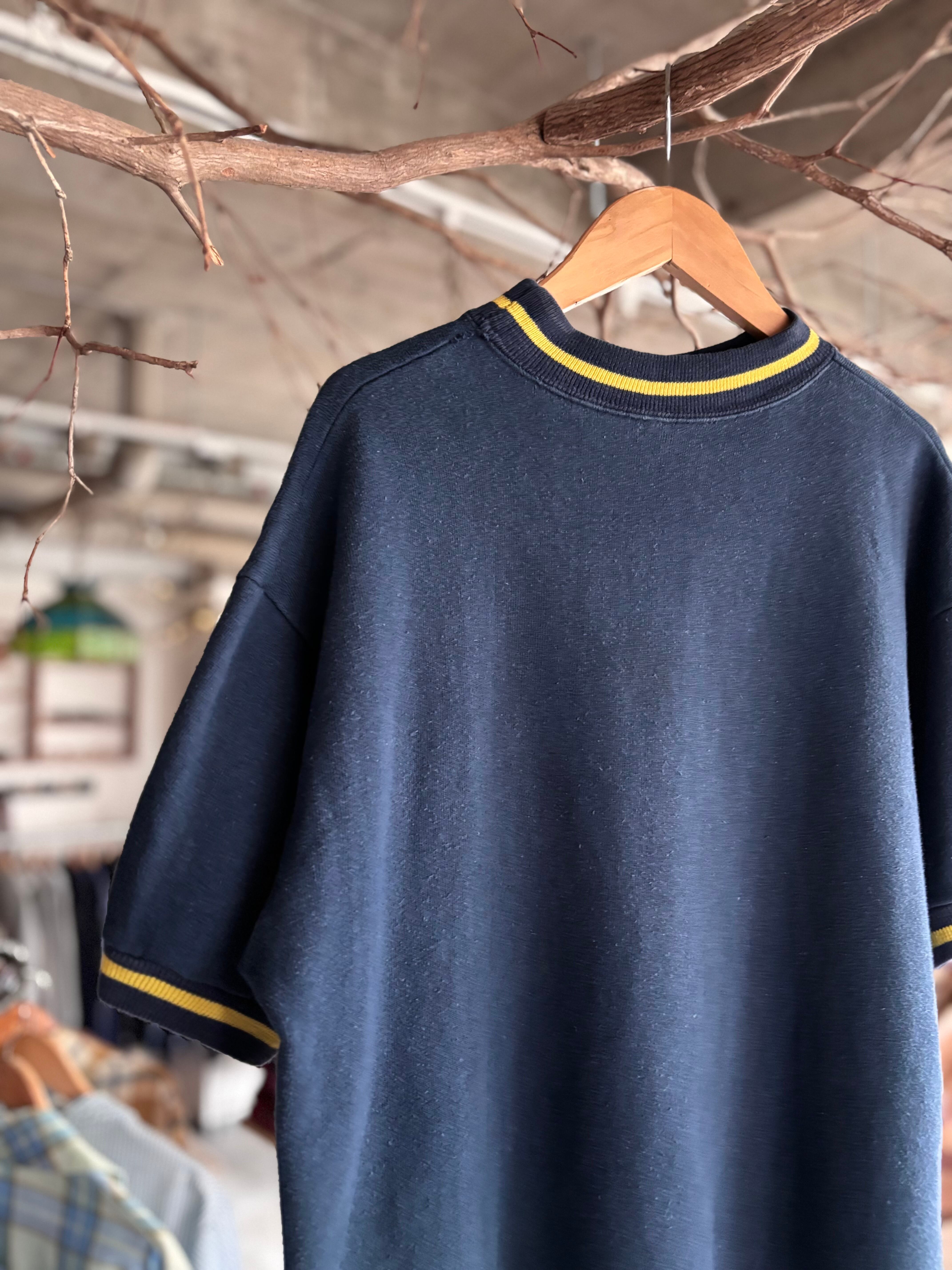 70年代製の半袖スウェット。セットインスリーブ仕様。着丈短めのリラックスフィット。着込まれクタッとやわらかいコットン生地。ネックと袖リブのイエローラインが効いてます。コンパクトな丈が様々なボトムスと合わせやすく、1枚で着るのはもちろんレイヤードコーデにも。ビンテージアイテムならではのクラシカルな雰囲気がお好きな方におすすめです◎