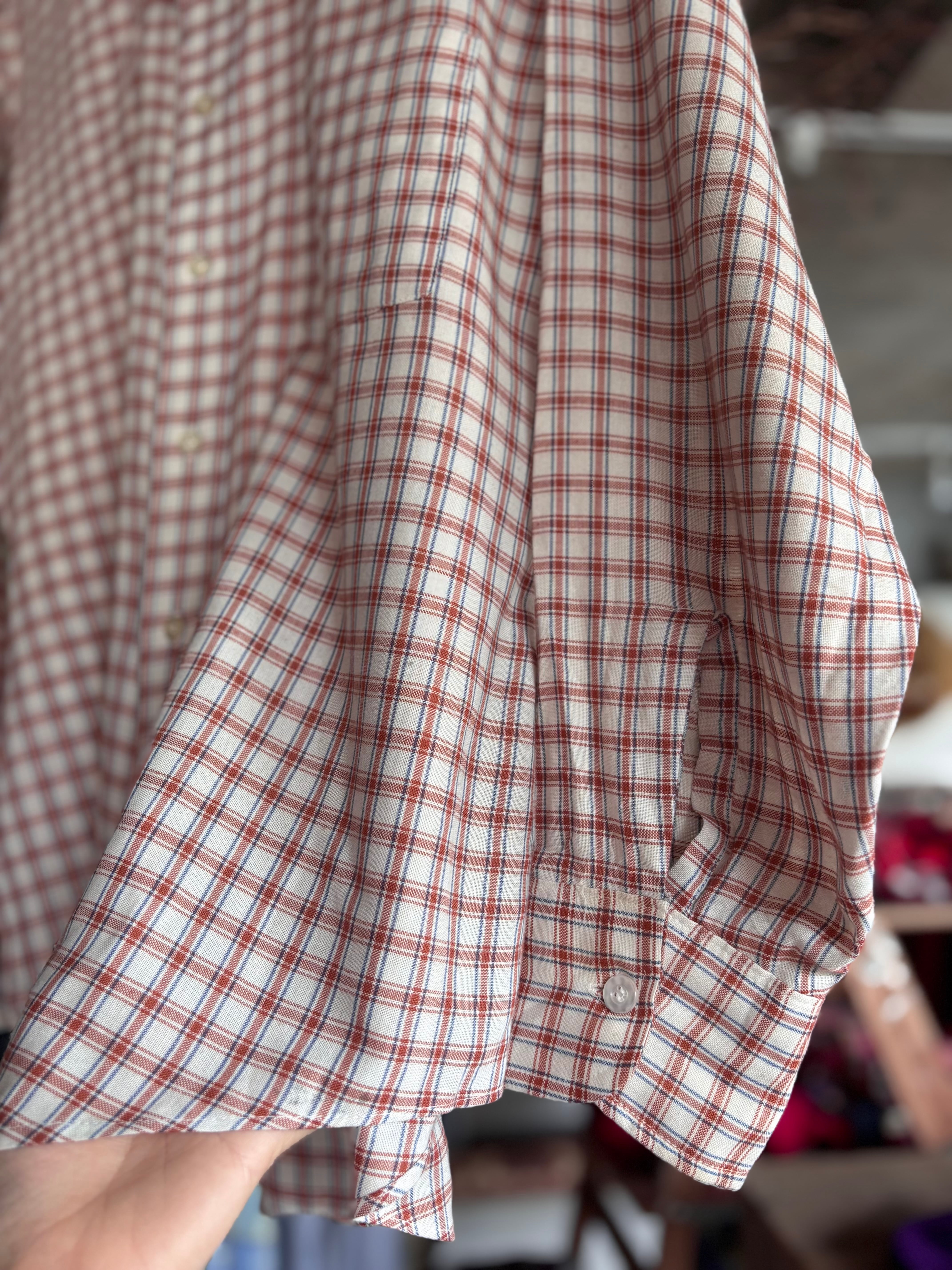 薄手のポリコットン素材。レトロカラーのファブリック。オーセンティックフィット。大きめの襟のBD仕様。70sのVAN HEUSEN製。OLD感抜群の1着。
