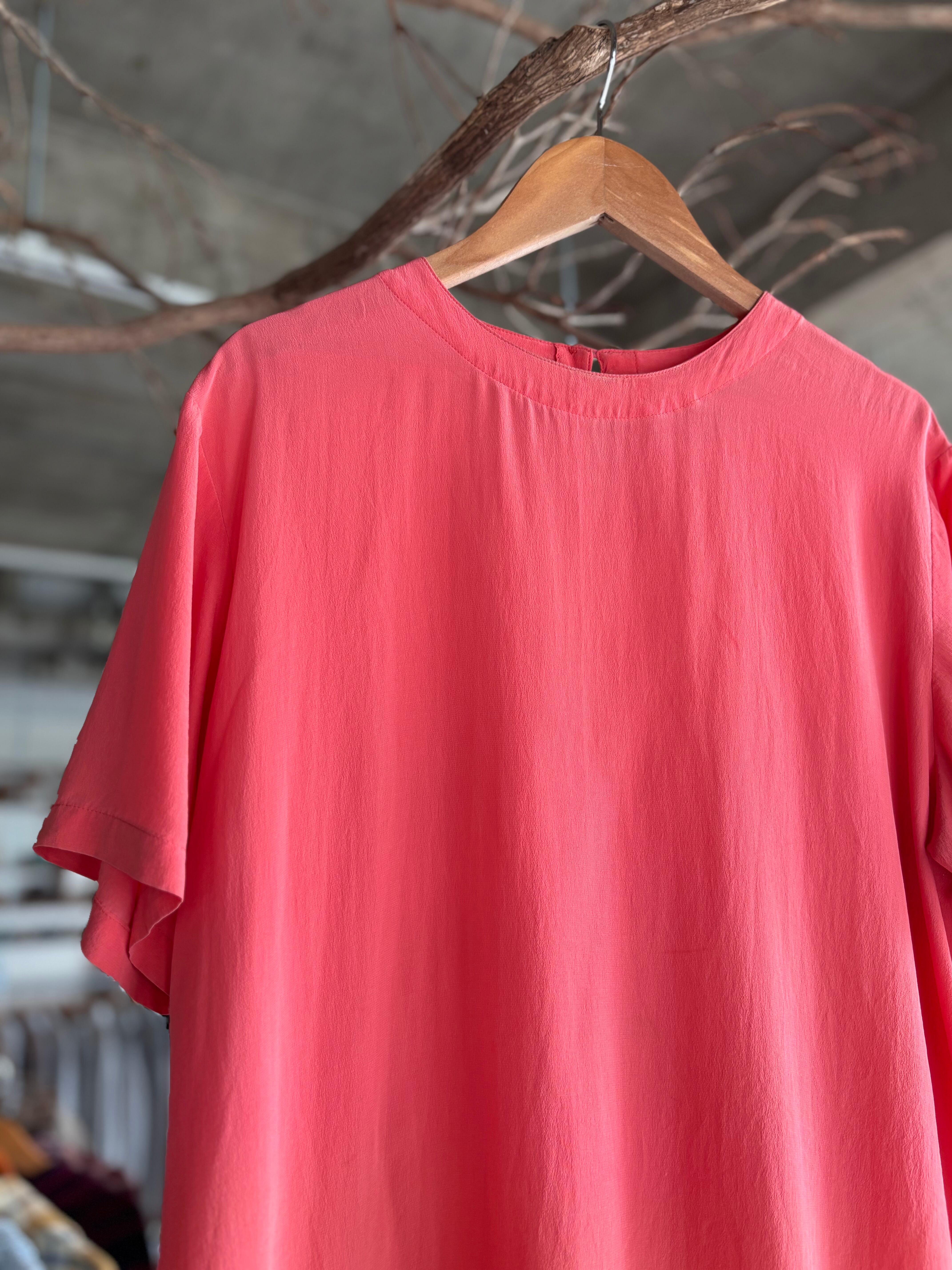 上質感抜群の100%シルク素材。コンパクトなフィッティング。様々なボトムスに合わせ易いコーラルピンク。バックネックにループボタン仕様。カジュアルにも使えるおすすめの大人ブラウスです◎