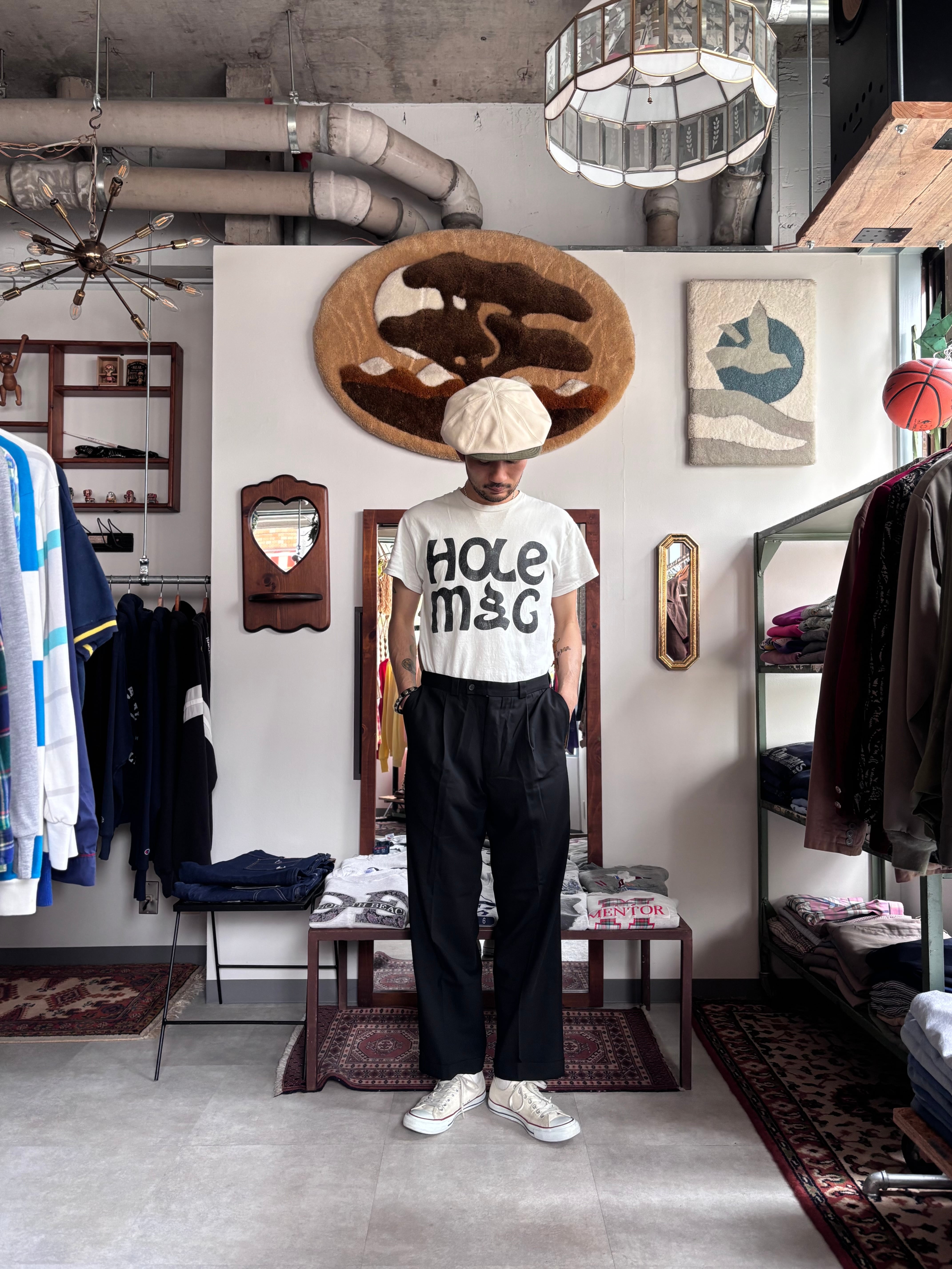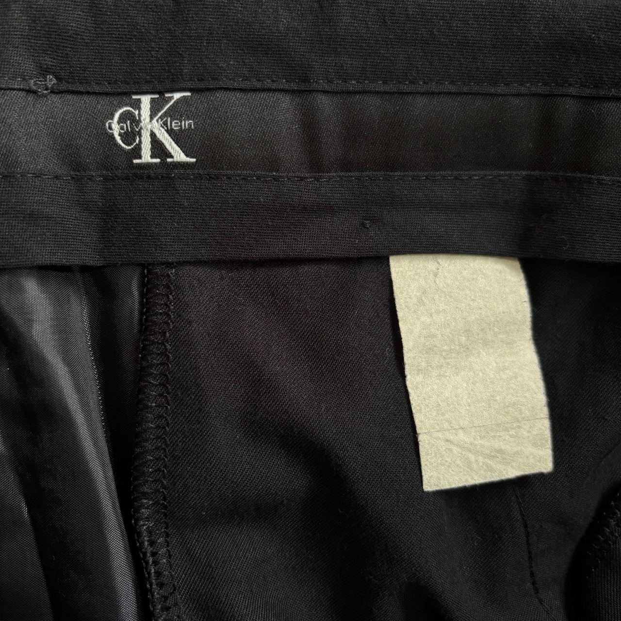 ポリ混のサマーウール素材。すこし光沢のあるブラックカラー。2タックのストレート。裾はダブル仕様。90s CALVIN KLEIN製。ドレス寄りな印象。スーツ感も出ないので、Tシャツ1枚でもハマります。