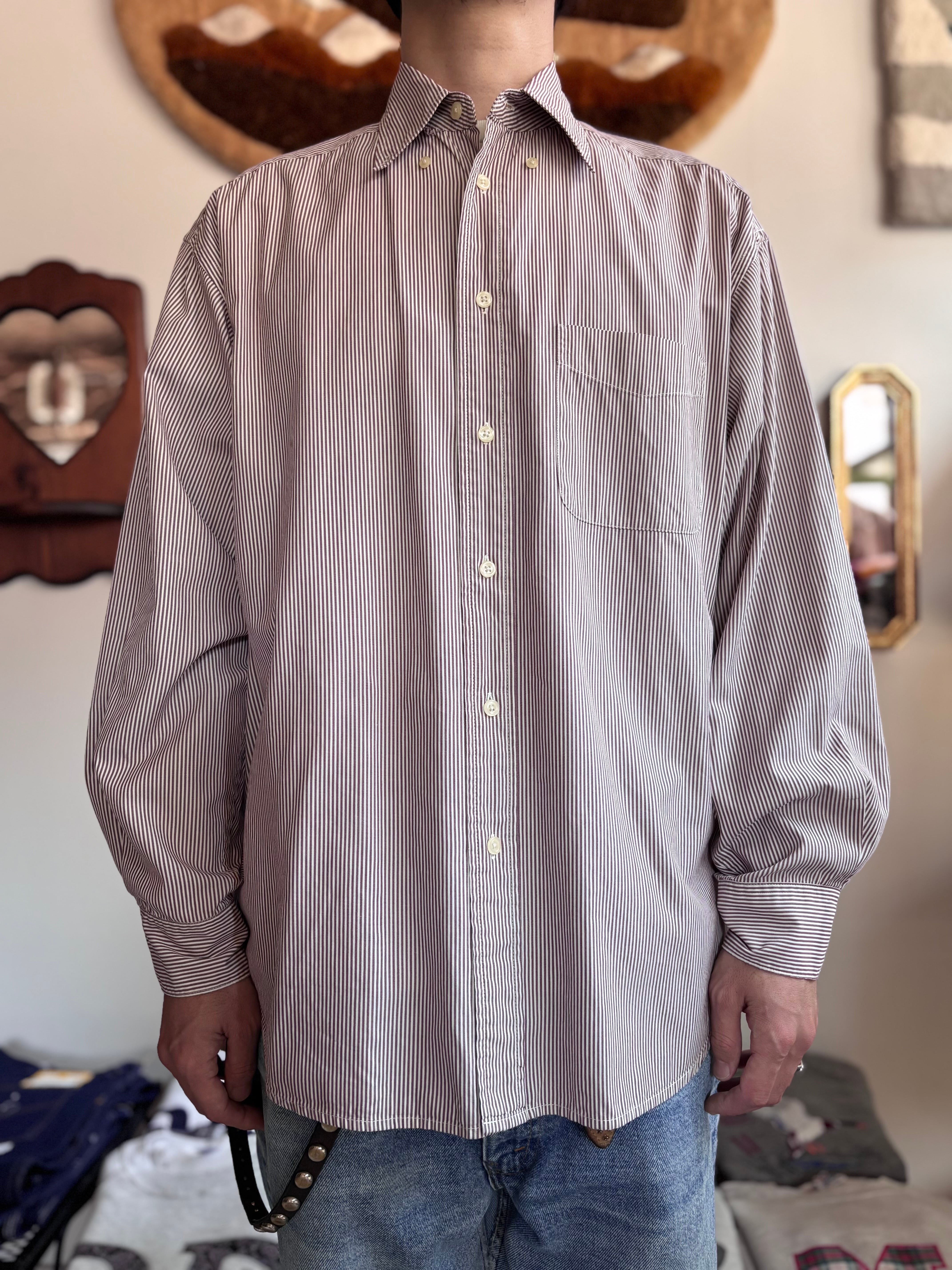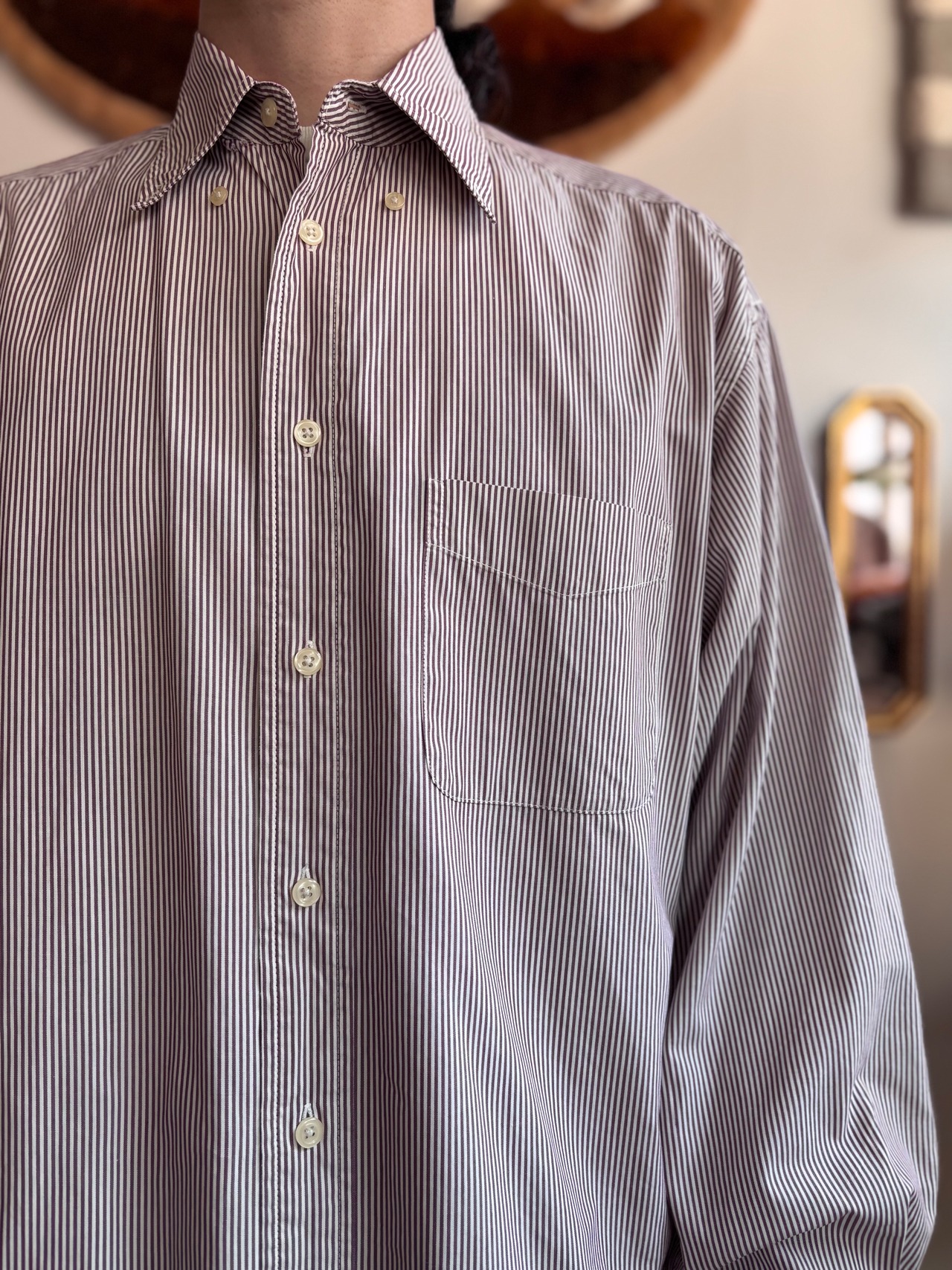 さらりとした 2plyコットンの上質生地。細ピッチのストライプパターン。ゆとりのあるフィット。背面にダーツ入り、締まりのあるシルエット。上品な印象のバナリパ製。
