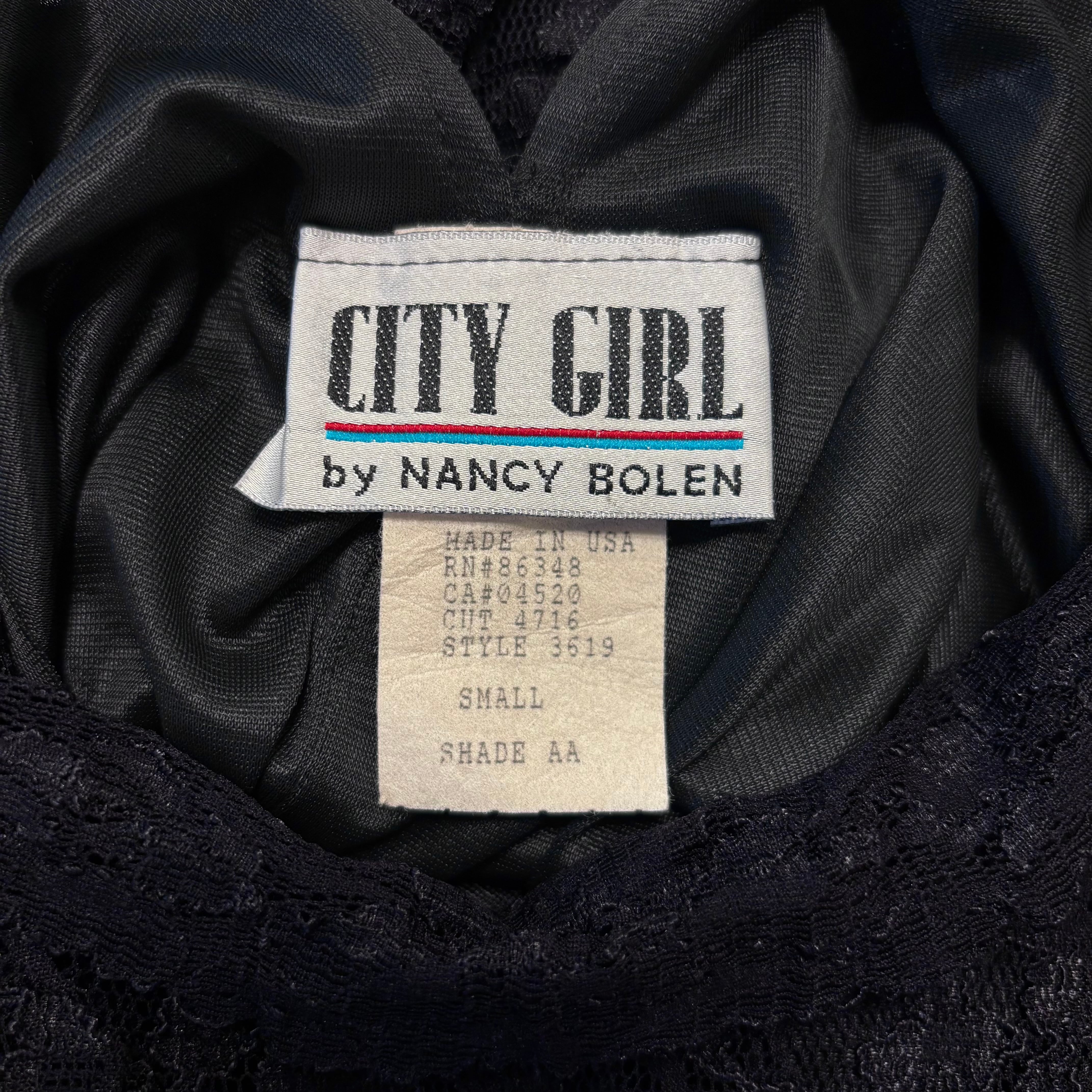 コンパクトなサイズ感のレーストップス。80sのアメリカ製。伸縮性のある生地感。上品な印象のハイネックデザイン。プルオーバータイプで、バックジップ仕様。透け防止の薄手インナー付き。お呼ばれコーデはもちろんカジュアルなボトムスと合わせて普段使いにも◎。