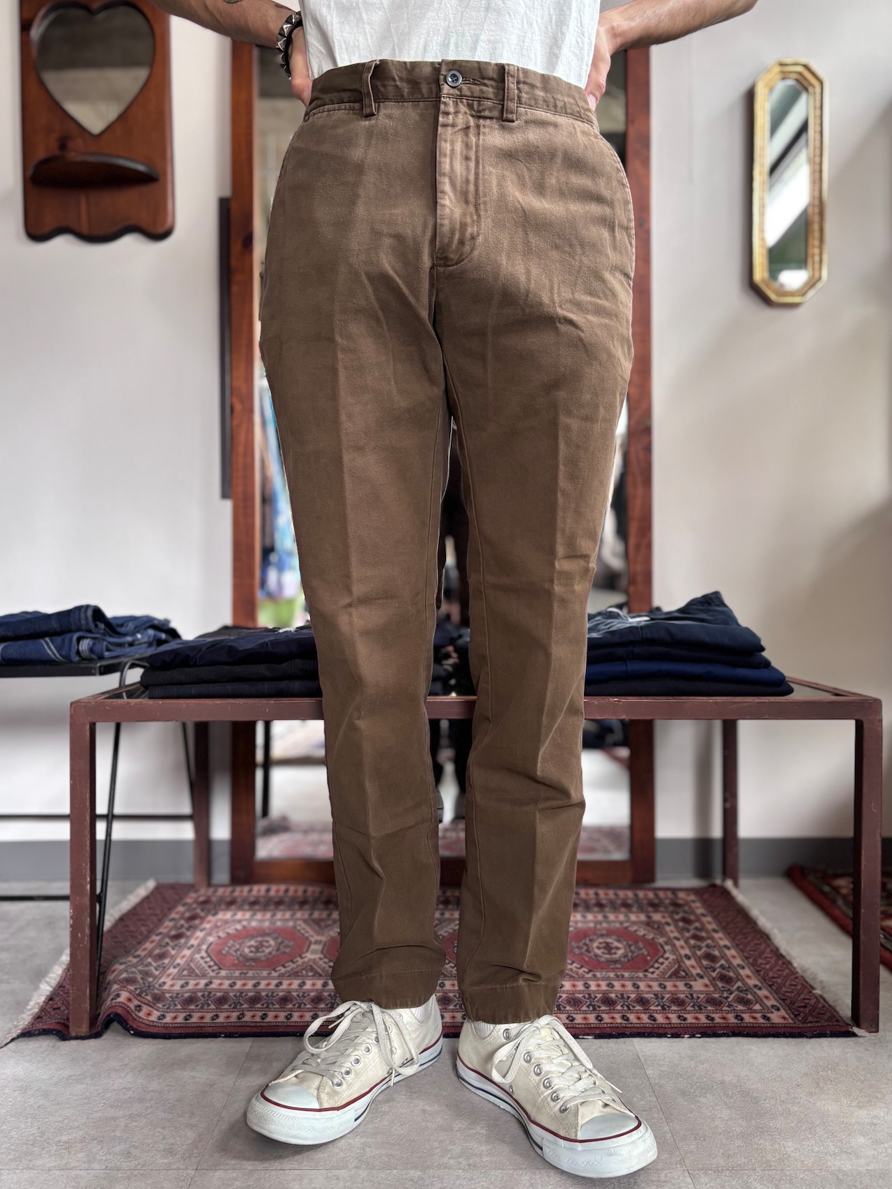 厚手のコットンツイル素材。レトロなモカブラウンカラー。深めの股上に、テーパードシルエット。クラシカルな印象のラルフチノ。