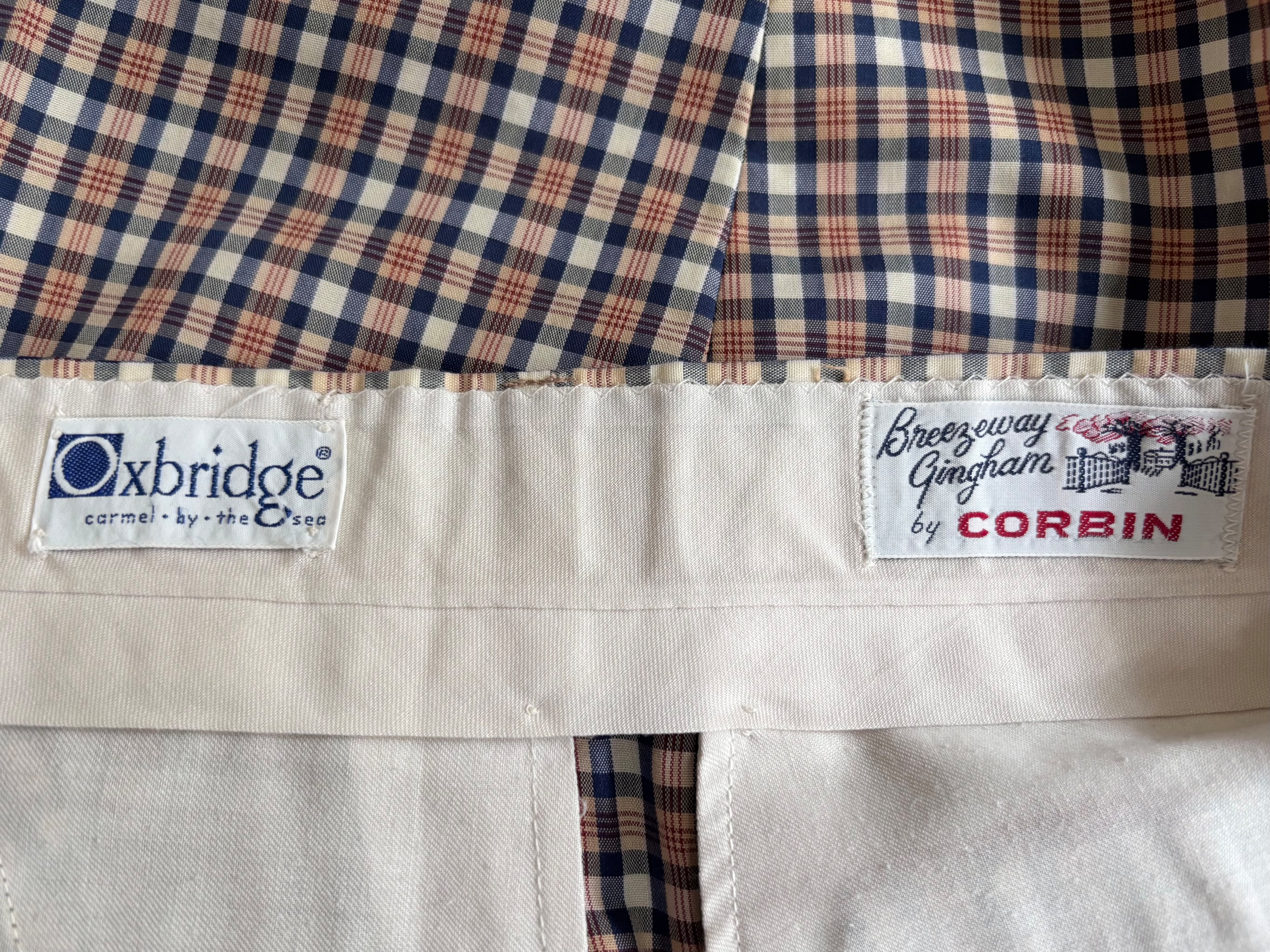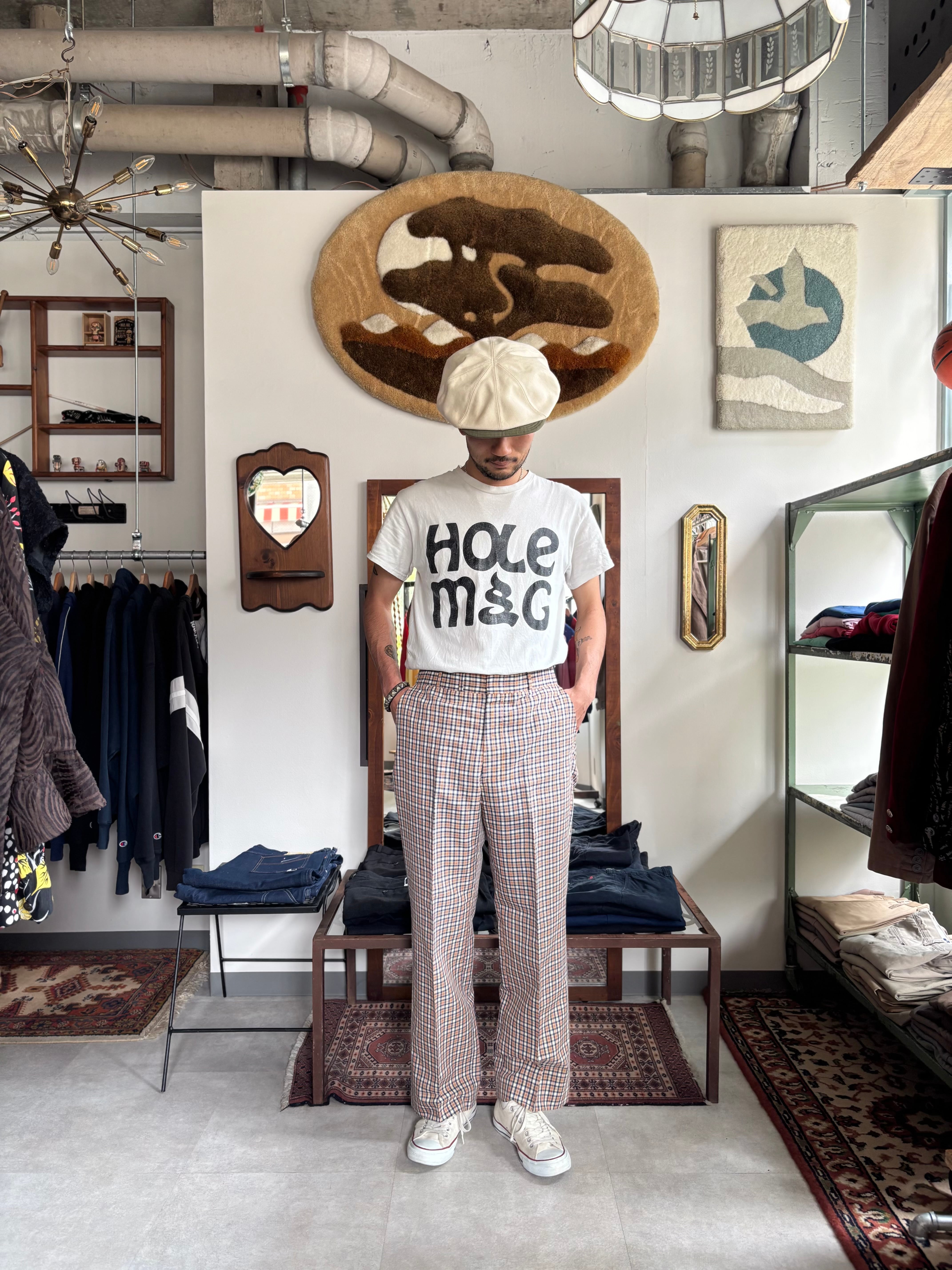 軽めのコットンポリ素材。老舗パンツメーカーcorbinオリジナルのbreezeway gingham なる、レトロなパターンのファブリック。股上深めの、太めストレートシルエット。棒TALON仕様。クラシカルな印象のスラックス。