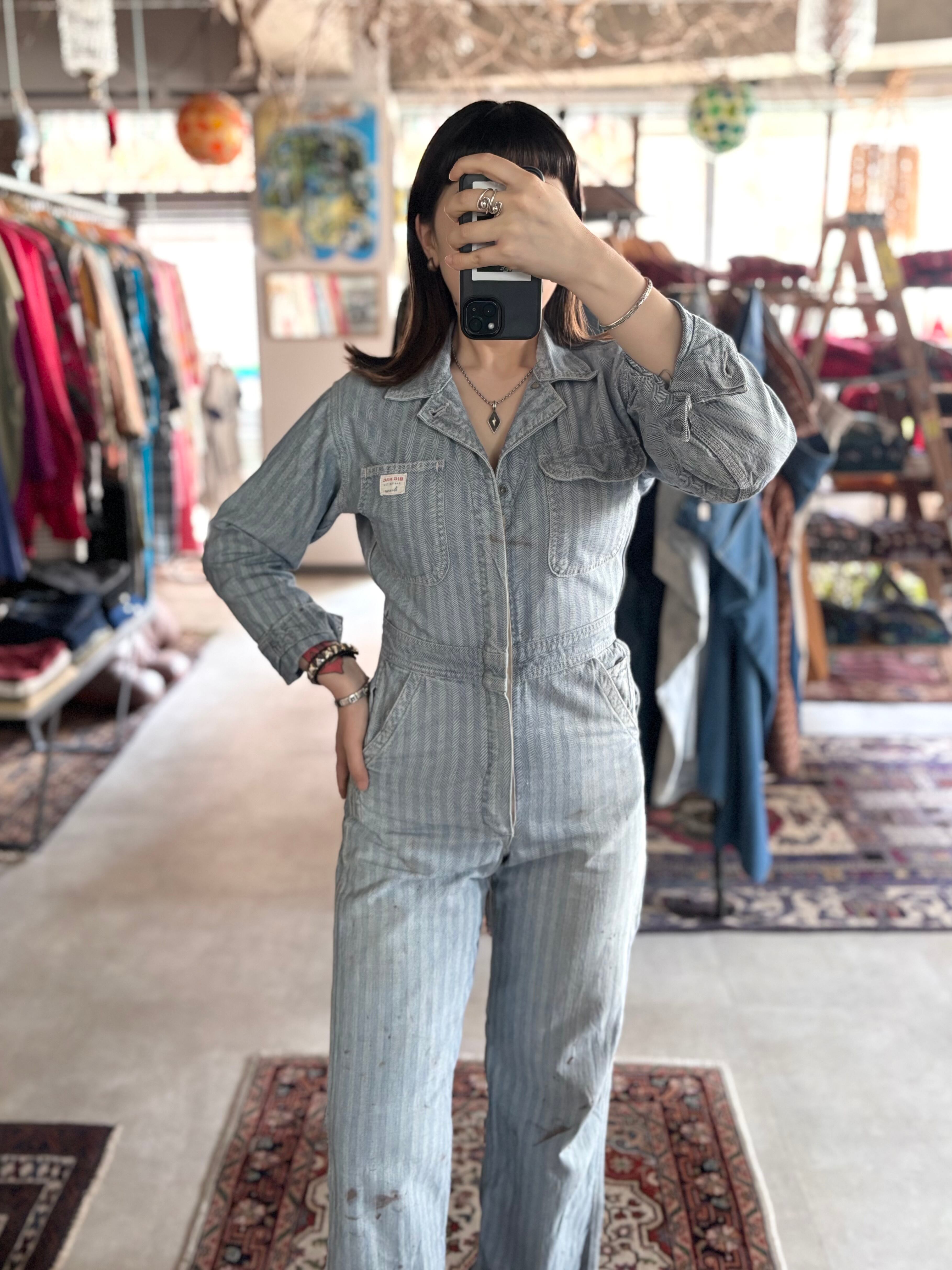 厚みのあるコットンヘリンボーン素材。オーセンティックなオールインワンのディテール。ワークウェアらしい無骨さがありながら、女性が着こなし易いボーイズサイズ。GRIPPER ZIPPER仕様。60s BIG MACのビンテージモデル。幅広いスタイルで楽しめる大人のジャンプスーツ。