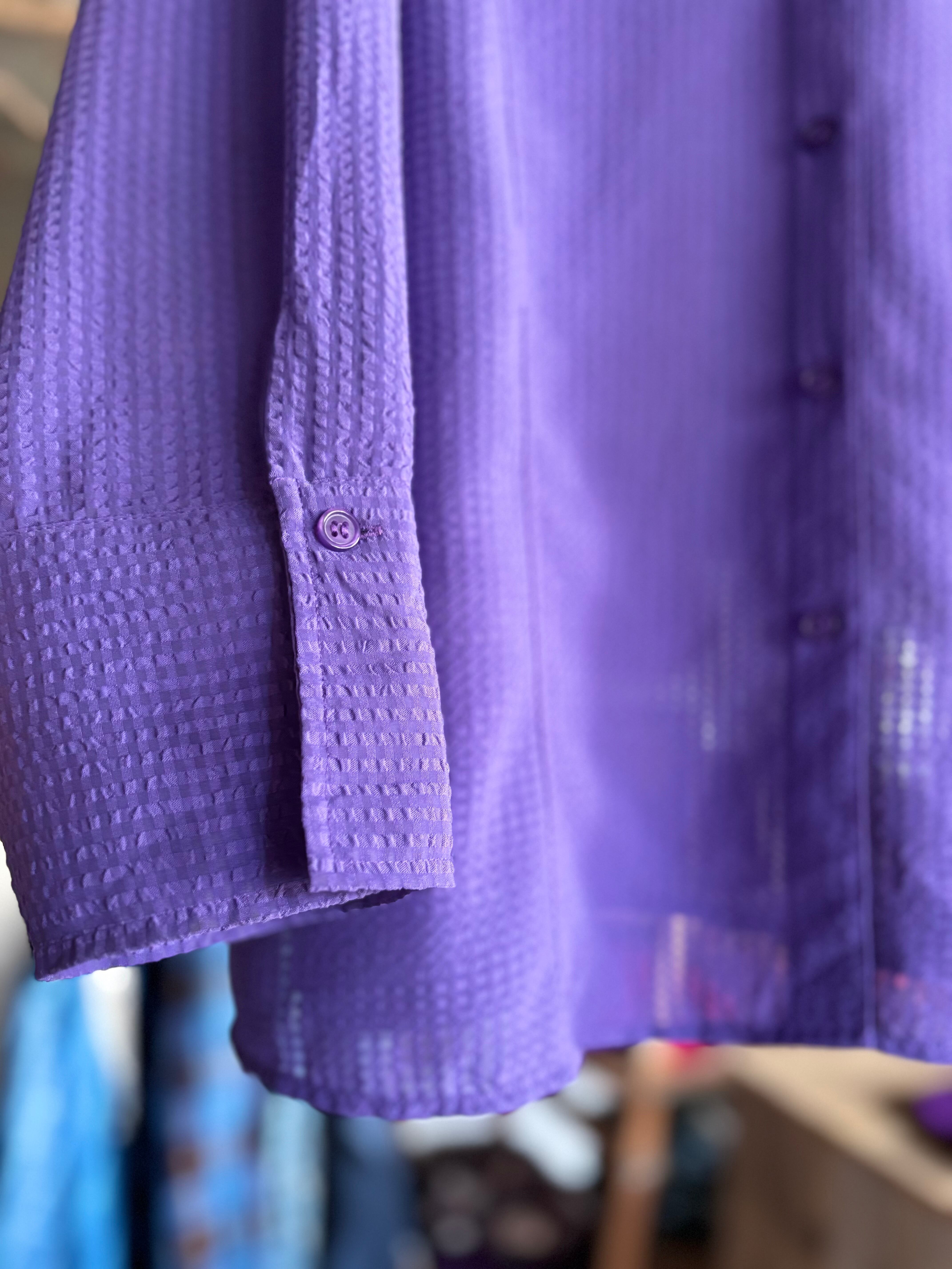 鮮やかなパープルのオープンカラーブラウス。ゆとりのあるリラックスシルエット。軽い着心地のシアサッカー生地。胸元がざっくりと開いているデザインなので、ボタンを閉めて着用する場合でもキャミソールやタンクトップなど、インナーと組み合わせてのご着用をお勧めします。たっぷりの身幅に対し、コンパクトな着丈で様々なコーディネートに合わせ易いです。