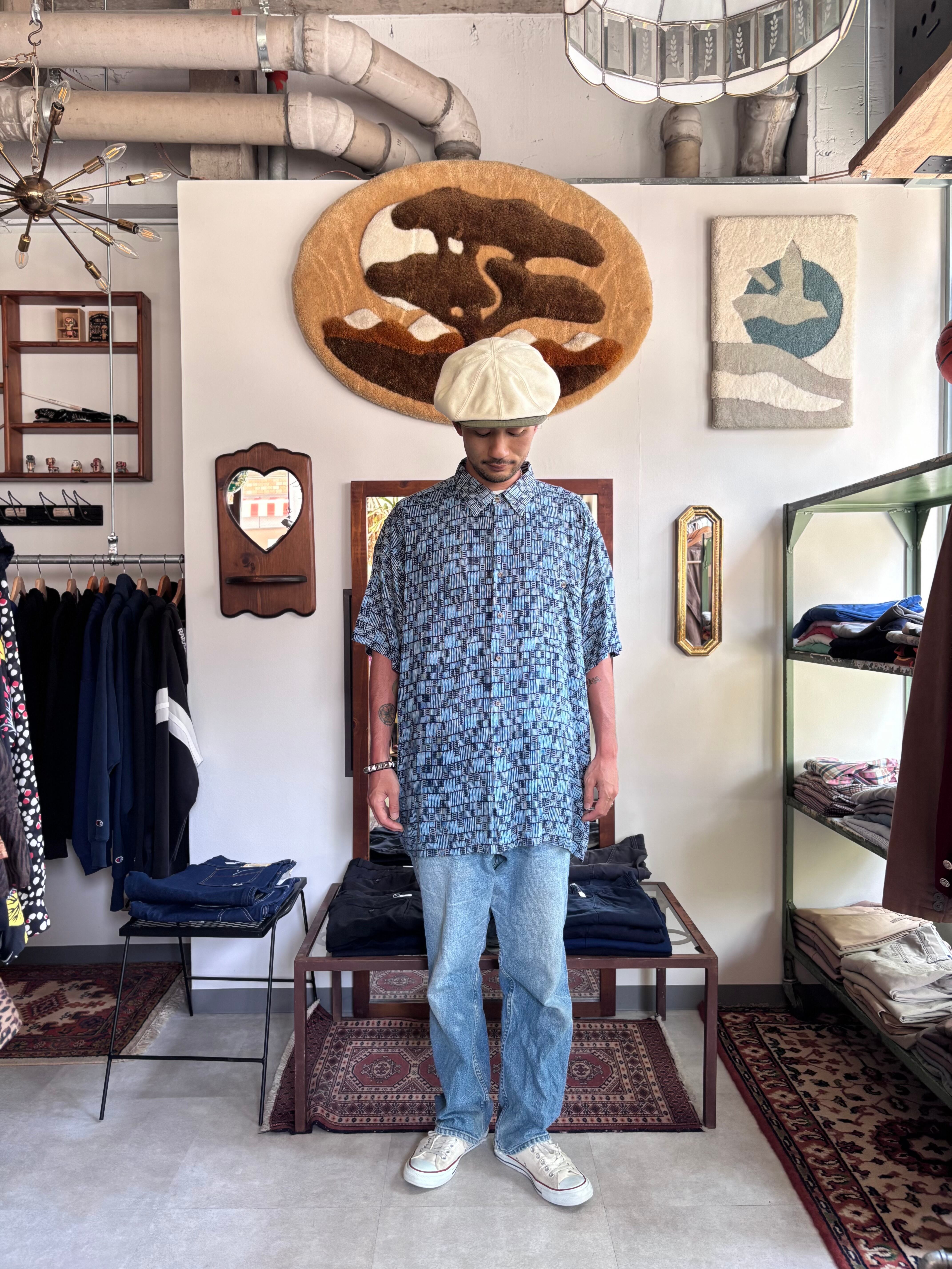 しっかりしたレーヨン素材。ステンドガラスのようなパターン。リラックスフィット。使用感の少ない綺麗なコンディション。