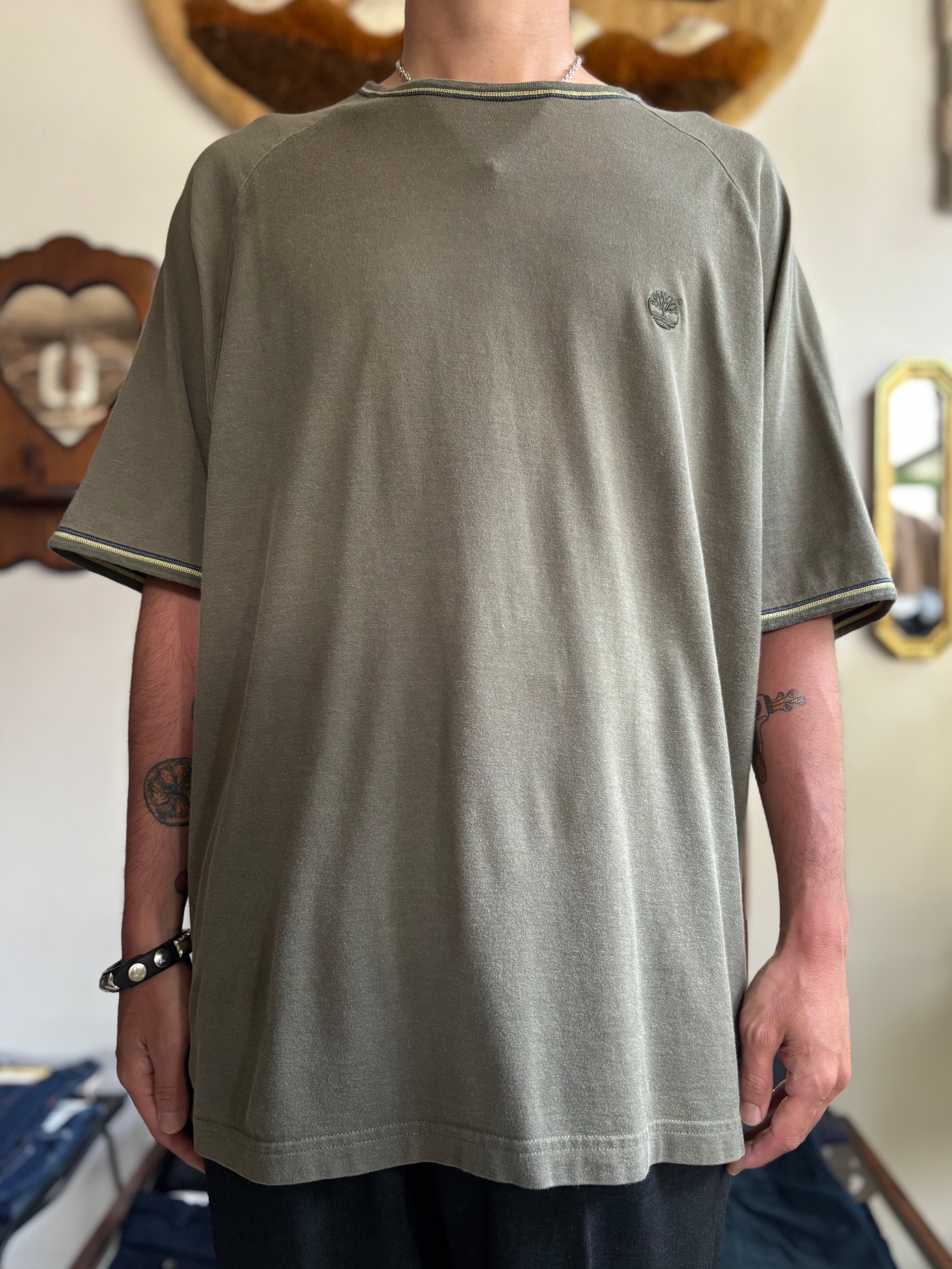 柔らかめのコットン生地。お洒落なトーンの大人オリーブカラー。リラックスフィット。ラグランスリーブ仕様で、ネックと裾にはnavy×yellowのステッチ入り。洗練されたUSストリート感覚を持つOLDティンバーランド製。お洒落感抜群でおすすめです。