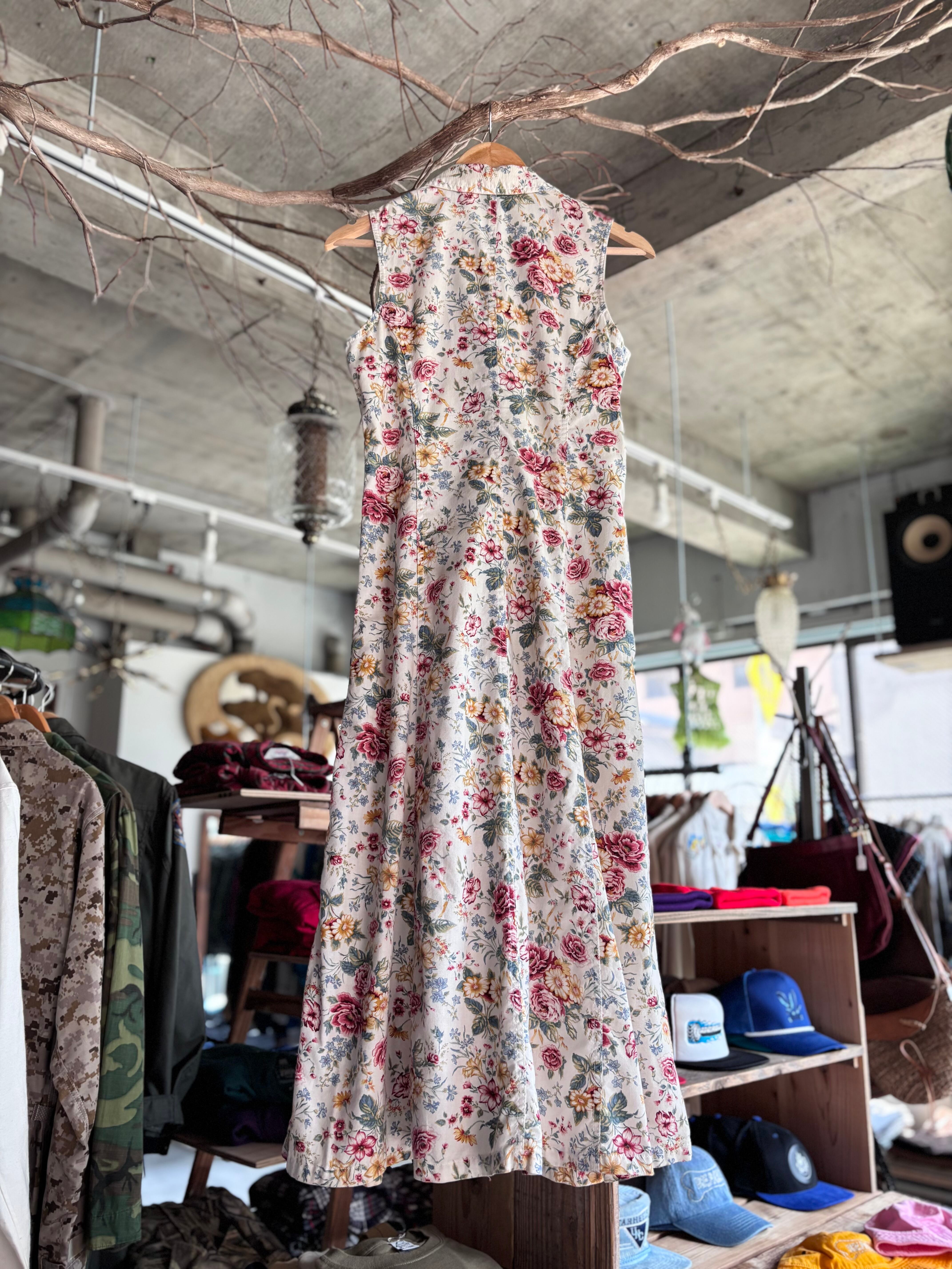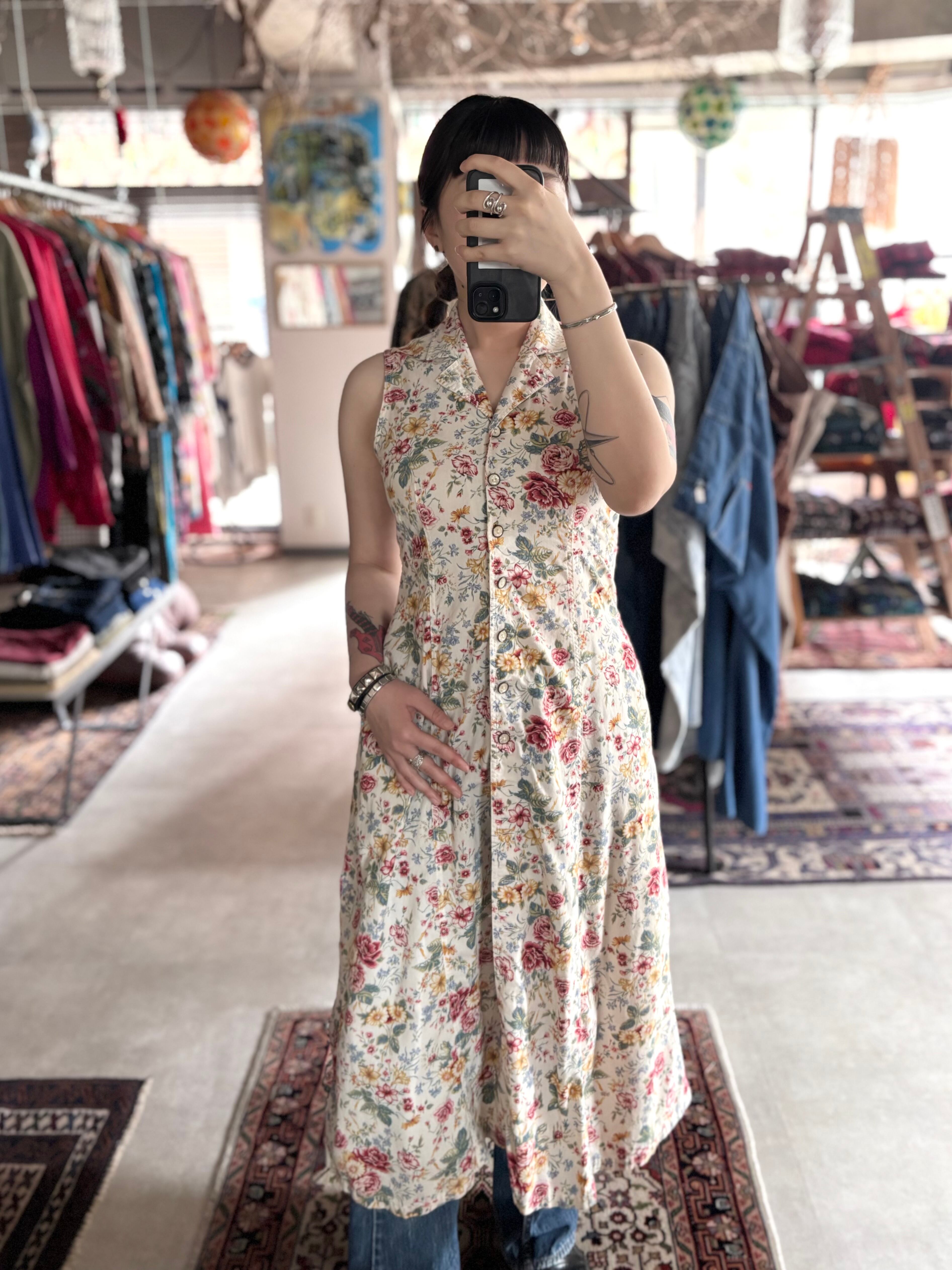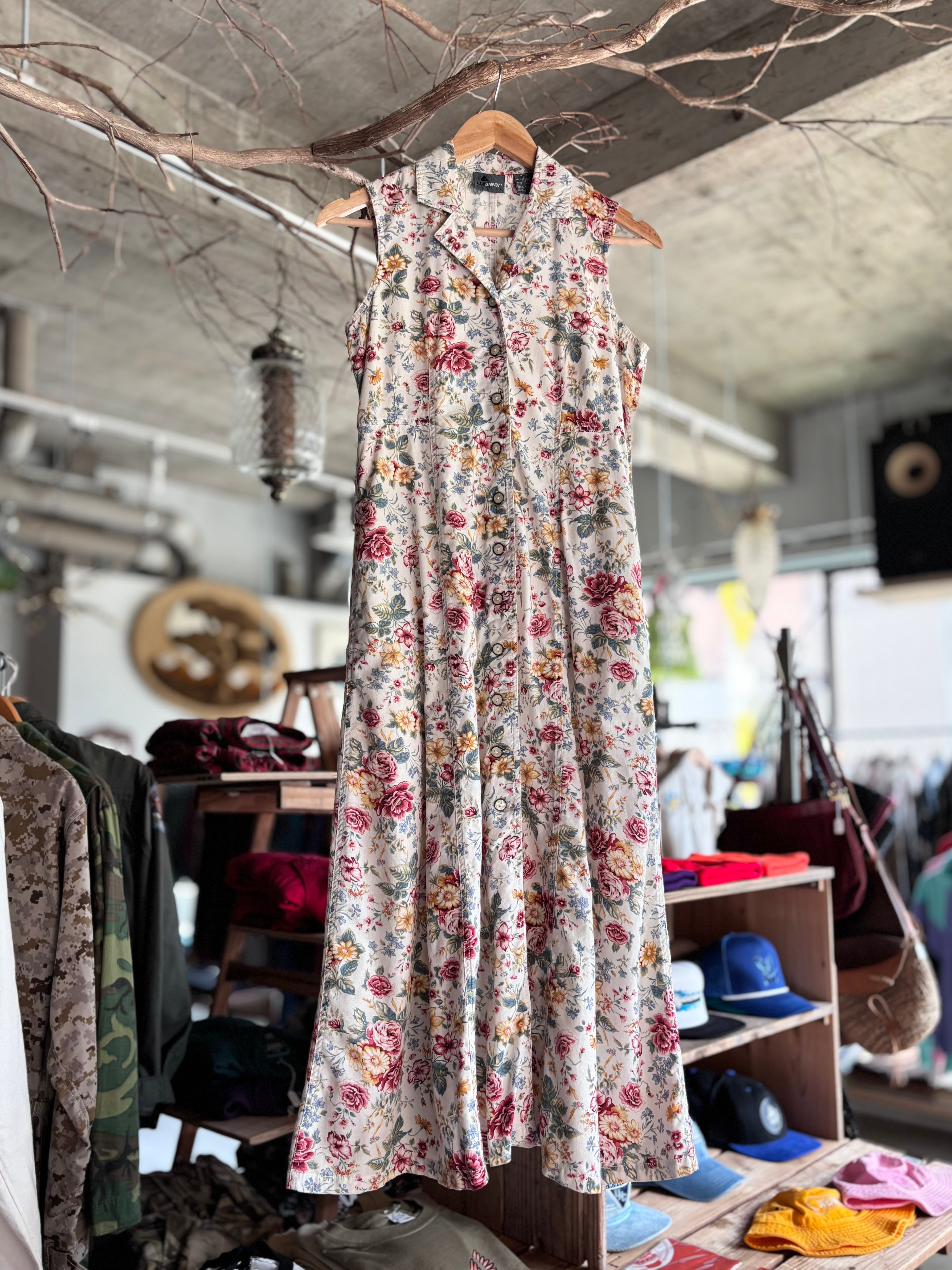 しっかりとしたコットン生地のワンピース。オープンカラー仕様。程良くゆとりのあるフィッティング。アイボリーベースに、ボタニカル柄がレトロな印象。レイヤードしがいがあるデザインで、様々な着こなしを楽しめるワンピースです。