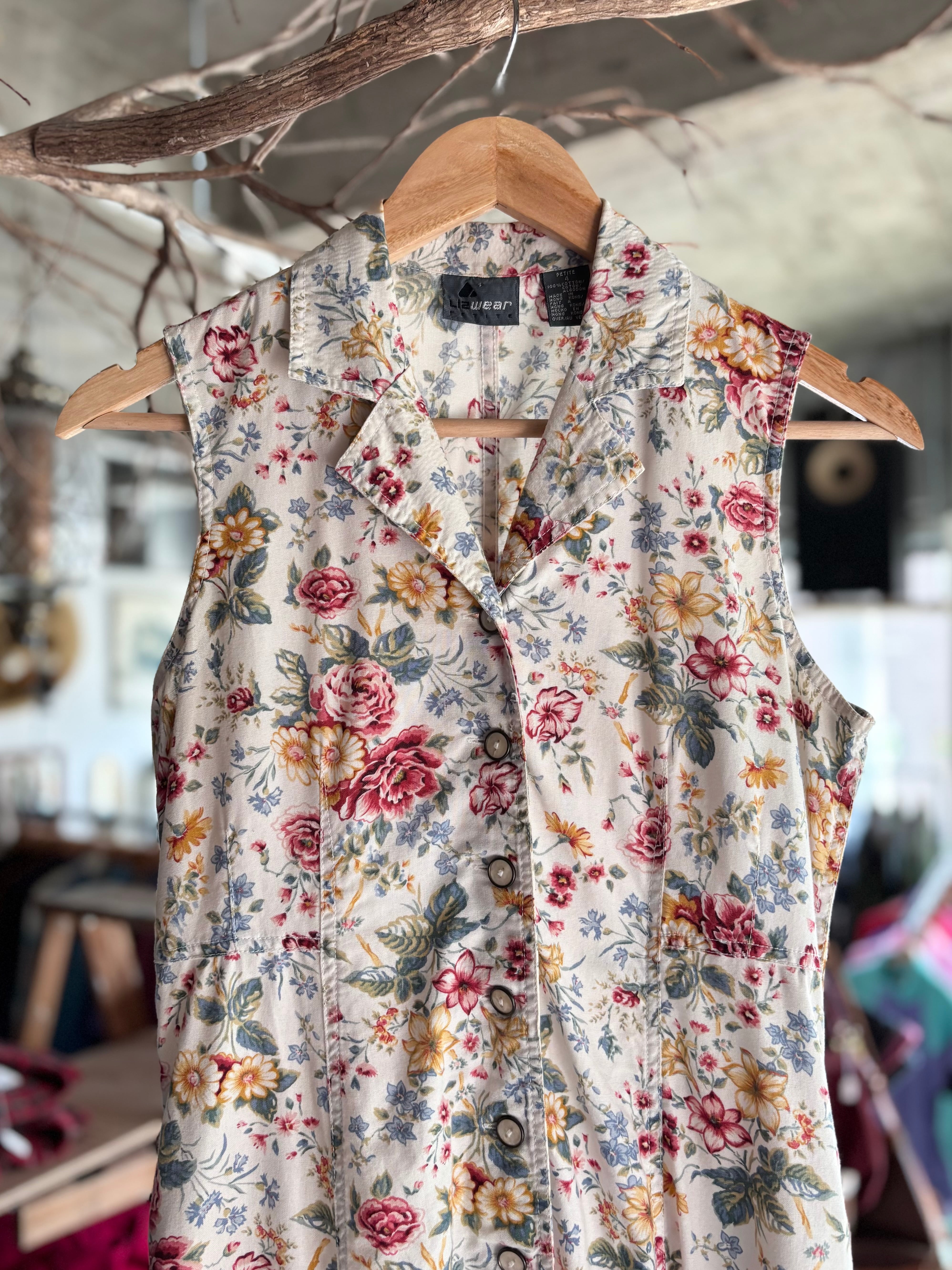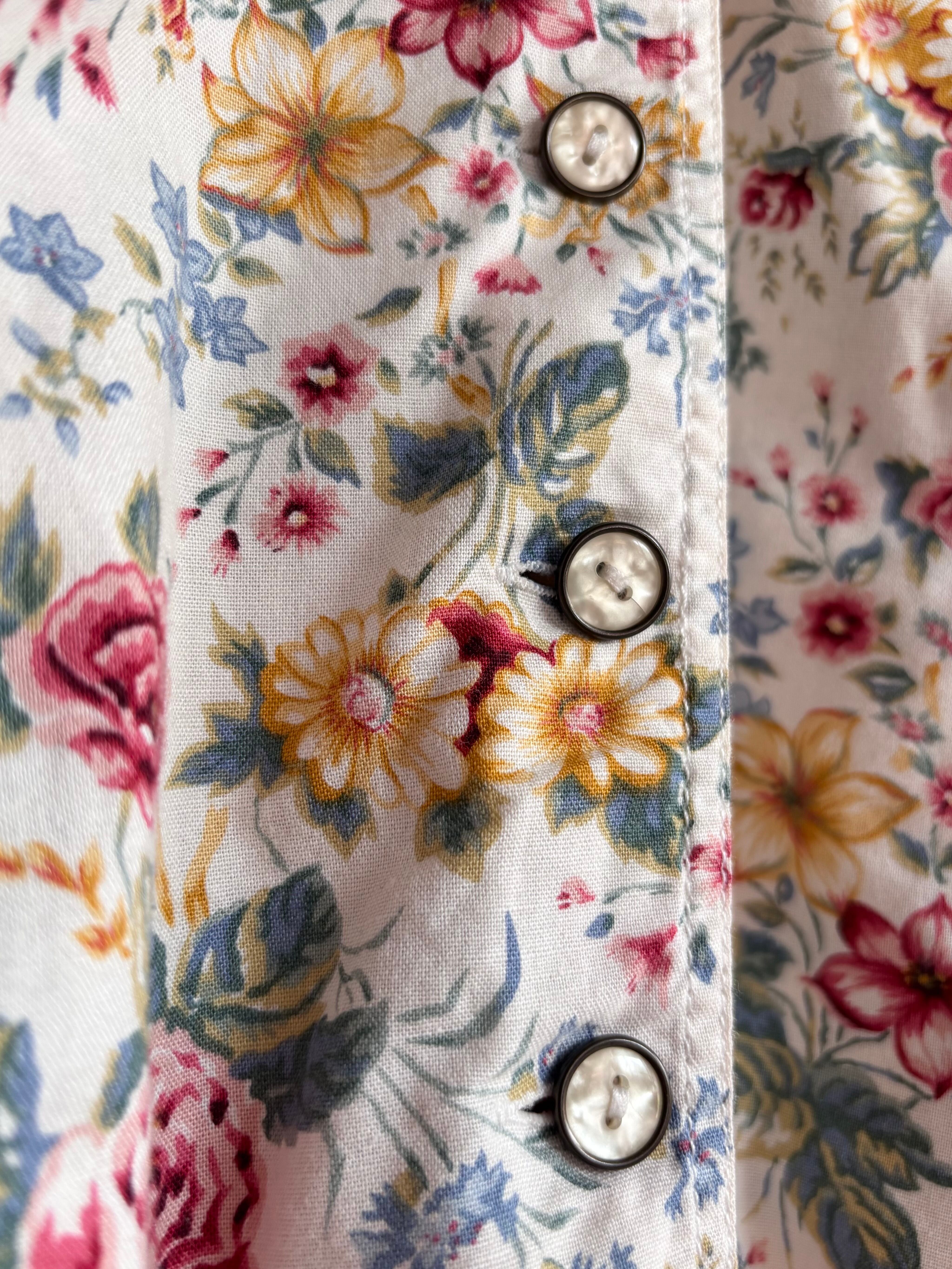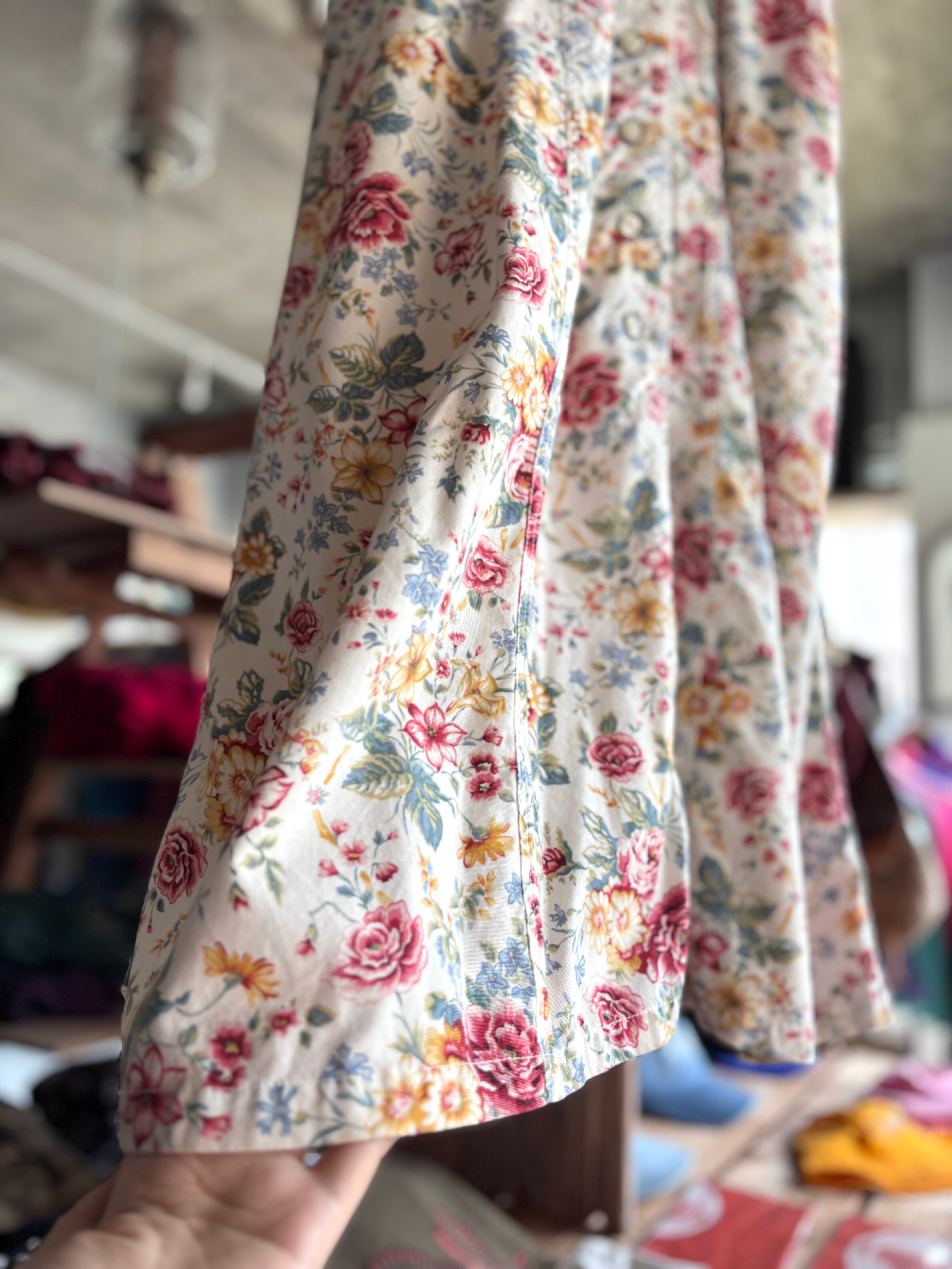 しっかりとしたコットン生地のワンピース。オープンカラー仕様。程良くゆとりのあるフィッティング。アイボリーベースに、ボタニカル柄がレトロな印象。レイヤードしがいがあるデザインで、様々な着こなしを楽しめるワンピースです。