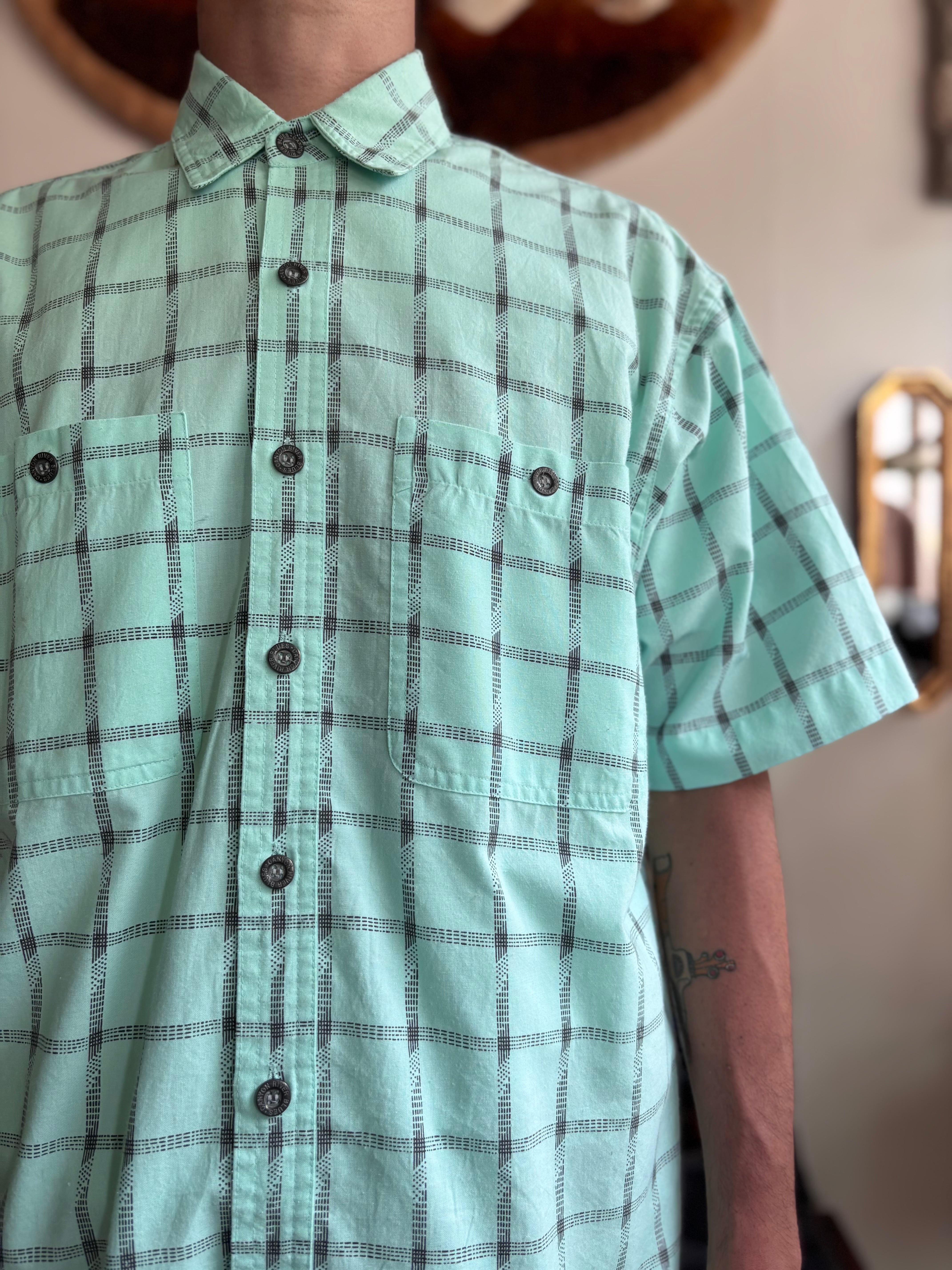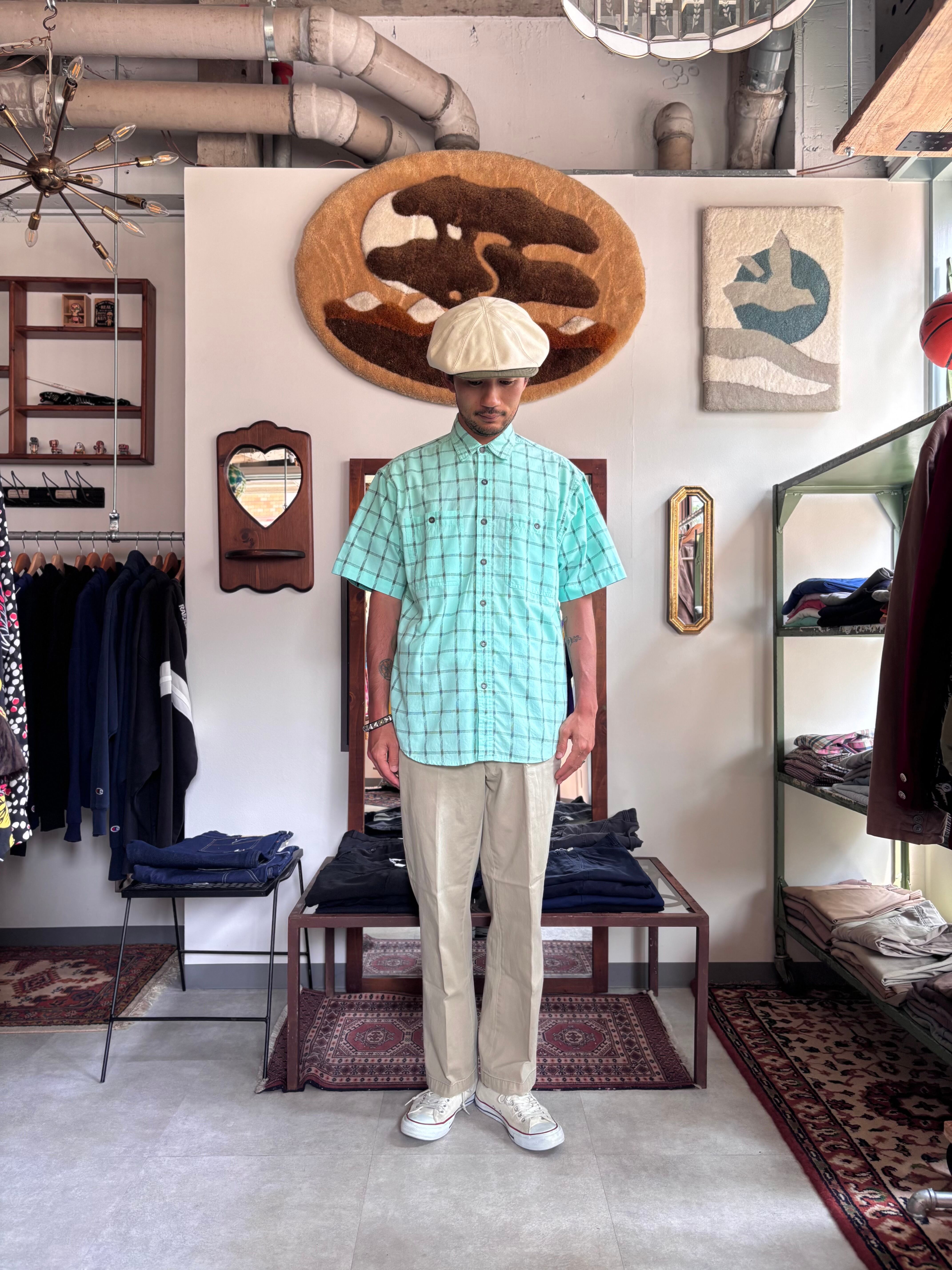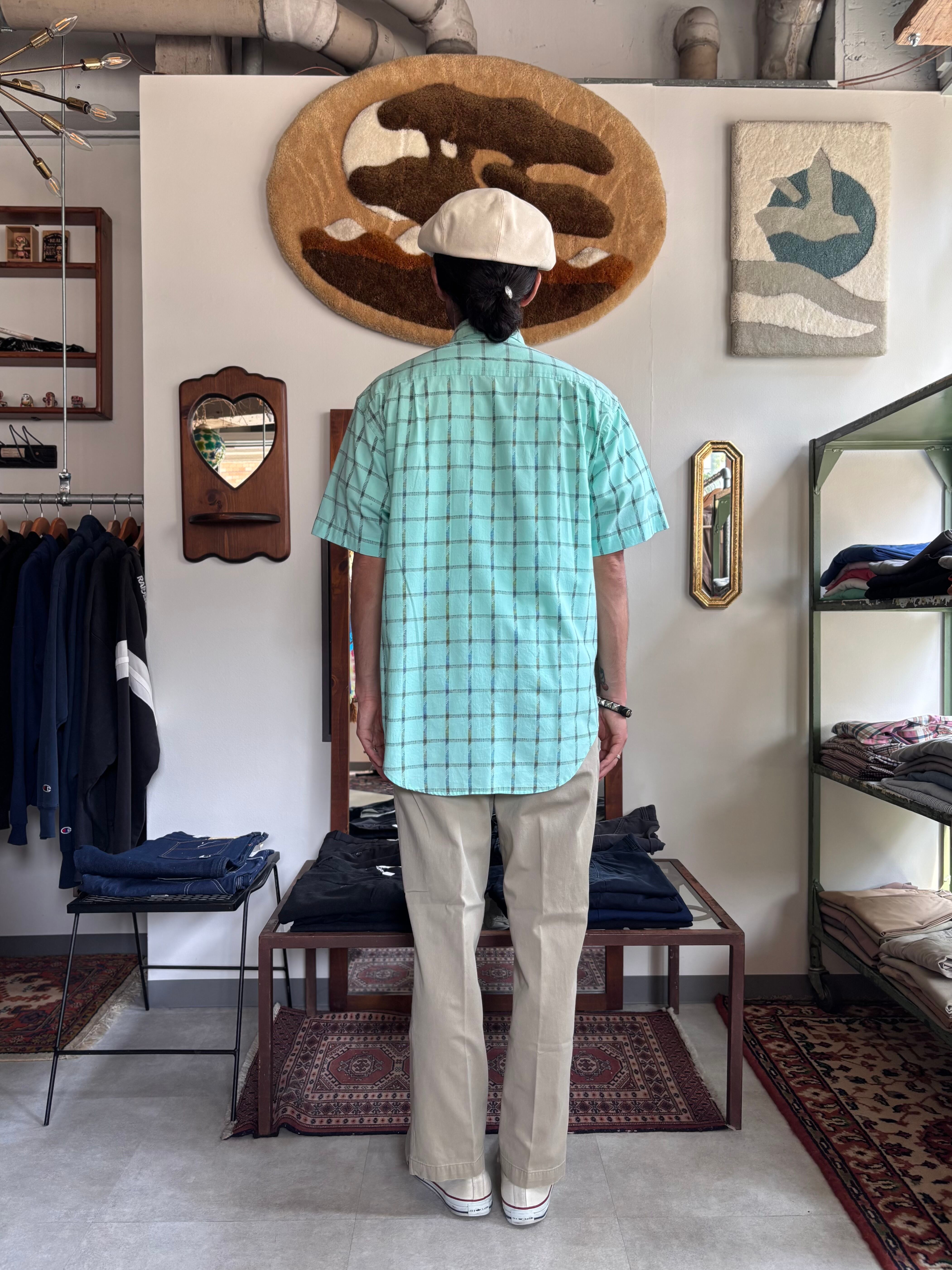 軽い着心地のコットンポリ生地。可愛さ最強チョコミントカラーのチェック。程よくゆとりのあるフィット。メタルボタン仕様。80s のノリがセンス抜群の良質レギュラーシャツ。
