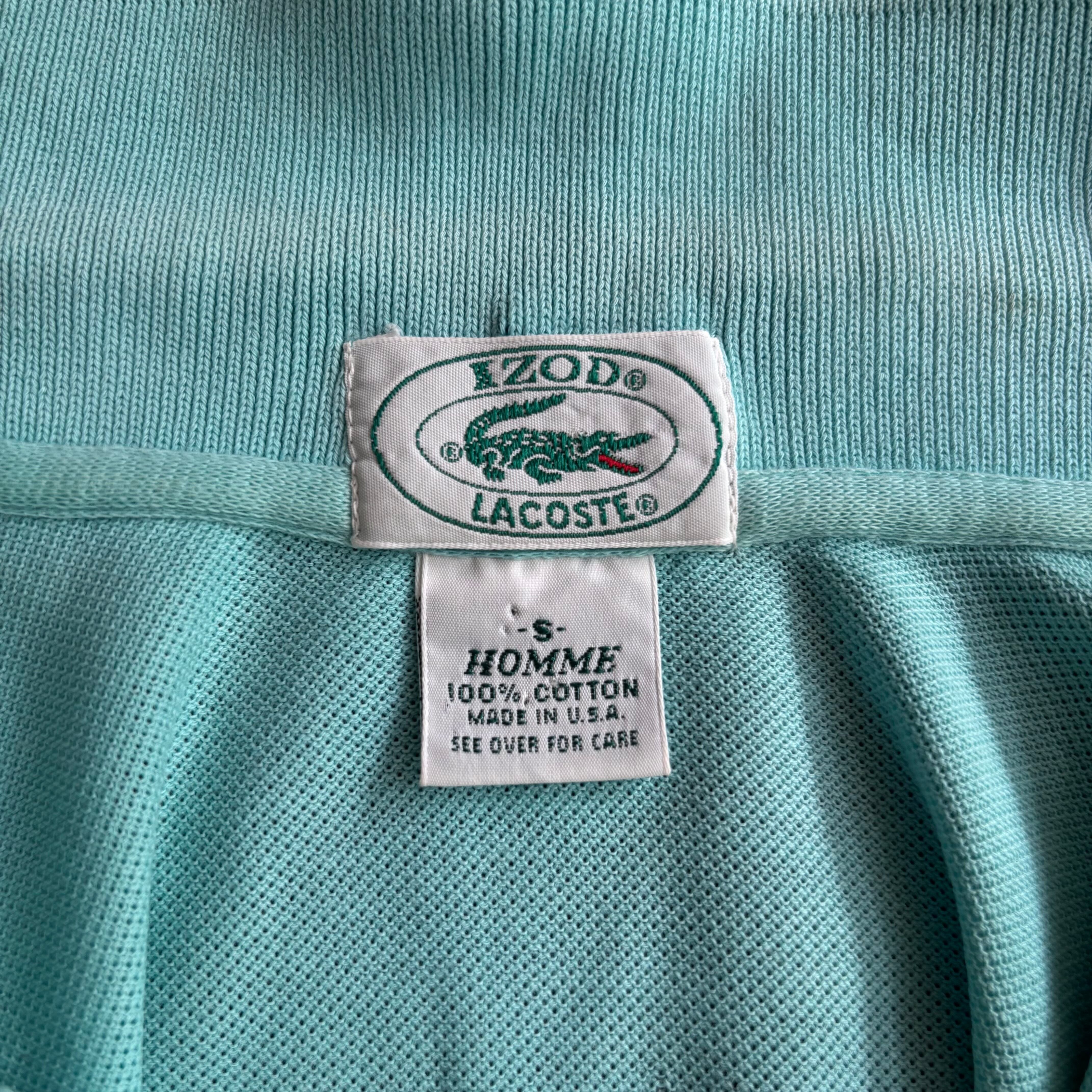 コットン鹿子素材。ティファニーブルーカラー。肩周り、アームともに細めのオーセンティックフィット。後ろの着丈が長いロングテール仕様がクラシカルさを引き立てます。90s USAメイドのIZOD LACOSTE製。